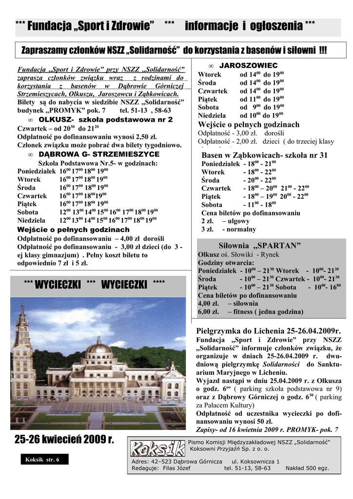 *** Fundacja ,,Sport i Zdrowie” *** informacje i ogłoszenia *** Zapraszamy członków NSZZ ,,Solidarność” do korzystania z basenów i siłowni !!! Fundacja ,,Sport i Zdrowie” przy NSZZ ,,Solidarność” zaprasza członków związku wraz z rodzinami do korzystania z basenów w Dąbrowie Górniczej Strzemieszycach, Olkuszu, Jaroszowcu i Ząbkowicach. Bilety są do nabycia w siedzibie NSZZ ,,Solidarność” budynek ,,PROMYK” pok. 7 tel. 51-13 , 58-63 • OLKUSZ- szkoła podstawowa nr 2 Czwartek – od 2030 do 2120 Odpłatność po dofinansowaniu wynosi 2,50 zł. Członek związku może pobrać dwa bilety tygodniowo. • DĄBROWA G- STRZEMIESZYCE Szkoła Podstawowa Nr.5- w godzinach: Poniedziałek 1600 1700 1800 1900 Wtorek 1600 1700 1800 1900 Środa 1600 1700 1800 1900 Czwartek 1600 1700 18001900 Piątek 1600 1700 1800 1900 Sobota 1200 1300 1400 1500 1600 1700 1800 1900 Niedziela 1200 1300 1400 1500 1600 1700 1800 1900 Wejście o pełnych godzinach Odpłatność po dofinansowaniu – 4,00 zł dorośli Odpłatność po dofinansowaniu - 3,00 zł dzieci (do 3 ej klasy gimnazjum) . Pełny koszt biletu to odpowiednio 7 zł i 5 zł. *** WYCIECZKI *** WYCIECZKI **** • JAROSZOWIEC Wtorek od 1400 do 1900 Środa od 1400 do 1900 Czwartek od 1400 do 1900 Piątek od 1100 do 1900 Sobota od 900 do 1900 Niedziela od 1000 do 1900 Wejście o pełnych godzinach Odpłatność - 3,00 zł. dorośli Odpłatność - 2,00 zł. dzieci ( do trzeciej klasy gimnazjum) Basen w Ząbkowicach- szkoła nr 31 Poniedziałek - 1800 - 2100 Wtorek - 1800 - 2200 Środa - 2000 - 2200 Czwartek - 1800 – 2000 2100 - 2200 Piątek - 1800 – 1900 2000 - 2200 Sobota - 1100 - 1800 Cena biletów po dofinansowaniu 2 zł. – ulgowy 3 zł. - normalny Siłownia ,,SPARTAN” Olkusz oś. Słowiki - Rynek Godziny otwarcia: Poniedziałek - 1000 – 2130 Wtorek - 1000- 2130 Środa - 1000 – 2130 Czwartek - 1000- 2130 Piątek - 1000 – 2130 Sobota - 1000- 1600 Cena biletów po dofinansowaniu 4,00 zł. – siłownia 6,00 zł. – fitness ( jedna godzina) Pielgrzymka do Lichenia 25-26.04.2009r. 25-26 kwiecień 2009 r. Koksik str. 6 Fundacja ,,Sport i Zdrowie” przy NSZZ ,,Solidarność” informuje członków związku, że organizuje w dniach 25-26.04.2009 r. dwudniową pielgrzymkę Solidarności do Sanktuarium Maryjnego w Licheniu. Wyjazd nastąpi w dniu 25.04.2009 r. z Olkusza o godz. 6oo ( parking szkoła podstawowa nr 9) oraz z Dąbrowy Górniczej o godz. 630 ( parking za Pałacem Kultury) Odpłatność od uczestnika wycieczki po dofinansowaniu wynosi 50 zł. Zapisy- od 16 kwietnia 2009 r. PROMYK- pok. 7 Pismo Komisji Międzyzakładowej NSZZ „Solidarność” Koksowni Przyjaźń Sp. z o. o. Adres: 42–523 Dąbrowa Górnicza ul. Koksownicza 1 Redaguje: Filas Józef tel. 51-13, 58-63 Nakład 500 egz.