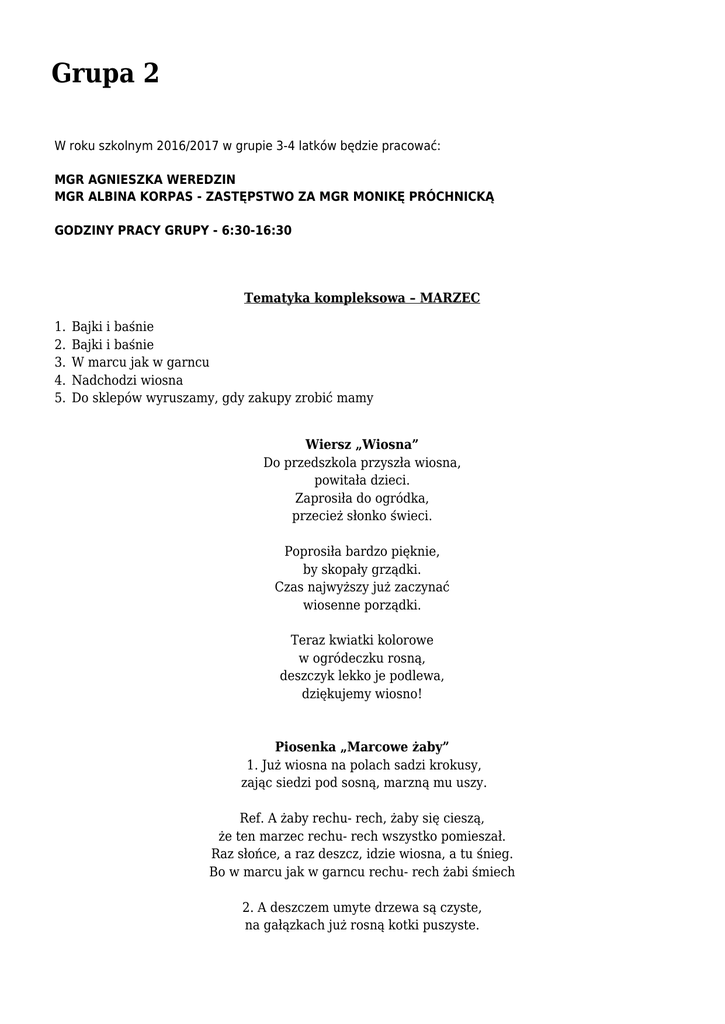 Grupa 2 W roku szkolnym 2016/2017 w grupie 3-4 latków będzie pracować: MGR AGNIESZKA WEREDZIN MGR ALBINA KORPAS - ZASTĘPSTWO ZA MGR MONIKĘ PRÓCHNICKĄ GODZINY PRACY GRUPY - 6:30-16:30 Tematyka kompleksowa – MARZEC 1. 2. 3. 4. 5. Bajki i baśnie Bajki i baśnie W marcu jak w garncu Nadchodzi wiosna Do sklepów wyruszamy, gdy zakupy zrobić mamy Wiersz „Wiosna” Do przedszkola przyszła wiosna, powitała dzieci. Zaprosiła do ogródka, przecież słonko świeci. Poprosiła bardzo pięknie, by skopały grządki. Czas najwyższy już zaczynać wiosenne porządki. Teraz kwiatki kolorowe w ogródeczku rosną, deszczyk lekko je podlewa, dziękujemy wiosno! Piosenka „Marcowe żaby” 1. Już wiosna na polach sadzi krokusy, zając siedzi pod sosną, marzną mu uszy. Ref. A żaby rechu- rech, żaby się cieszą, że ten marzec rechu- rech wszystko pomieszał. Raz słońce, a raz deszcz, idzie wiosna, a tu śnieg. Bo w marcu jak w garncu rechu- rech żabi śmiech 2. A deszczem umyte drzewa są czyste, na gałązkach już rosną kotki puszyste. Ref. A żaby… 3. Na łące bociany głośno klekocą, rankiem słońce przygrzewa, mróz mrozi nocą. Ref. A żaby…