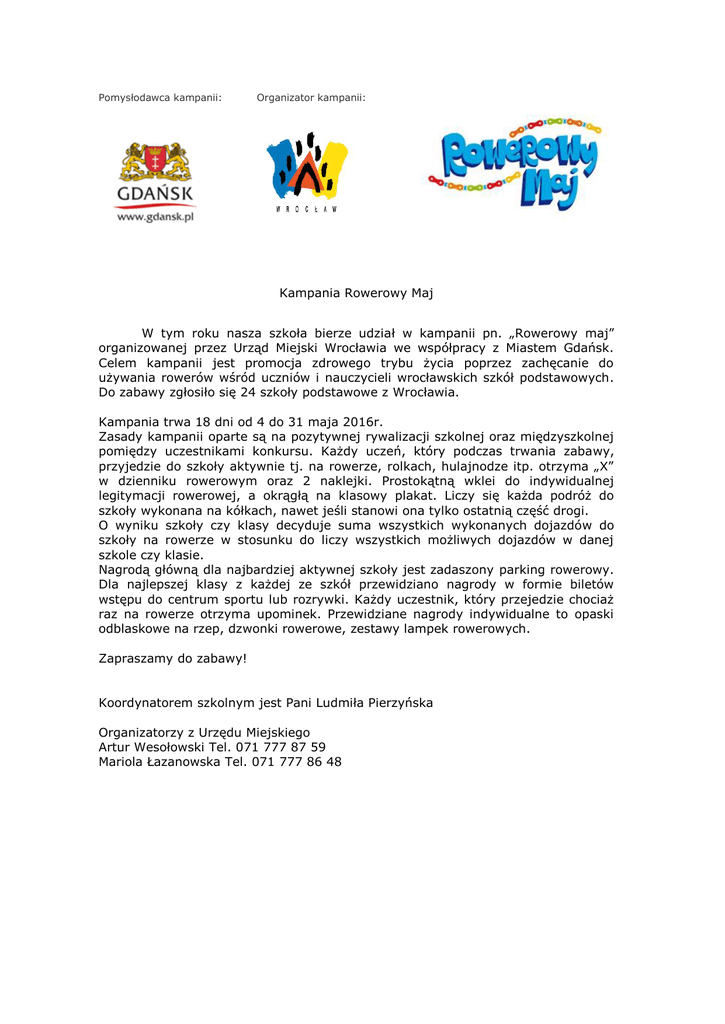 Pomysłodawca kampanii: Organizator kampanii: Kampania Rowerowy Maj W tym roku nasza szkoła bierze udział w kampanii pn. „Rowerowy maj” organizowanej przez Urząd Miejski Wrocławia we współpracy z Miastem Gdańsk. Celem kampanii jest promocja zdrowego trybu życia poprzez zachęcanie do używania rowerów wśród uczniów i nauczycieli wrocławskich szkół podstawowych. Do zabawy zgłosiło się 24 szkoły podstawowe z Wrocławia. Kampania trwa 18 dni od 4 do 31 maja 2016r. Zasady kampanii oparte są na pozytywnej rywalizacji szkolnej oraz międzyszkolnej pomiędzy uczestnikami konkursu. Każdy uczeń, który podczas trwania zabawy, przyjedzie do szkoły aktywnie tj. na rowerze, rolkach, hulajnodze itp. otrzyma „X” w dzienniku rowerowym oraz 2 naklejki. Prostokątną wklei do indywidualnej legitymacji rowerowej, a okrągłą na klasowy plakat. Liczy się każda podróż do szkoły wykonana na kółkach, nawet jeśli stanowi ona tylko ostatnią część drogi. O wyniku szkoły czy klasy decyduje suma wszystkich wykonanych dojazdów do szkoły na rowerze w stosunku do liczy wszystkich możliwych dojazdów w danej szkole czy klasie. Nagrodą główną dla najbardziej aktywnej szkoły jest zadaszony parking rowerowy. Dla najlepszej klasy z każdej ze szkół przewidziano nagrody w formie biletów wstępu do centrum sportu lub rozrywki. Każdy uczestnik, który przejedzie chociaż raz na rowerze otrzyma upominek. Przewidziane nagrody indywidualne to opaski odblaskowe na rzep, dzwonki rowerowe, zestawy lampek rowerowych. Zapraszamy do zabawy! Koordynatorem szkolnym jest Pani Ludmiła Pierzyńska Organizatorzy z Urzędu Miejskiego Artur Wesołowski Tel. 071 777 87 59 Mariola Łazanowska Tel. 071 777 86 48