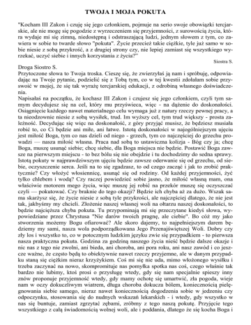 TWOJA I MOJA POKUTA "Kocham III Zakon i czuję się jego członkiem, pojmuje na serio swoje obowiązki tercjarskie, ale nie mogę się pogodzie z wyrzeczeniem się przyjemności, z surowością życia, która wydaje mi się zimną, niedostępną i odstraszającą ludzi, jednym słowem z tym, co zawiera w sobie to twarde słowo "pokuta". Życie przecież takie ciężkie, tyle już samo w sobie niesie z sobą przykrość, a z drugiej strony czy, nie lepiej zamiast się wszystkiego wyrzekać, uczyć siebie i innych korzystania z życia?” Siostra S. Droga Siostro S. Przytoczone słowa to Twoja troska. Cieszę się, że zwierzyłaś ją nam i spróbuję, odpowiadając na Twoje pytanie, podzielić się z Tobą tym, co w tej kwestii zdołałam sobie przyswoić w mojej, że się tak wyrażę tercjarskiej edukacji, z odrobiną własnego doświadczenia. Napisałaś na początku, że kochasz III Zakon i czujesz się jego członkiem, czyli tym samym decydujesz się na cel, który mu przyświeca, więc - na dążenie do doskonałości. Osiągnięcie każdego nawet materialnego celu wymaga już z natury rzeczy pewnej pracy, a ta nieodzownie niesie z sobą wysiłek, trud. Im wyższy cel, tym trud większy - prosta zależność. Decydując się więc na doskonałość, z góry przyjąć musisz, że będziesz musiała robić to, co Ci będzie ani miłe, ani łatwe. Istotą doskonałości w najogólniejszym ujęciu jest miłość Boga, tym co nas dzieli od niego - grzech, tym co najczęściej do grzechu prowadzi — nasza miłość własna. Praca nad sobą to ustawiczna kolizja - Bóg czy ja; chcę Boga, muszę usunąć siebie; chcę siebie, dla Boga miejsca nie będzie. Postawić Boga zawsze na pierwszym miejscu - to bez bólu się nie obejdzie i tu dochodzimy do sedna sprawy. Istotą pokuty w najprawdziwszym ujęciu będzie zawsze oderwanie się od grzechu, od siebie, oczyszczenie serca. Jeśli na to się zgadzasz, to od czego zacząć i jak to zrobić praktycznie? Czy włożyć włosiennicę, usunąć się od rodziny. Od każdej przyjemności, żyć tylko chlebem i wodą? Czy raczej powiedzieć sobie jasno, że miłość własną mam, ona właściwie motorem mego życia, więc muszę jej robić na przekór muszę się oczyszczać czyli — pokutować. Czy braknie do tego okazji? Będzie ich chyba aż za dużo. Wszak sama skarżysz się, że życie niesie z sobą tyle przykrości, ale najczęściej dlatego, że nie jest tak, jakbyśmy my chcieli. Złożenie naszej własnej woli na ołtarzu naszej doskonałości, to będzie najcięższa chyba pokuta. Tu przypominają mi się przeczytane kiedyś słowa, wypowiedziane przez Chrystusa "Nie darów twoich pragnę, ale ciebie". Bo cóż my jako stworzenia możemy Bogu ofiarować? Ale skoro dajemy, to najpełniejszym darem będziemy my sami, nasza wola podporządkowana Jego Przenajświętszej Woli. Dobry czy zły los i wszystko to, co w potocznym ludzkim języku zwie się przypadkiem - to pierwsza nasza praktyczna pokuta. Godzina za godziną naszego życia nieść będzie dalsze okazje i nic nas z tego nie zwolni, ani bieda, ani choroba, ani pora roku, ani nasz zawód i co jeszcze ważne, że często będą to obiektywnie nawet rzeczy przyjemne, ale w danym przypadku staną się ciężkim nieraz krzyżykiem. Coś mi się nie uda, mimo włożonego wysiłku i trzeba zaczynać na nowo, skompromituje nas pomyłka spotka nas coś, czego właśnie tak bardzo nie lubimy, ktoś prosi o przysługę wtedy, gdy się nam specjalnie spieszy inny znów proponuje przyjemność wtedy, gdy mamy ochotę się umartwić, zła pogoda, wieje nam w oczy dokuczliwym wiatrem, długa choroba dokucza bólem, koniecznością pielęgnowania siebie samego, nieraz nawet koniecznością dogodzenia sobie w jedzeniu czy odpoczynku, stosowania się do nudnych wskazań lekarskich - i wtedy, gdy wszystko w nas się buntuje, zamiast zgrzytać zębami, zróbmy z tego naszą pokutę. Przyjęcie tego wszystkiego z całą świadomością wolnej woli, ale i poddania, dlatego że się kocha Boga i by jeszcze goręcej Go ukochać, "będzie na pewno nie mniejszym czynem niż włożenie włosienny, pewnie, że także nie słodkiej ale wybranej przez nas, podczas gdy wobec tamtych faktów jesteśmy bezsilni i musimy się nimi godzić Bo "nie darów twoich, ale ciebie pragnę" Czy tak, czy tak, musimy te przykrości znieść, choćby nie wiem jak to dla nas było gorzkie, a nie wykorzystane pomniejszają nasze duchowe kapitały, odbierają energię, przepadają na zawsze, wykorzystane stają się w naszych rękach tym cudownym rylcem, który pomoże nam nie tylko wykuć, ale wycyzelować to najpiękniejsze dzieło naszego tercjarskiego życia - piękny Boży charakter - świętość. Taka pokuta stanie się celem nie samym w sobie, ale środkiem do wypracowania każdej cnoty w nas, do uczynienia z nas ludzi normalnych, z którymi każdemu będzie dobrze, ludzi zdolnych do poświęcenia, bo zmagających się a miłością własną, ludzi pełnych, a tylko przez nich droga do świętych. I dopiero jeśli te drobne, a tak dokuczliwe nieraz przygody potrafimy znosić ofiarnie dla Boga, jakieś inne umartwienia większe, podejmowane koniecznie jako środek a nie cel, będą miały rację bytu. A ponieważ nie zawsze będzie nam wolno z nich korzystać, te pierwsze, które zawsze, mieć będziemy pod ręką, będą istotne. Niemniej jednak umartwienie tego rodzaju, jak post zachowany według przykazań cały ten niewielki według naszej reguły wykonane w duchu wiernego poddania się Kościołowi, spełni ten sam cel. I jeszcze jedno. Nasza pokuta koniecznie winna być pogodna, byśmy nie zwracali na siebie uwagi i nie odstraszali ludzi swoim postępowaniem wszak "Pan Bóg kocha wesołego dawcę" (św. Paweł). Ułatwi nam to także, że się tak wyrażę "ukrycie" naszej pokuty. Bóg tylko będzie świadkiem, ile nas nieraz to czy owo będzie kosztowało. Nareszcie umartwienie jest konieczne, bo łączy się śc