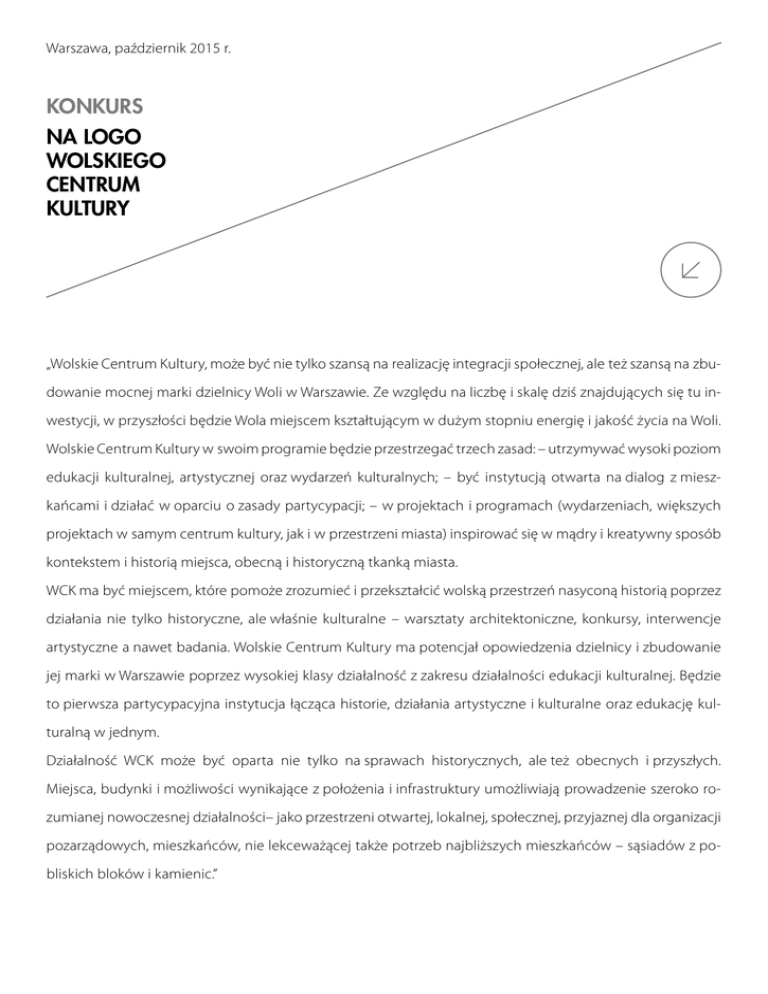 Warszawa, październik 2015 r. KONKURS NA LOGO WOLSKIEGO CENTRUM KULTURY „Wolskie Centrum Kultury, może być nie tylko szansą na realizację integracji społecznej, ale też szansą na zbudowanie mocnej marki dzielnicy Woli w Warszawie. Ze względu na liczbę i skalę dziś znajdujących się tu inwestycji, w przyszłości będzie Wola miejscem kształtującym w dużym stopniu energię i jakość życia na Woli. Wolskie Centrum Kultury w swoim programie będzie przestrzegać trzech zasad: – utrzymywać wysoki poziom edukacji kulturalnej, artystycznej oraz wydarzeń kulturalnych; – być instytucją otwarta na dialog z mieszkańcami i działać w oparciu o zasady partycypacji; – w projektach i programach (wydarzeniach, większych projektach w samym centrum kultury, jak i w przestrzeni miasta) inspirować się w mądry i kreatywny sposób kontekstem i historią miejsca, obecną i historyczną tkanką miasta. WCK ma być miejscem, które pomoże zrozumieć i przekształcić wolską przestrzeń nasyconą historią poprzez działania nie tylko historyczne, ale właśnie kulturalne – warsztaty architektoniczne, konkursy, interwencje artystyczne a nawet badania. Wolskie Centrum Kultury ma potencjał opowiedzenia dzielnicy i zbudowanie jej marki w Warszawie poprzez wysokiej klasy działalność z zakresu działalności edukacji kulturalnej. Będzie to pierwsza partycypacyjna instytucja łącząca historie, działania artystyczne i kulturalne oraz edukację kulturalną w jednym. Działalność WCK może być oparta nie tylko na sprawach historycznych, ale też obecnych i przyszłych. Miejsca, budynki i możliwości wynikające z położenia i infrastruktury umożliwiają prowadzenie szeroko rozumianej nowoczesnej działalności– jako przestrzeni otwartej, lokalnej, społecznej, przyjaznej dla organizacji pozarządowych, mieszkańców, nie lekceważącej także potrzeb najbliższych mieszkańców – sąsiadów z pobliskich bloków i kamienic.” REGULAMIN KONKURSU NA LOGO WOLSKIEGO CENTRUM KULTURY §1. ORGANIZATOR KONKURSU Organizatorem konkursu jest Wolskie Centrum Kultury w Warszawie §2. TERMINY Termin ogłoszenia konkursu następuje 23 października 2015 r. Termin dostarczenia prac konkursowych mija 20 listopada 2015 r. Posiedzenie komisji konkursowej odbędzie się do 30 listopada 2015 r. Ogłoszenie wyników nastąpi nie później niż w ciągu 14 dni od dnia posiedzenia komisji na stronie internetowej www.wck-wola.pl §3. CEL KONKURSU Celem konkursu jest wyłonienie najlepszego znaku graficznego (logo), który będzie wykorzystywany w komunikacji wizualnej Wolskiego Centrum Kultury i umieszczany na szeroko rozumianych materiałach informacyjnych, promocyjnych, popularyzatorskich, takich jak m.in. plakaty, foldery, billboardy, postery, roll-upy, prezentacje, serwisy internetowe oraz na innych materiałach przygotowywanych, wydawanych bądź zlecanych przez Wolskie Centrum Kultury. §POŻĄDANE WALORY ESTETYCZNE LOGOTYPU – skalowalny – nowoczesny – kompaktowy – minimalistyczny – charakterystyczny i niepowtarzalny – czysty kompozycyjnie – stonowany typograficznie (preferowane jednoelementowe typy fontów, np. grotesk itp.) §SŁOWA KLUCZE, JAKO CECHY POWIĄZANE Z PROJEKTEM ZNAKU – integracja – wielokulturowość – kreatywność – synergia §4. WARUNKI UCZESTNICTWA 1. Konkurs ma charakter otwarty. Uczestnikiem Konkursu może być każda osoba fizyczna (pełnoletnia) bądź prawna, która zapoznała się z niniejszym Regulaminem i akceptuje jego postanowienia. W Konkursie nie mogą brać udziału członkowie komisji konkursowej oraz ich najbliższe rodziny. Przez najbliższą rodzinę rozumie się małżonka, zstępnych, wstępnych oraz rodzeństwo. 2. W konkursie mogą uczestniczyć autorzy prac indywidualnie lub zespołowo. Nagroda przyznana zespołowi autorów jest traktowana jako jedna. W przypadku zespołu projektowego należy jednoznacznie wskazać przewodniczącego grupy, który będzie jej reprezentantem i któremu w przypadku wygranej zostanie wypłacona nagroda. 3. Każdy uczestnik może złożyć do 3 projektów. Każdą pracę należy złożyć pojedynczo w osobnej kopercie A4 opatrzonej indywidualnym godłem (np.: imieniem i nazwiskiem, pseudonimem). 4. Przystąpienie do Konkursu polega na przesłaniu lub dostarczeniu: • projektu znaku graficznego (logo) w formie opisanej poniżej w punktach 6-8 w zamkniętej kopercie A4 opatrzonej godłem. • wypełnionej karty zgłoszenia z własnoręcznym podpisem w osobnej kopercie A5, opatrzonej takim samym godłem. 5. Projekt znaku graficznego wraz z kartą zgłoszenia należy przesłać lub dostarczyć na adres: Wolskie Centrum Kultury, ul. Działdowska 6, 01-184 Warszawa z dopiskiem „KONKURS NA LOGO WCK”, w terminie do 20 listopada 2015 r. Decyduje data przyjęcia pracy konkursowej przez adresata. Uwaga: projekty przesłane po tym terminie nie będą rozpatrywane przez Komisję Konkursową. Organizator Konkursu nie ponosi odpowiedzialności za ewentualne zaginięcie, uszkodzenie projektu powstałe podczas przesyłki. 6. Projekty powinny być przekazane w formie elektronicznej wykonane techniką wektorową w formacie PDF (w przestrzeni CMYK na płycie CD lub DVD) oraz w wersji papierowej (format wydruku A4). Wydruki prac konkursowych należy przesłać w następującej postaci: projekt znaku wydrukowany w kolorze na białym arkuszu formatu A4 w optymalnej wielkości w zestawieniu z najmniejszą – możliwie czytelną jego wersją – oraz w wersji achromatycznej i kontrze w analogicznych proporcjach. 7. Uczestnicy Konkursu wyrażają zgodę na przetwarzanie ich danych osobowych zgodnie z ustawą z dnia 29 sierpnia 1997 r. o ochronie danych osobowych (Dz. U. Nr 133, poz. 833 z późn. zm.) dla potrzeb konkursu. 8. Wszelkie koszty związane z uczestnictwem w konkursie oraz przygotowanie projektu logo ponosi uczestnik konkursu. 9. Podpisana Karta zgłoszenia jest potwierdzeniem zapoznania się z regula