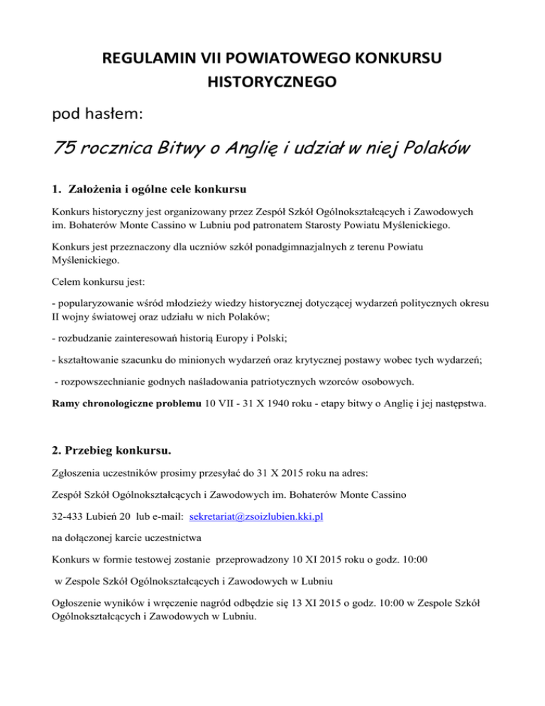 REGULAMIN VII POWIATOWEGO KONKURSU HISTORYCZNEGO pod hasłem: 75 rocznica Bitwy o Anglię i udział w niej Polaków 1. Założenia i ogólne cele konkursu Konkurs historyczny jest organizowany przez Zespół Szkół Ogólnokształcących i Zawodowych im. Bohaterów Monte Cassino w Lubniu pod patronatem Starosty Powiatu Myślenickiego. Konkurs jest przeznaczony dla uczniów szkół ponadgimnazjalnych z terenu Powiatu Myślenickiego. Celem konkursu jest: - popularyzowanie wśród młodzieży wiedzy historycznej dotyczącej wydarzeń politycznych okresu II wojny światowej oraz udziału w nich Polaków; - rozbudzanie zainteresowań historią Europy i Polski; - kształtowanie szacunku do minionych wydarzeń oraz krytycznej postawy wobec tych wydarzeń; - rozpowszechnianie godnych naśladowania patriotycznych wzorców osobowych. Ramy chronologiczne problemu 10 VII - 31 X 1940 roku - etapy bitwy o Anglię i jej następstwa. 2. Przebieg konkursu. Zgłoszenia uczestników prosimy przesyłać do 31 X 2015 roku na adres: Zespół Szkół Ogólnokształcących i Zawodowych im. Bohaterów Monte Cassino 32-433 Lubień 20 lub e-mail: [email protected] na dołączonej karcie uczestnictwa Konkurs w formie testowej zostanie przeprowadzony 10 XI 2015 roku o godz. 10:00 w Zespole Szkół Ogólnokształcących i Zawodowych w Lubniu Ogłoszenie wyników i wręczenie nagród odbędzie się 13 XI 2015 o godz. 10:00 w Zespole Szkół Ogólnokształcących i Zawodowych w Lubniu. 3. Literatura Fiedler A. , Dywizjon 303, wyd. dowolne Jokiel J. , Udział Polaków w Bitwie o Anglię, Warszawa 1968 Macdonald J. , Wielkie bitwy II wojny światowej, Warszawa 1998 ( s. 20-31) Sommerville D., Kronika II wojny światowej, [ Kraków]1995 ( s. 48-58) Gazety wojenne nr 15. , Bitwa o Anglię , red. nacz. Jaroszek Dariusz Oblicza wojny nr 4., Bitwa o Anglię , red. nacz. Annable Martin Historia II wojny światowej ,Bitwa o Anglię – osamotniona wyspa V 1940-V 1941, płyta DVD Literatura historyczna ogólnodostępna ( encyklopedie, słowniki, vademecum…) Podręczniki historii Wiadomości dostępne w Internecie KARTA UCZESTNICTWA VII POWIATOWY KONKURS HISTORYCZNY 75 rocznica bitwy o Anglię i udział w niej Polaków Nazwa i adres szkoły ………………………………………………………………………………………………… ………………………………………………………………………………………………… …………………………………………………………………………………………………. Zgłoszeni uczniowie ………………………………………………………………………………………………… ………………………………………………………………………………………………… ………………………………………………………………………………………………… ………………………………………………………………………………………………… …………………………………………………………………………………………………. Nazwiska opiekunów ………………………………………………………………………………………………… ………………………………………………………………………………………………….. Dyrektor szkoły ………………………