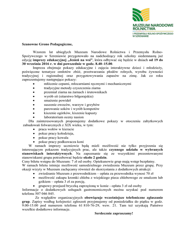 Szanowne Grono Pedagogiczne, Wzorem lat ubiegłych Muzeum Narodowe Rolnictwa i Przemysłu RolnoSpożywczego w Szreniawie przygotowało na nadchodzący rok szkolny siedemnastą już edycję imprezy edukacyjnej „Jesień na wsi”, która odbywać się będzie w dniach od 19 do 30 września 2016 r. w dni powszednie w godz. 8.40–15.00. Impreza obejmuje pokazy edukacyjne i zajęcia interaktywne dzieci i młodzieży, poświęcone tematyce omłotów zbóż, przetwarzania płodów rolnych, wyrobu żywności tradycyjnej i regionalnej oraz przygotowywania zapasów na zimę. Jak co roku zaprezentujemy następujące pokazy:  młócenie cepami, młocarniami ręcznymi i mechanicznymi  tradycyjne metody czyszczenia ziarna  przemiał ziarna na żarnach i śrutownikach  wyrób sit (sitarstwo biłgorajskie)  smażenie powideł  suszenie owoców, warzyw i grzybów  parowanie soków i wyrób kompotów  kiszenie ogórków, kiszenie kapusty  laboratorium oceny nasion Dla zainteresowanych proponujemy dodatkowe pokazy w otoczeniu zabytkowych zabudowań folwarcznych z XIX wieku, w tym:  praca wołów w kieracie  pokaz pracy kołodzieja,  pokaz pracy kowala  pokaz pracy podkuwacza koni W ramach imprezy uczniowie będą mieli możliwość nie tylko przyjrzenia się interesującym pokazom tradycyjnych prac, ale także czynnego udziału w wybranych stanowiskach interaktywnych. Na zapoznanie się ze wszystkimi prezentowanymi stanowiskami grupa potrzebować będzie około 2 godzin. Ceny biletu wstępu do Muzeum: 7 zł od osoby. Opiekunowie grup mają wstęp bezpłatny. W ramach biletu istnieje możliwość samodzielnego zwiedzenia Muzeum przez grupę. Przy okazji wizyty w Muzeum zachęcamy również do skorzystania z dodatkowych atrakcji:  zwiedzanie Muzeum z przewodnikiem – opłata za przewodnika wynosi 70 zł  możliwość zakupu kromki chleba z wiejskiego pieca chlebowego ze smalcem lub gzikiem – opłata 3 zł za porcję,  grupowy przejazd bryczką zaprzężoną w konie - opłata 3 zł od osoby Informacje o dodatkowych usługach gastronomicznych można uzyskać pod numerem telefonu 507 046 845. Ze względów organizacyjnych obowiązuje wcześniejsze telefoniczne zgłaszanie grup. Zapisy według kolejności zgłoszeń przyjmujemy od poniedziałku do piątku w godz. 9.00-15.00 pod numerem telefonu 61 810-76-29, wew. 21. Tam też uzyskają Państwo wszelkie dodatkowe informacje. Serdecznie zapraszamy!
