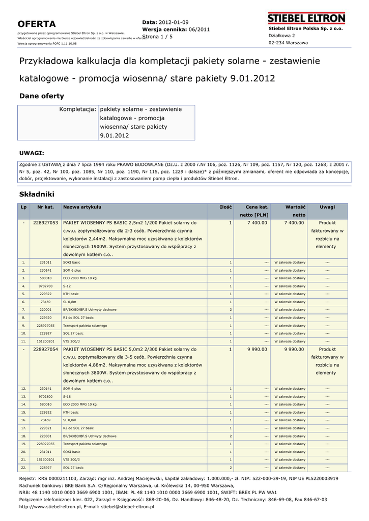 OFERTA Data: 2012-01-09 Wersja cennika: 06/2011 przygotowana przez oprogramowanie Stiebel Eltron Sp. z o.o. w Warszawie. Strona 1 / 5 Właściciel oprogramowania nie bierze odpowiedzialności za zobowiązania zawarte w ofercie. Stiebel Eltron Polska Sp. z o.o. Działkowa 2 02-234 Warszawa Wersja oprogramowania POPC 1.11.10.08 Przykładowa kalkulacja dla kompletacji pakiety solarne - zestawienie katalogowe - promocja wiosenna/ stare pakiety 9.01.2012 Dane oferty Kompletacja: pakiety solarne - zestawienie katalogowe - promocja wiosenna/ stare pakiety 9.01.2012 UWAGI: Zgodnie z USTAWĄ z dnia 7 lipca 1994 roku PRAWO BUDOWLANE (Dz.U. z 2000 r.Nr 106, poz. 1126, Nr 109, poz. 1157, Nr 120, poz. 1268; z 2001 r. Nr 5, poz. 42, Nr 100, poz. 1085, Nr 110, poz. 1190, Nr 115, poz. 1229 i dalsze)* z późniejszymi zmianami, oferent nie odpowiada za koncepcje, dobór, projektowanie, wykonanie instalacji z zastosowaniem pomp ciepła i produktów Stiebel Eltron. Składniki Lp - Nr kat. 228927053 Nazwa artykułu PAKIET WIOSENNY PS BASIC 2,5m2 1/200 Pakiet solarny do Ilość 1 Cena kat. Wartość netto [PLN] netto 7 400.00 7 400.00 c.w.u. zoptymalizowany dla 2-3 osób. Powierzchnia czynna Uwagi Produkt fakturowany w kolektorów 2,44m2. Maksymalna moc uzyskiwana z kolektorów rozbiciu na słonecznych 1900W. System przystosowany do współpracy z elementy dowolnym kotłem c.o.. 1. 231011 SOKI basic 1 --- W zakresie dostawy --- 2. 230141 SOM 6 plus 1 --- W zakresie dostawy --- 3. 580010 ECO 2000 MPG 10 kg 1 --- W zakresie dostawy --- 4. 9702700 S-12 1 --- W zakresie dostawy --- 5. 229322 KTH basic 1 --- W zakresie dostawy --- 6. 73469 SL 0,8m 1 --- W zakresie dostawy --- 7. 220001 BP/BK/BD/BF.S Uchwyty dachowe 2 --- W zakresie dostawy --- 8. 229320 R1 do SOL 27 basic 1 --- W zakresie dostawy --- Transport pakietu solarnego 1 --- W zakresie dostawy --- SOL 27 basic 1 --- W zakresie dostawy --- VTS 200/3 1 --- W zakresie dostawy PAKIET WIOSENNY PS BASIC 5,0m2 2/300 Pakiet solarny do 1 9. 228927055 10. 228927 11. 151200201 - 228927054 9 990.00 9 990.00 c.w.u. zoptymalizowany dla 3-5 osób. Powierzchnia czynna --- Produkt fakturowany w kolektorów 4,88m2. Maksymalna moc uzyskiwana z kolektorów rozbiciu na słonecznych 3800W. System przystosowany do współpracy z elementy dowolnym kotłem c.o.. 12. 230141 13. 9702800 SOM 6 plus 1 --- W zakresie dostawy --- S-18 1 --- W zakresie dostawy 14. --- 580010 ECO 2000 MPG 10 kg 1 --- W zakresie dostawy --- 15. 229322 KTH basic 1 --- W zakresie dostawy --- 16. 73469 SL 0,8m 1 --- W zakresie dostawy --- 17. 229321 R2 do SOL 27 basic 1 --- W zakresie dostawy --- 18. 220001 BP/BK/BD/BF.S Uchwyty dachowe 2 --- W zakresie dostawy --- 19. 228927055 Transport pakietu solarnego 1 --- W zakresie dostawy --- 20. 231011 SOKI basic 1 --- W zakresie dostawy --- 21. 151300201 VTS 300/3 1 --- W zakresie dostawy --- 22. 228927 SOL 27 basic 2 --- W zakresie dostawy --- Rejestr: KRS 0000211103, Zarząd: mgr inż. Andrzej Maciejewski, kapitał zakładowy: 1.000.000,- zł. NIP: 522-000-39-19, NIP UE PL5220003919 Rachunek bankowy: BRE Bank S.A. O/Regionalny Warszawa, ul. Królewska 14, 00-950 Warszawa, NRB: 48 1140 1010 0000 3669 6900 1001, IBAN: PL 48 1140 1010 0000 3669 6900 1001, SWIFT: BREX PL PW WA1 Połączenie telefoniczne: kier. 022, Zarząd + Księgowość: 868-20-06, Dz. Handlowy: 846-48-20, Dz. Techniczny: 846-69-08, Fax 846-67-03 http://www.stiebel-eltron.pl, E-mail: [email protected] OFERTA Data: 2012-01-09 Wersja cennika: 06/2011 przygotowana przez oprogramowanie Stiebel Eltron Sp. z o.o. w Warszawie. Strona 2 / 5 Właściciel oprogramowania nie bierze odpowiedzialności za zobowiązania zawarte w ofercie. Stiebel Eltron Polska Sp. z o.o. Działkowa 2 02-234 Warszawa Wersja oprogramowania POPC 1.11.10.08 Lp - Nr kat. 228927056 Nazwa artykułu PAKIET WIOSENNY PS/PC BASIC 2,5m2, 1/WWK 300 SOL Ilość 1 Cena kat. Wartość netto [PLN] netto 12 900.00 12 900.00 System grzewczy z kompaktową pompą ciepła WWK 300 SOL do Uwagi Produkt fakturowany w c.w.u. wspomagana kolektorem słonecznym. Zastosowanie rozbiciu na pompy ciepła typ powietrze/woda umożliwia wentylację elementy pomieszczeń podczas pracy urządzenia. Zestaw zoptymalizowany dla 3-5 osób. Powierzchnia czynna kolektorów 2,44m2. Maksymalna moc uzyskiwana z kolektorów 1900W. 23. 228927 SOL 27 basic 1 --- W zakresie dostawy --- WWK 300 SOL 1 --- W zakresie dostawy --- Transport pakietu solarnego 1 --- W zakresie dostawy --- 24. 74362 25. 228927055 26. 231011 SOKI basic 1 --- W zakresie dostawy --- 27. 230141 SOM 6 plus 1 --- W zakresie dostawy --- 28. 9702700 S-12 1 --- W zakresie dostawy --- 29. 580010 ECO 2000 MPG 10 kg 1 --- W zakresie dostawy --- 30. 229322 KTH basic 1 --- W zakresie dostawy --- 31. 73469 SL 0,8m 1 --- W zakresie dostawy --- 32. 229320 R1 do SOL 27 basic 1 --- W zakresie dostawy --- 33. 220001 BP/BK/BD/BF.S Uchwyty dachowe 2 --- W zakresie dostawy --- - 228927057 PAKIET WIOSENNY PS/PC BASIC 5,0m2, 2/WWK 300 SOL 1 14 700.00 14 700.00 System grzewczy z kompaktową pompą ciepła WWK 300 SOL do Produkt fakturowany w c.w.u. wspomagana kolektorem słonecznym. Zastosowanie rozbiciu na pompy ciepła typ powietrze/woda umożliwia wentylację elementy pomieszczeń podczas pracy urządzenia. Zestaw zoptymalizowany dla 4-6 osób. Powierzchnia czynna kolektorów 4,88m2. Maksymalna moc uzyskiwana z kolektorów 3800W. 34. 231011 SOKI basic 1 --- W zakresie dostawy --- 35. 230141 SOM 6 plus 1 --- W zakresie dostawy --- 36. 9702800 S-18 1 --- W zakresie dostawy --- 37. 580010 ECO 2000 MPG 10 kg 1 --- W zakresie dostawy --- 38. 229322 KTH basic 1 --- W zakresie dostawy --- 39. 73469 SL 0,8m 1 --- W zakresie dostawy --- 40. 229321 R2 do SOL 27 basic 1 --- W zakresie dostawy --- 41. 220001 BP/BK/BD/BF.S Uchwyty dachowe 2 --- W zakresie dostawy --- 42. 74362 WWK 300 SOL 1 --- W zakresie dostawy --- SOL 27 basic 2 --- W zakresie dostawy --- Transport pakietu solarnego 1 --- W zakresie dostawy PS BASIC 2,5m2 1/200 Pakie