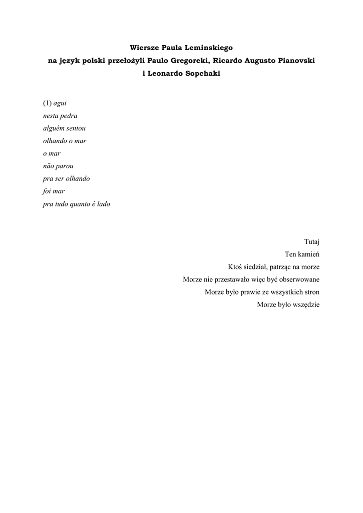 Wiersze Paula Leminskiego na język polski przełożyli Paulo Gregoreki, Ricardo Augusto Pianovski i Leonardo Sopchaki (1) agui nesta pedra alguém sentou olhando o mar o mar não parou pra ser olhando foi mar pra tudo quanto é lado Tutaj Ten kamień Ktoś siedział, patrząc na morze Morze nie przestawało więc być obserwowane Morze było prawie ze wszystkich stron Morze było wszędzie (2) dança da chuva senhorita chuva me concede a honra desta contradança e vamos sair por esses campos ao som desta chuva que cai sobre o teclado Taniec deszczu Pan deszcz, stary zaszczyt tego tańca Opuszcza tę ziemię z dźwiękiem deszczu, Spadając na klawiaturę. Ten dzień, ten podły dzień, Który przyszedł po wczorajszym (3) um passarinho volta pra árvore que não mais existe meu pensamento voa até você só pra ficar triste Ptaszek Wraca na drzewo Które dłużej nie istnieje. Moje myśli Fruną do Ciebie By być smutne (4) o tempo entre o sopro e o apagar da vela Czas, czas Pomiędzy podmuchem i wygasaniem świecy Pomiędzy podmuchem i zgaśnięciem świecy (9) Amando, aumenta até duas mil vezes o tamanho. Kochając, powiększa rozmiar do dwóch tysięcy razy.