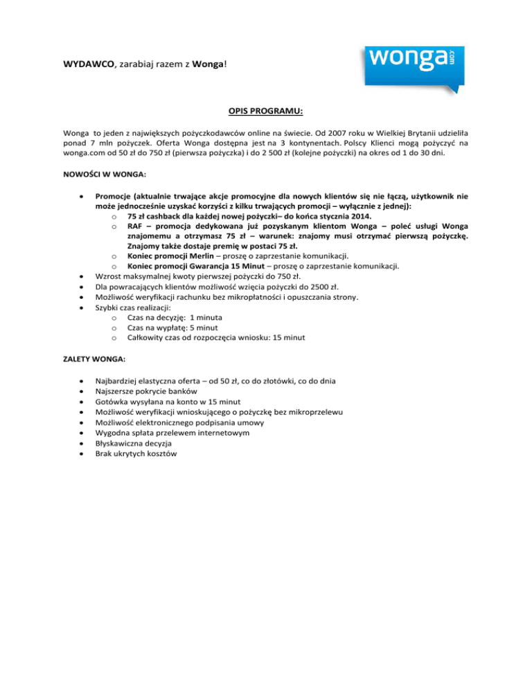 WYDAWCO, zarabiaj razem z Wonga! OPIS PROGRAMU: Wonga to jeden z największych pożyczkodawców online na świecie. Od 2007 roku w Wielkiej Brytanii udzieliła ponad 7 mln pożyczek. Oferta Wonga dostępna jest na 3 kontynentach. Polscy Klienci mogą pożyczyć na wonga.com od 50 zł do 750 zł (pierwsza pożyczka) i do 2 500 zł (kolejne pożyczki) na okres od 1 do 30 dni. NOWOŚCI W WONGA: Promocje (aktualnie trwające akcje promocyjne dla nowych klientów się nie łączą, użytkownik nie może jednocześnie uzyskać korzyści z kilku trwających promocji – wyłącznie z jednej): o 75 zł cashback dla każdej nowej pożyczki– do końca stycznia 2014. o RAF – promocja dedykowana już pozyskanym klientom Wonga – poleć usługi Wonga znajomemu a otrzymasz 75 zł – warunek: znajomy musi otrzymać pierwszą pożyczkę. Znajomy także dostaje premię w postaci 75 zł. o Koniec promocji Merlin – proszę o zaprzestanie komunikacji. o Koniec promocji Gwarancja 15 Minut – proszę o zaprzestanie komunikacji. Wzrost maksymalnej kwoty pierwszej pożyczki do 750 zł. Dla powracających klientów możliwość wzięcia pożyczki do 2500 zł. Możliwość weryfikacji rachunku bez mikropłatności i opuszczania strony. Szybki czas realizacji: o Czas na decyzję: 1 minuta o Czas na wypłatę: 5 minut o Całkowity czas od rozpoczęcia wniosku: 15 minut ZALETY WONGA: Najbardziej elastyczna oferta – od 50 zł, co do złotówki, co do dnia Najszersze pokrycie banków Gotówka wysyłana na konto w 15 minut Możliwość weryfikacji wnioskującego o pożyczkę bez mikroprzelewu Możliwość elektronicznego podpisania umowy Wygodna spłata przelewem internetowym Błyskawiczna decyzja Brak ukrytych kosztów WARUNKI PROGRAMU: Wszystkie udzielone w ramach programu pożyczki są dokładnie weryfikowane. Natomiast znaczne ilości pożyczek udzielone przez jednego Wydawcę poniżej kwoty ok. 100 zł będą weryfikowane wyjątkowo wnikliwie. Konsekwencją wykrycia fraudu może być nierozliczenie za dostarczone leady lub całkowite wykluczenie z programu afiliacyjnego. Dopuszczenie się powyższych naruszeń może prowadzić do anulowania uzyskanych/wygenerowanych przychodów oraz może skutkować natychmiastowym rozwiązaniem umowy z partnerem. ZASADY KOMUNIKACJI: Zakaz wykorzystywania materiałów innych, niż pochodzące od Wonga. Jeżeli wydawca chce użyć własnych materiałów lub własnego tekstu reklamowego (copy) musi się każdorazowo uprzednio skontaktować z Wonga celem uzyskania zgody i zatwierdzenia materiału. Każdy wydawca zobowiązuje się do aktualizacji materiałów Wonga niezwłocznie po otrzymaniu informacji o zmianie drogą elektroniczną. Zakaz pokazywania banknotów/monet na kreacjach. Zakaz sugerowania jakiegokolwiek celu, w którym może być wzięta pożyczka. Zakaz podawania jakichkolwiek informacji dotyczących hazardu, konkursów, loterii, możliwości wygrania pieniędzy. WARUNKI TECHNICZNE I PRAWNE: Brak post-view cookies – dozwolone tylko post click Zakaz wykorzystywania ramek iFrame Zakaz reklamy typu Pop-Under/Pop-Ups Zakaz wykorzystania kopii/imitacji czy obrazu strony wonga.com Zakaz wykorzystania systemów typu paid-mailer, cash-back, systemów bonusowych, liczników odwiedzin i podobnych – każdy taki przypadek musi być zaakceptowany przez Wonga Zakaz wykorzystania treści dyskryminujących lub obraźliwych na stronie Zakaz wykorzystania stron z treścią erotyczną, pornograficzną, ekstremistyczną, radykalno-polityczną lub inną skierowaną do osób niepełnoletnich Zakaz pozyskiwania klientów poprzez reklamę SEM, zakaz wykorzystywania nazwy marki w kampaniach (Brand Bidding) Zakaz ingerowania, przekształcania naszych linków lub ich maskowania Zakaz bezpośredniego przekierowania na naszą stronę oraz generowania sztucznego ruchu oraz kliknięć na stronie Zakaz wykorzystania stron przekierowujących ruch do torrentów Zakaz wykorzystania naszej nazwy/marki i ofert w reklamach na Facebooku Zakaz tworzenia na Facebooku Fanpages z naszą nazwą Zabrania się „nagradzania” (premiowania) internautów za wejście na stronę (np. poprzez wirtualną walutę) Zabrania się wykorzystywania oferty, własności intelektualnej oraz nazwy i marki firmy Wonga jako przedmiotu gier losowych i konkursów Każdy wydawca posiadający bazę mailingową i biorący udział w programie afiliacyjnym Wonga oświadcza, że: o posiada skuteczną zgodę użytkowników na przetwarzanie ich danych osobowych oraz na wysyłanie informacji handlowych partnerów drogą elektroniczną o użytkownicy w każdym momencie mają możliwość wypisania się z bazy wydawcy o w przypadku, gdy treść zgody odbieranej od użytkowników nie spełnia powyższych wymogów, wydawca zobowiązuje się zmienić treść zgody według wzoru przygotowanego przez Wonga Wszelkie zapytania proszę kierować do swojego menedżera sieci afiliacyjnej, który przekaże je bezpośrednio do osoby zarządzającej programem afiliacyjnym Wonga.