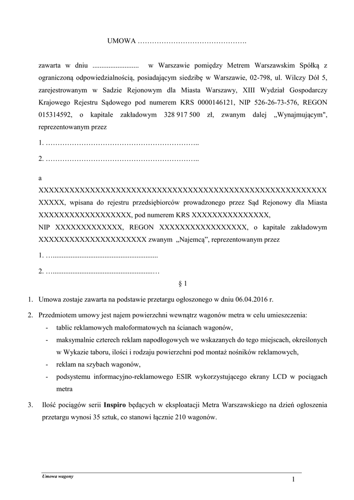 UMOWA ………………………………………. zawarta w dniu .......................... w Warszawie pomiędzy Metrem Warszawskim Spółką z ograniczoną odpowiedzialnością, posiadającym siedzibę w Warszawie, 02-798, ul. Wilczy Dół 5, zarejestrowanym w Sadzie Rejonowym dla Miasta Warszawy, XIII Wydział Gospodarczy Krajowego Rejestru Sądowego pod numerem KRS 0000146121, NIP 526-26-73-576, REGON 015314592, o kapitale zakładowym 328 917 500 zł, zwanym dalej „Wynajmującym", reprezentowanym przez 1. ……………………………………………………….. 2. ……………………………………………………….. a XXXXXXXXXXXXXXXXXXXXXXXXXXXXXXXXXXXXXXXXXXXXXXXXXXXXXXXX XXXXX, wpisana do rejestru przedsiębiorców prowadzonego przez Sąd Rejonowy dla Miasta XXXXXXXXXXXXXXXXXX, pod numerem KRS XXXXXXXXXXXXXXX, NIP XXXXXXXXXXXXX, REGON XXXXXXXXXXXXXXXXX, o kapitale zakładowym XXXXXXXXXXXXXXXXXXXXX zwanym „Najemcą”, reprezentowanym przez 1. …........................................................... 2. …........................................................… §1 1. Umowa zostaje zawarta na podstawie przetargu ogłoszonego w dniu 06.04.2016 r. 2. Przedmiotem umowy jest najem powierzchni wewnątrz wagonów metra w celu umieszczenia: - tablic reklamowych małoformatowych na ścianach wagonów, - maksymalnie czterech reklam napodłogowych we wskazanych do tego miejscach, określonych w Wykazie taboru, ilości i rodzaju powierzchni pod montaż nośników reklamowych, - reklam na szybach wagonów, - podsystemu informacyjno-reklamowego ESIR wykorzystującego ekrany LCD w pociągach metra 3. Ilość pociągów serii Inspiro będących w eksploatacji Metra Warszawskiego na dzień ogłoszenia przetargu wynosi 35 sztuk, co stanowi łącznie 210 wagonów. Umowa wagony 1 Łącznie w 210 wagonach znajduje się 630 możliwych miejsc pod montaż jednego miejsca pod montaż tablic reklamowych małoformatowych oraz 840 możliwych miejsc pod montaż ekranów LCD w ramach podsystemu informacyjno – reklamowego ESIR. W pociągach serii Inspiro reklama na szybach i drzwiach nie jest przewidziana. 4. Ilość pociągów serii Metropolis będących w eksploatacji Metra Warszawskiego na dzień ogłoszenia przetargu wynosi 18 sztuk, co stanowi łącznie 108 wagonów. Łącznie w 108 wagonach znajduje się 324 możliwych miejsc pod montaż jednego miejsca pod montaż tablic reklamowych małoformatowych, 648 możliwych miejsc pod montaż ekranów LCD w ramach podsystemu informacyjno – reklamowego ESIR, 432 możliwych miejsc pod montaż reklam na szybach wagonów oraz 432 możliwych miejsc pod montaż reklam napodłogowych. 5. Ilość pociągów typu 81 (stare rosyjskie) będących w eksploatacji Metra Warszawskiego na dzień ogłoszenia przetargu wynosi 15 sztuk, co stanowi łącznie 90 wagonów. Łącznie w 90 wagonach znajduje się 270 możliwych miejsc pod montaż jednego miejsca pod montaż tablic reklamowych małoformatowych, 270 możliwych miejsc pod montaż ekranów LCD w ramach podsystemu informacyjno – reklamowego ESIR, 360 możliwych miejsc pod montaż reklam na szybach wagonów oraz 180 możliwych miejsc pod montaż reklam napodłogowych. 6. Ilość pociągów typu 81 (nowe rosyjskie) będących w eksploatacji Metra Warszawskiego na dzień ogłoszenia przetargu wynosi 7 sztuk, co stanowi łącznie 42 wagony. Łącznie w 42 wagonach znajduje się 126 możliwych miejsc pod montaż jednego miejsca pod montaż tablic reklamowych małoformatowych, 168 możliwych miejsc pod montaż ekranów LCD w ramach podsystemu informacyjno – reklamowego ESIR, 168 możliwych miejsc pod montaż reklam na szybach wagonów oraz 84 możliwych miejsc pod montaż reklam napodłogowych. 7. Wynajmujący zastrzega, iż ilość wagonów może ulec zmniejszeniu lub zwiększeniu w czasie obowiązywania niniejszej umowy. W tym przypadku Najemca zobowiązany będzie do rozszerzenia działalności również na nowe wagony wprowadzane do ruchu lub demontażu nośników z wagonów wycofywanych z eksploatacji. O zaistnieniu takiej konieczności Najemca zostanie powiadomiony z co najmniej 1-miesięcznym wyprzedzeniem. Opłata czynszowa z tytułu wprowadzenia nowego taboru do ruchu zostanie wówczas powiększona zgodnie z warunkami złożonymi przez Najemcę w ofercie przetargowej. §2 1. Za tablicę małoformatową uważa się nośnik reklamowy o szerokości 32 cm i o długości nie przekraczającej długości ciągu siedzeń wagonów metra, nad którymi jest umieszczona. 2. Za reklamę napodłogową uważa się reklamę wykonaną z materiału naklejanego bezpośrednio na Umowa wagony 2 podłogę wagonu, o wymiarach nie większych niż 150 x 100 cm. 3. Za reklamę na oknach uważa się reklamę w formie naklejki (naklejka dwustronna) na oknie, o powierzchni nie większej niż 0,25m2 . 4. W wagonach serii Inspiro reklama na szybach i drzwiach pociągu oraz podłogach nie jest przewidziana i nie jest możliwa do umieszczenia. 5. Za elektroniczny nośnik reklamowy w ramach podsystemu informacyjno – reklamowego ESIR uważa się nośnik – ekran LCD o minimalnej wielkości 19 cali umożliwiający przekazywanie treści reklamowych w czasie rzeczywistym. Monitory, nie mogą zajmować przestrzeni w ciągu komunikacyjnym wzdłuż wagonu ograniczając widoczność wyświetlaczy na czołowych ścianach wagonów. Urządzenia te nie mogą powodować zagrożenia pożarowego. 6. Tablica małoformatowa, reklama napodłogowa, reklama na szybach wagonów oraz ekrany LCD określane są w dalszej treści umowy również jako nośniki reklamowe. 7. Wykaz taboru, ilości i rodzaju powierzchni pod montaż nośników reklamowych stanowi załącznik nr 1 do umowy §3 Umowa obowiązuje od dnia XXXXXXX .2016 do dnia XXXXXX .2019 roku §4 1. Najemca będzie płacił Wynajmującemu miesięcznie za wynajem powierzchni pod montaż jednej sztuki tablicy reklamowej małoformatowej czynsz miesięczny w wysokości XX zł 