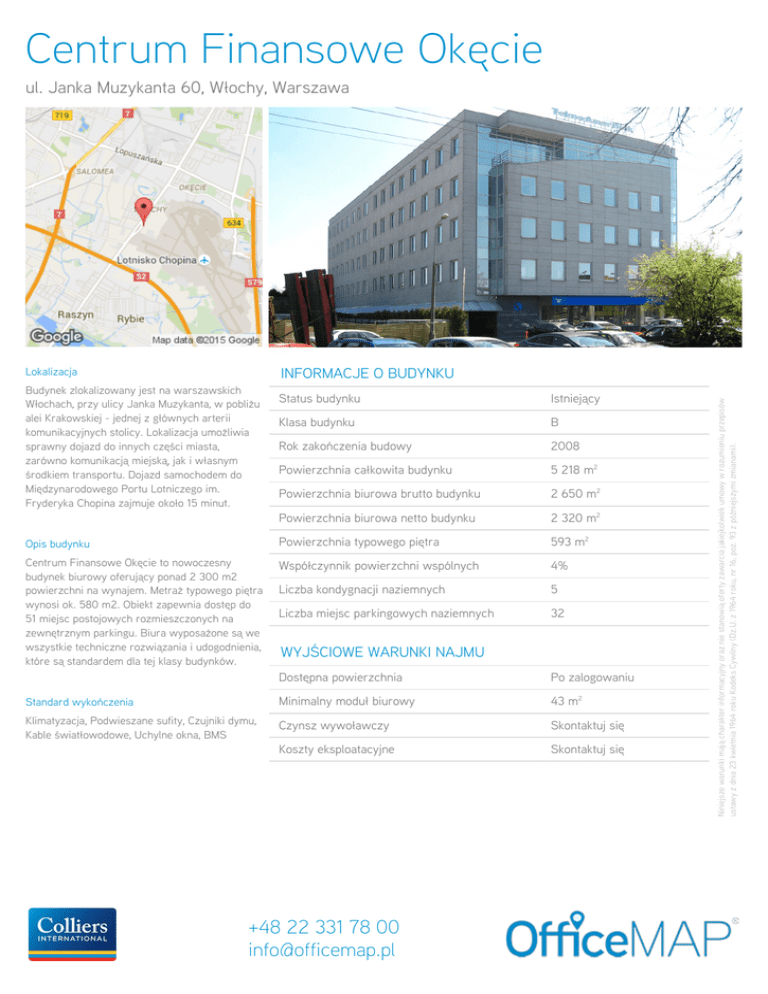 Centrum Finansowe Okęcie ul. Janka Muzykanta 60, Włochy, Warszawa Lokalizacja Status budynku Istniejący Klasa budynku B Rok zakończenia budowy 2008 Powierzchnia całkowita budynku 5 218 m2 Powierzchnia biurowa brutto budynku 2 650 m2 Powierzchnia biurowa netto budynku 2 320 m2 Opis budynku Powierzchnia typowego piętra 593 m2 Centrum Finansowe Okęcie to nowoczesny budynek biurowy oferujący ponad 2 300 m2 powierzchni na wynajem. Metraż typowego piętra wynosi ok. 580 m2. Obiekt zapewnia dostęp do 51 miejsc postojowych rozmieszczonych na zewnętrznym parkingu. Biura wyposażone są we wszystkie techniczne rozwiązania i udogodnienia, które są standardem dla tej klasy budynków. Współczynnik powierzchni wspólnych 4% Liczba kondygnacji naziemnych 5 Liczba miejsc parkingowych naziemnych 32 WYJŚCIOWE WARUNKI NAJMU Dostępna powierzchnia Po zalogowaniu Standard wykończenia Minimalny moduł biurowy 43 m2 Klimatyzacja, Podwieszane sufity, Czujniki dymu, Kable światłowodowe, Uchylne okna, BMS Czynsz wywoławczy Skontaktuj się Koszty eksploatacyjne Skontaktuj się +48 22 331 78 00 [email protected] Niniejsze warunki mają charakter informacyjny oraz nie stanowią oferty zawarcia jakiejkolwiek umowy w rozumieniu przepisów ustawy z dnia 23 kwietnia 1964 roku Kodeks Cywilny (Dz.U. z 1964 roku, nr 16, poz. 93 z późniejszymi zmianami). INFORMACJE O BUDYNKU Budynek zlokalizowany jest na warszawskich Włochach, przy ulicy Janka Muzykanta, w pobliżu alei Krakowskiej - jednej z głównych arterii komunikacyjnych stolicy. Lokalizacja umożliwia sprawny dojazd do innych części miasta, zarówno komunikacją miejską, jak i własnym środkiem transportu. Dojazd samochodem do Międzynarodowego Portu Lotniczego im. Fryderyka Chopina zajmuje około 15 minut.