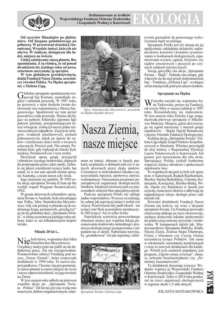 Od szczytówHimalajówpo głębiny mórz. Od bieguna południowego po północny.W przestrzeniziemskieji kosmicznej.Wszędzieśmieci,którychnie ubywa.W żadnym,dostępnymdlaludzi,miejscuna świecie. I dalejzaśmiecamynasząplanetę.Bez opamiętania.Z tąróżnicą,żeod ponad dwudziestulat,każdegorokuodnowa, szturmemzaczynamyjąsprzątać. W tym globalnym przedsięwzięciu, dziękiFundacjiNaszaZiemia,uczestniczyrównieżPolska.Na Śląskusprzątamyz ZielonaLigą. tywnie gromadzić do ponownego wykorzystania bądź recyklingu. Sprzątanie Polski jest też okazją do jej upiększania: zakładania zieleńców, sadzenia drzew, krzewów i kwiatów, rywalizowania w konkursach ekologicznych, organizowania wystaw, ognisk, festynów czy rajdów rowerowych i pieszych po czystych szlakach turystycznych. Swoją specyfikę ma akcja „Sprzątanie Świata – Śląsk”. Nabrała ona tempa, gdy włączyła się do niej przed siedemnastoma laty – Fundacja „Zielonej Ligi”, wydająca od lat miesięcznik pod tym samym tytułem. lobalne sprzątanie spontanicznie rozG począł Ian Kiernan, australijski żeglarz i miłośnik przyrody. W 1987 roku, Sprzątaniena Śląsku po powrocie z rejsu dookoła świata doskwierały mu wspomnienia z Morza Sargassowego. Spodziewał się tam ujrzeć prawdziwe cuda przyrody. Słynne dryfujące na pełnym Atlantyku ogromne łąki pokryte glonami, przypominającymi kiście winogron. Zobaczył morze pełne niezniszczalnych odpadków. Zużytych stringów, wiaderek plastikowych, pieluch jednorazowych, tubek po paście do zębów i niezliczone ilości toreb z tworzyw sztucznych. Przeżył szok. Nie ostatni. Podobnie było, gdy wpłynął do Zatoki Sydnejskiej. Postanowił coś z tym zrobić. Skrzyknął sporą grupę przyjaciół i obrońców czystego środowiska, chętnych do posprzątania portu i plaż zatoki. Zebrało się jakieś czterdzieści tysięcy ludzi. Ian uznał, że w ten sam sposób można sprzątać Australię, a może nawet cały świat. Jego marzenie się spełniło. W 1993 roku akcję sprzątania Świata (Clean up the world) wsparł Program Środowiskowy ONZ. W gronie aktywnych ochotników sprzątania Świata w Australii, była mieszkająca tam Polka, Mira Stanisławska-Meysztowicz. Gdy rok później wybierała się do rodzinnego kraju, postanowiła „przyłączyć” go do tej globalnej akcji „Sprzątania Świata”, w której uczestniczą każdego roku miliony ludzi ze stu kilkudziesięciu krajów świata. Minęło 20lati... było łatwo, wspomina dziś Mira Nie Stanisławska-Meysztowicz. Urzędnicy tradycyjnie nie palili się do do- datkowej pracy. Ale nie rezygnowałam. Postanowiłam założyć Fundację pod nazwą „Nasza Ziemia”, która rozpoczęła działalność w 1994 roku. To nazwa nieprzypadkowa. Chcemy nią przypominać, że nasza planeta to nasze miejsce do życia i nasza odpowiedzialność za jego trwanie na Ziemi. W tym samym roku odbyła się pierwsza wspólna akcja pn. „Sprzątanie Świata – Polska”. Od lat nie jest ona wyłącznie masowym, dobrze zorganizowanym, sztur- Mira Stanisławska-Meysztowicz posadziła na Śląskuniejednodrzewo Nasza Ziemia, nasze miejsce mem na śmieci, zbierane w lasach, parkach, na plażach, w dolinach rzek czy w samych akwenach przez ekipy nurków. Uczestniczy w nich młodzież szkolna z nauczycielami, harcerze, sportowcy, turyści, wolontariusze. Nieoceniona jest pomoc pozarządowych organizacji ekologicznych, leśników, lokalnych stowarzyszeń czy pracowników różnych firm specjalistycznych. Podczas sprzątania Polski nie odstaje żadne województwo. Wszyscy rywalizują, by zebrać jak najwięcej śmieci i zrobić coś więcej. Przed trzema laty padł rekord – sto tysięcy ton! Ilość uczestników przekroczyła 160 tysięcy! Ale to tylko liczby. Największą wartością powszechnego zbierania śmieci jest wspólna lekcja poszanowania środowiska naturalnego i promocja ekologicznego postępowania z odpadami na co dzień. Nabieranie nawyku, by „produkować” ich jak najmniej; selek- SprzątanieŚwiataz ZielonaLigą szystko zaczęło się, wspomina AnW na Tarkowska, prezes tej Fundacji, od wizyty Miry w naszej redakcji w 1997 roku. Rozumiałyśmy się znakomicie. W tym samym roku Zielona Liga zorganizowała pierwsze sprzątanie w Mikołowie-Mokrem. Miejscu, gdzie dziś rozciąga się ogród stworzony z marzeń grupy zapaleńców – Śląski Ogród Botaniczny i prężny Ośrodek Edukacji Ekologicznej. Kolejną akcją „Sprzątania Świata” Zielona Liga objęła Zespół Parków Krajobrazowych w Smoleniu. Wkrótce przystąpili do niej leśnicy z Regionalnej Dyrekcji Lasów Państwowych w Katowicach. Ich pomoc jest nieoceniona dla obu stron. Sprzątający Polskę zyskali konkretne wsparcie, leśnicy obrońców i społecznych opiekunów lasu. Po wspólnych akcjach (a było ich sporo m.in. w Katowicach, Rudach Raciborskich, Brynku, Suchej Beskidzkiej, Ustroniu, Koniecpolu, Koszęcinie, Bielsku-Białej, Wiśle, Opolu czy Rudzińcu) w lasach jest czyściej, rosną nowe drzewa i odbywają się najpiękniejsze lekcje ekologii przez cały niemal rok. Również działalność Fundacji Nasza Ziemia nie kończy się wraz z akcjami sprzątania Świata. I ta Fundacja prowadzi całoroczną edukuję na rzecz ekorozwoju, zachęca skutecznie lokalne społeczności do praktycznej ochrony przyrody i środowiska. W kampaniach takich jak: Międzynarodowe Sprzątanie Bałtyku, Kluby Naszej Ziemi, Zielona Stopa Filantropa, Firma z klimatem czy Czysta Gmina uczestniczą tysiące Polaków. Tak samo w szkoleniach, warsztatach, konferencjach i coraz to nowych działaniach dla każdego. Wśród tych ostatnich popularny jest program „Ogród ostoją zwierząt”, służący ochronie bioróżnorodności czy „Pomóżmy kasztanowcom”. Tę działalność doceniają wszyscy. Wydatnie wspierą ją Wojewódzki Fundusz Ochrony Środowiska i Gospodarki Wodnej w Katowicach. Tylko w 2014 roku przekazał na rzecz organizac