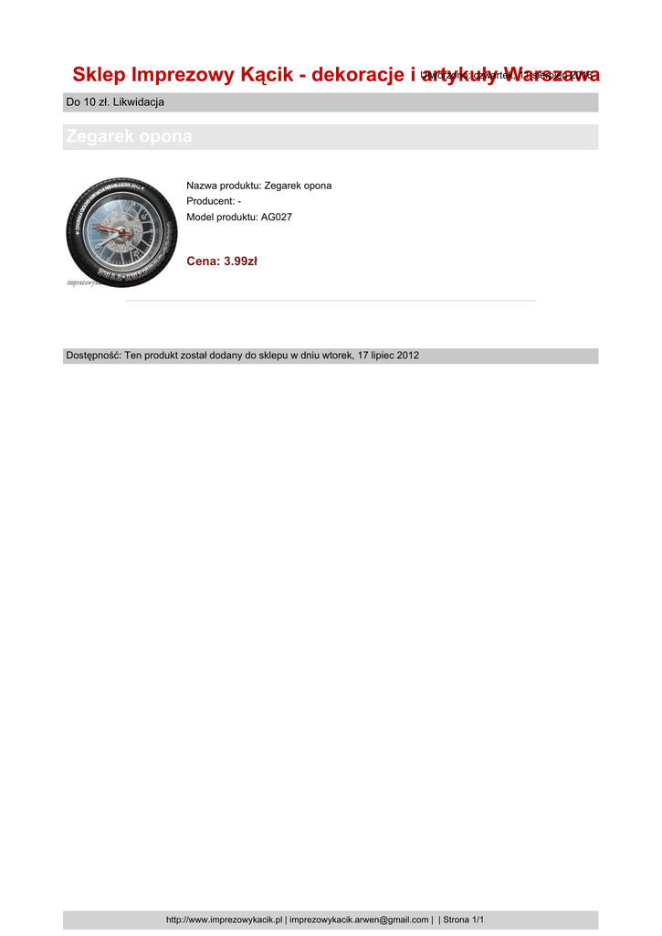 czwartek, 11 sierpień 2016 Sklep Imprezowy Kącik - dekoracje i Utworzono: artykuły Warszawa Do 10 zł. Likwidacja Zegarek opona Nazwa produktu: Zegarek opona Producent: Model produktu: AG027 Cena: 3.99zł Dostępność: Ten produkt został dodany do sklepu w dniu wtorek, 17 lipiec 2012 http://www.imprezowykacik.pl | [email protected] | | Strona 1/1