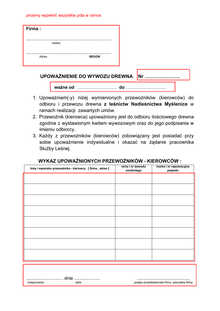 prosimy wypełnić wszystkie pola w ramce Firma : ..................................................................... nazwa ..................................................................... Adres REGON UPOWAŻNIENIE DO WYWOZU DREWNA Nr …………………. ważne od ……………………… do ……………………… 1. Upoważniam(-y) niżej wymienionych przewoźników (kierowców) do odbioru i przewozu drewna z leśnictw Nadleśnictwa Myślenice w ramach realizacji zawartych umów. 2. Przewoźnik (kierowca) upoważniony jest do odbioru ilościowego drewna zgodnie z wystawionym kwitem wywozowym oraz do jego podpisania w imieniu odbiorcy. 3. Każdy z przewoźników (kierowców) zobowiązany jest posiadać przy sobie upoważnienie indywidualne i okazać na żądanie pracownika Służby Leśnej. WYKAZ UPOWAŻNIONYCH PRZEWOŹNIKÓW - KIEROWCÓW : Imię i nazwisko przewoźnika - kierowcy [ firma , adres ] ............................ , dnia ..................... miejscowośc data seria i nr dowodu osobistego marka i nr rejestracyjny pojazdu ........................................... podpis przedstawiciela firmy, pieczatka firmy