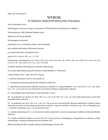 Sygn. akt VI Ka 569/16 WYROK W IMIENIU RZECZYPOSPOLITEJ POLSKIEJ Dnia 4 listopada 2016 r. Sąd Okręgowy Warszawa-Praga w Warszawie VI Wydział Karny Odwoławczy w składzie : Przewodniczący: SSO Ludmiła Tułaczko (spr.) Sędziowie: SO Jacek Matusik SO Remigiusz Pawłowski protokolant: p.o. protokolant sądowy Aneta Kniaziuk przy udziale prokuratora Wojciecha Groszyka po rozpoznaniu dnia 4 listopada 2016 r. sprawy M. A. syna A. i M., ur. (...) w W. oskarżonego o przestępstwa z art. 279 § 1 k.k. w zw. z art. 64 § 1 k.k., art. 178a § 1 k.k., art. 278 § 1 k.k. w zb. z art. 275 § 1 k.k. w zw. z art. 64 § 1 k.k. w zw. z art. 11 § 2 k.k. na skutek apelacji wniesionej przez obrońcę oskarżonego od wyroku Sądu Rejonowego dla Warszawy Pragi-Południe w Warszawie z dnia 8 lutego 2016 r. sygn. akt III K 1225/13 I. zmienia zaskarżony wyrok w ten sposób, że: 1. rozwiązuje karę łączną pozbawienia wolności z punktu IV; 2. łagodzi karę pozbawienia wolności orzeczoną w punkcie I za ciąg przestępstw z art. 279 §1 k.k. w zw. z art. 64 §1 k.k. w zw. z art. 91 §1 k.k. do 3 (trzech) lat i 6 (sześciu) miesięcy pozbawienia wolności; II. w pozostałej części zaskarżony wyrok utrzymuje w mocy; III. na podstawie art. 85 kk i art. 86 § 1 kk w zw. z art. 91 § 2 kk w zw. z art. 4 § 1 kk orzeka karę łączną 4 (czterech) lat pozbawienia wolności; IV. na podstawie art. 63 § 1 kk w zw. z art. 4 § 1 kk na poczet orzeczonej kary łącznej pozbawienia wolności zalicza oskarżonemu okres rzeczywistego pozbawienia wolności w sprawie od dnia 4 września 2013 r. do 27 listopada 2013 r. i od dnia 10 kwietnia 2014 r. do 25 stycznia 2016 r.; V. zwalnia oskarżonego M. A. od uiszczenia kosztów sądowych w sprawie przejmując wydatki na rachunek Skarbu Państwa; VI. zasądza od Skarbu Państwa na rzecz adw. M. O. kwotę 516,60 zł obejmującą wynagrodzenie za obronę z urzędu oskarżonego w instancji odwoławczej oraz podatek VAT. SSO Jacek Matusik SSO Ludmiła Tułaczko SSO Remigiusz Pawłowski Sygn. akt VI Ka 569/16 UZASADNIENIE M. A. został oskarżony o to, że: 1. w dniu 4 września 2013 r. w W. po uprzednim sforsowaniu zamków włamał się do samochodu osobowego marki F. (...) nr rej. (...) wartości 2000 zł, a następnie zabrał go w celu przywłaszczenia na szkodę A. i M. K., przy czym czynu tego dopuścił się w ciągu 5 lat od odbycia kary powyżej 6 miesięcy pozbawienia wolności orzeczonej za podobne przestępstwo umyślne wyrokiem Sądu Rejonowego dla Warszawy Mokotowa z dnia 29.07.2009 r. sygn. VIII K 1489/08 za przestępstwo z art. 280 § 1 k.k. skazany na karę 2 lat pozbawienia wolności, którą odbył w okresie od 02.02.2011 r. 01.02.2013 r., tj. o czyn z art. 279 § 1 k.k. w zw. z art. 64 § 1 k.k. 2. w dniu 4 września 2013 r. w W. umyślnie naruszył zasady bezpieczeństwa w ruchu lądowym a mianowicie art. 45 ust. 1 Ustawy z dnia 20.06.1997 r. Prawo o ruchu drogowym kierując w ruchu lądowym samochodem osobowym marki F. (...) nr rej. (...) w stanie nietrzeźwości I – 0,44 mg/l, II – 0,42 mg/l, III – 0,41 mg/l alkoholu w wydychanym powietrzu, tj. o czyn z art. 178a § 1 k.k. 3. w okresie od 9 do 11 marca 2013 r. w W. po uprzednim sforsowaniu zabezpieczeń włamał się do samochodu osobowego marki R. (...) nr rej. (...) o wartości 1000 zł, a następnie zabrał go w celu przywłaszczenia na szkodę P. M., przy czym czynu tego dopuścił się w ciągu 5 lat od odbycia kary powyżej 6 miesięcy pozbawienia wolności orzeczonej za podobne przestępstwo umyślne wyrokiem Sądu Rejonowego dla Warszawy Mokotowa z dnia 29.07.2009 r. sygn. VIII K 1489/08 za przestępstwo z art. 280 § 1 k.k. skazany na karę 2 lat pozbawienia wolności, którą odbył w okresie od 02.02.2011 r. 01.02.2013 r., tj. o czyn z art. 279 § 1 k.k. w zw. z art. 64 § 1 k.k. 4. w okresie od 17 do 18 marca 2013 r. w W. po uprzednim sforsowaniu zabezpieczeń włamał się do samochodu osobowego marki V. (...) nr rej. (...), a następnie skradł go wraz ze znajdującymi się w nim przedmiotami na łączną wartość 3000 zł na szkodę S. C., przy czym czynu tego dopuścił się w ciągu 5 lat od odbycia kary powyżej 6 miesięcy pozbawienia wolności orzeczonej za podobne przestępstwo umyślne wyrokiem Sądu Rejonowego dla Warszawy Mokotowa z dnia 29.07.2009 r. sygn. VIII K 1489/08 za przestępstwo z art. 280 § 1 k.k. skazany na karę 2 lat pozbawienia wolności, którą odbył w okresie od 02.02.2011 r. 01.02.2013 r., tj. o czyn z art. 279 § 1 k.k. w zw. z art. 64 § 1 k.k. 5. w dniu 3 września 2013 r. w W. działając wspólnie i w porozumieniu z D. A. dokonał zaboru w celu przywłaszczenia dowód osobisty na nazwisko R. T., DVD marki O., piłę łańcuchową, odzież marki A. i N. o wartości 1250 zł na szkodę R. T. oraz odzież wartości 309 zł na szkodę B. J., przy czym czynu tego dopuścił się w ciągu 5 lat od odbycia kary powyżej 6 miesięcy pozbawienia wolności orzeczonej za podobne przestępstwo umyślne wyrokiem Sądu Rejonowego dla Warszawy Mokotowa z dnia 29.07.2009 r. sygn. VIII K 1489/08 za przestępstwo z art. 280 § 1 k.k. skazany na karę 2 lat pozbawienia wolności, którą odbył w okresie od 02.02.2011r. 01.02.2013 r. tj. o czyn z art. 278 § 1 k.k. w zb. z art. 275 § 1 k.k. w zw. z art. 64 § 1 k.k. w zw. z art. 11 § 2 k.k. Sąd Rejonowy dla Warszawy Pragi- Południe w Warszawie wyrokiem z dnia 8 lutego 2016r. po rozpoznaniu sprawy sygn. III K 1225/13 orzekł: I. oskarżonego uznał za winnego popełnienia czynów zarzucanych mu w punkcie 1, 3, 4 stanowiących ciąg przestępstw wyczerpujących dyspozycję art. 279 § 1 k.k. w zw. z art. 64 § 1 k.k., na tej podstawie skazał go, a na podstawie art. 279 § 1 k.k. w zw. z art. 91 § 1 k.k. wymierzył mu karę 4 (czterech) lat i 6 (sześciu) miesięcy pozbawienia wolności, II. oskarżonego uznał za winnego popełnienia czynu zarzucanego mu w punkcie 2 wyczerpującego dyspozycję art. 178a § 1 k