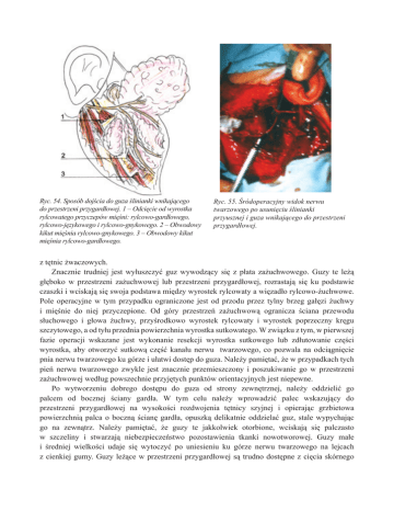 Ryc. 54. Sposób dojścia do guza ślinianki wnikającego do przestrzeni przygardłowej. 1 – Odcięcie od wyrostka rylcowatego przyczepów mięśni: rylcowo-gardłowego, rylcowo-językowego i rylcowo-gnykowego. 2 – Obwodowy kikut mięśnia rylcowo-gnykowego. 3 – Obwodowy kikut mięśnia rylcowo-gardłowego. Ryc. 55. Śródoperacyjny widok nerwu twarzowego po usunięciu ślinianki przyusznej i guza wnikającego do przestrzeni przygardłowej. z tętnic żwaczowych. Znacznie trudniej jest wyłuszczyć guz wywodzący się z płata zażuchwowego. Guzy te leżą głęboko w przestrzeni zażuchwowej lub przestrzeni przygardłowej, rozrastają się ku podstawie czaszki i wciskają się swoja podstawa między wyrostek rylcowaty a więzadło rylcowo-żuchwowe. Pole operacyjne w tym przypadku ograniczone jest od przodu przez tylny brzeg gałęzi żuchwy i mięśnie do niej przyczepione. Od góry przestrzeń zażuchwową ogranicza ściana przewodu słuchowego i głowa żuchwy, przyśrodkowo wyrostek rylcowaty i wyrostek poprzeczny kręgu szczytowego, a od tyłu przednia powierzchnia wyrostka sutkowatego. W związku z tym, w pierwszej fazie operacji wskazane jest wykonanie resekcji wyrostka sutkowego lub zdłutowanie części wyrostka, aby otworzyć sutkową część kanału nerwu twarzowego, co pozwala na odciągnięcie pnia nerwu twarzowego ku górze i ułatwi dostęp do guza. Należy pamiętać, że w przypadkach tych pień nerwu twarzowego zwykle jest znacznie przemieszczony i poszukiwanie go w przestrzeni zażuchwowej według powszechnie przyjętych punktów orientacyjnych jest niepewne. Po wytworzeniu dobrego dostępu do guza od strony zewnętrznej, należy oddzielić go palcem od bocznej ściany gardła. W tym celu należy wprowadzić palec wskazujący do przestrzeni przygardłowej na wysokości rozdwojenia tętnicy szyjnej i opierając grzbietowa powierzchnią palca o boczną ścianę gardła, opuszką delikatnie oddzielać guz, stale wypychając go na zewnątrz. Należy pamiętać, że guzy te jakkolwiek otorbione, wciskają się palczasto w szczeliny i stwarzają niebezpieczeństwo pozostawienia tkanki nowotworowej. Guzy małe i średniej wielkości udaje się wytoczyć po uniesieniu ku górze nerwu twarzowego na lejcach z cienkiej gumy. Guzy leżące w przestrzeni przygardłowej są trudno dostępne z cięcia skórnego
