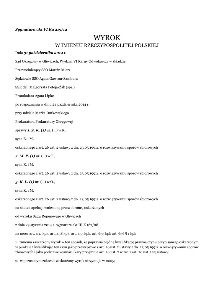 Sygnatura akt VI Ka 419/14 WYROK W IMIENIU RZECZYPOSPOLITEJ POLSKIEJ Dnia 31 października 2014 r. Sąd Okręgowy w Gliwicach, Wydział VI Karny Odwoławczy w składzie: Przewodniczący SSO Marcin Mierz Sędziowie SSO Agata Gawron-Sambura SSR del. Małgorzata Peteja-Żak (spr.) Protokolant Agata Lipke po rozpoznaniu w dniu 24 października 2014 r. przy udziale Marka Dutkowskiego Prokuratora Prokuratury Okręgowej sprawy 1. Z. K. (1) ur. (...) w R., syna E. i M. oskarżonego z art. 26 ust. 2 ustawy z dn. 23.05.1991r. o rozwiązywaniu sporów zbiorowych 2. M. P. (1) ur. (...) w P., syna K. i M. oskarżonego z art. 26 ust. 2 ustawy z dn. 23.05.1991r. o rozwiązywaniu sporów zbiorowych 3. K. L. (1) ur. (...) w O., syna K. i M. oskarżonego z art. 26 ust. 2 ustawy z dn. 23.05.1991r. o rozwiązywaniu sporów zbiorowych na skutek apelacji wniesioną przez obrońcę oskarżonych od wyroku Sądu Rejonowego w Gliwicach z dnia 23 stycznia 2014 r. sygnatura akt III K 167/08 na mocy art. 437 kpk, art. 438 kpk, art. 455 kpk, art. 633 kpk art. 636 § 1 kpk 1. zmienia zaskarżony wyrok w ten sposób, że poprawia błędną kwalifikację prawną czynu przypisanego oskarżonym w punkcie 1 kwalifikując ten czyn jako przestępstwo z art. 26 ust. 2 ustawy z dn. 23.05.1991r. o rozwiązywaniu sporów zbiorowych i jako podstawę wymiaru kary przyjmuje art. 26 ust. 2 w zw. z art. 26 ust. 1 tej ustawy; 2. w pozostałym zakresie zaskarżony wyrok utrzymuje w mocy; 3. zasądza od każdego z oskarżonych na rzecz oskarżyciela posiłkowego (...) S.A. z siedzibą w K. (Oddział Kopalnia (...)) kwotę po 140 zł (sto czterdzieści złotych) tytułem zwrotu kosztów poniesionych za zastępstwo procesowe w postępowaniu odwoławczym; 4. zasądza od oskarżonych na rzecz Skarbu Państwa wydatki postępowania odwoławczego w kwotach po 6,66 zł ( sześć złotych i sześćdziesiąt sześć groszy) i wymierza im opłaty za II instancję w kwotach po 300 zł ( trzysta złotych). Sygn. akt VI Ka 419/14 UZASADNIENIE WYROKU z dnia 31 października 2014r. Sąd Rejonowy w Gliwicach wyrokiem z dnia 23 stycznia 2014r., w sprawie o sygn. III K 167/08, uznał oskarżonych Z. K. (1), M. P. (1) i K. L. (1) za winnych popełnienia czynu polegającego na tym, że w dniach 24 - 26 kwietnia 2007r. w K., działając wspólnie i w porozumieniu, będąc działaczami związku zawodowego (...), zorganizowali i przeprowadzili bez uprzedniego spełnienia warunków określonych w ustawie z dnia 23 maja 1991r. o rozwiązywaniu sporów zbiorowych, a to nie przeprowadzenia z pracodawcą rokowań, jak również mediacji oraz arbitrażu, a także nie przeprowadzenia referendum dotyczącego rozpoczęcia strajku, od których spełnienia zależy jego legalność, akcję protestacyjną na terenie Kopalni (...) należącej do (...) Spółki Akcyjnej z siedzibą w K., tj. czynu wyczerpującego znamiona przestępstwa z art. 26 ust. 1 ustawy z dnia 23 maja 1991r. o rozwiązywaniu sporów zbiorowych i za ten czyn na mocy w/w przepisu ustawy wymierzył każdemu z oskarżonych karę grzywny w rozmiarze 100 stawek dziennych, ustalając wysokość każdej z nich na kwotę 30 złotych. Nadto na podstawie art. 627 kpk i art. 633 kpk zasądził od każdego z oskarżonych na rzecz oskarżyciela posiłkowego (...) Spółki Akcyjnej z siedzibą w K. (Oddział KWK (...)) tytułem zwrotu kosztów procesu kwoty po 3.108 złotych oraz na rzecz Skarbu Państwa kwoty po 217,70 złotych tytułem zwrotu wydatków oraz kwoty po 300 złotych tytułem opłaty. Od niniejszego wyroku apelację wywiódł obrońca oskarżonych, zaskarżając wyrok w całości i zarzucając mu: 1. naruszenie art. 439 § 1 pkt 9 w zw. z art. 17 § 1 pkt 9 kpk poprzez jego niezastosowanie na skutek przyjęcia, iż skoro akt oskarżenia wniósł Prokurator to przedmiotowa ujemna przesłanka procesowa nie zachodzi. Tymczasem dyrektorzy KWK (...) składając zawiadomienie o przestępstwie oskarżonych nie posiadali umocowania do jego złożenia, co czyni je bezskutecznym. Prokurator wobec braku innych zawiadomień nie powinien wnosić aktu oskarżenia, gdyż o sprawie nie wiedział z uwagi na brak skutecznego zawiadomienia od pokrzywdzonego – (...) S.A. w rozumieniu art. 49 § 1 kpk, a złożony wniosek nie został uzupełniony w trybie art. 120 kpk. Sąd powinien był zatem umorzyć postępowanie, czego nie zrobił; 2. naruszenie przepisów postępowania, które wpłynęło na wynik sprawy, a mianowicie: a) naruszenie art. 7 kpk poprzez jego błędne zastosowanie polegające na przyjęciu, w ślad za wadliwą oceną zeznań A. P., E. B. (1), J. R., M. P. (2), T. F., A. B., T. O., T. K., A. G., Z. C., J. K., J. B., T. G., H. S., J. J., D. K., M. J. (1) i L. G., iż oskarżeni wspólnie i w porozumieniu zorganizowali i przeprowadzili wbrew ustawie o rozwiązywaniu sporów zbiorowych nielegalny strajk, gdyż: - na masówce posiadali nagłośnienie oraz flagi związkowe, - posługiwali się terminem „pogotowie strajkowe”, - nawoływali i blokowali ludziom możliwość podjęcia pracy, - podpisywali listy osób uprawnionych do zjazdu, - napisano o strajku w komunikacie związkowym, - tak odebrały to osoby, które złożyły oświadczenia na k. 91-141, podczas, gdy wszechstronna ocena zgromadzonego materiału dowodowego z uwzględnieniem zasad prawidłowego rozumowania oraz wskazań wiedzy i doświadczenia życiowego przeczy w/w tezie, gdyż: - oskarżeni zorganizowali jedynie legalną „masówkę”, co potwierdził Sąd nie uwzględniając zarzutu z art. 26 ust. 2 ustawy o rozwiązywaniu sporów zbiorowych, regulującego odpowiedzialność za kierownictwo strajkiem wbrew przepisom w/w ustawy, - nawoływanie do udziału w „masówce”, a także obecność agitacyjna na nadszybiu nie jest działaniem penalizowanym karnie, - blokowanie ponad 200 górnikom możliwości podjęcia pracy przez 3 osoby jest irracjonalne z logicznego punktu widzenia, - decyzja o powstrzymaniu się od pracy części załogi 