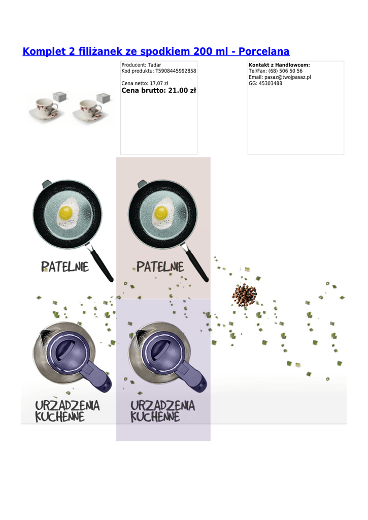 Komplet 2 filiżanek ze spodkiem 200 ml - Porcelana Producent: Tadar Kod produktu: T5908445992858 Cena netto: 17,07 zł Cena brutto: 21.00 zł Kontakt z Handlowcem: Tel/Fax: (68) 506 50 56 Email: [email protected] GG: 45303488 KOMPLET 2 FILIŻANEK+SPODEK KWADRAT 200ML KWIATY - Tadar Kod produktu: T5908445992858 KOMPLET 2 FILIŻANEK+SPODEK KWADRAT 200ML KWIATY Niezwykle elegancki i stylowy komplet dwóch filiżanek ze spodkami. Każdy element zestawu został wykonany z wysokiej jakości porcelany, ozdobiony kolorowym i ciekawym motywem kwiatów. Nowoczesny zestaw doskonale sprawdzi się w trakcie picia herbaty lub kawy z bliską osobą. Informacja dodatkowa: ● ● ● ● ● ● ● ● ● 2 filiżanki 2 kwadratowe spodki Filiżanka - pojemność: 200 ml Komplet dwóch filiżanek ze spodkami wykonany z wysokiej jakości porcelany Ilość elementów w zestawie: 4 elem. Zestaw przeznaczony dla 2 osób Wzór: kwiaty Kolor: biały z wzorem kolorowych kwiatów Opakowanie: elegancki kartonik Użytkowanie: ● Kontakt z żywnością Kod produktu:T5908445992858 ID produktu:163659 Granos Group sp. z o.o. ul. Sulechowska 4a budynek 45 65-001 Zielona Góra