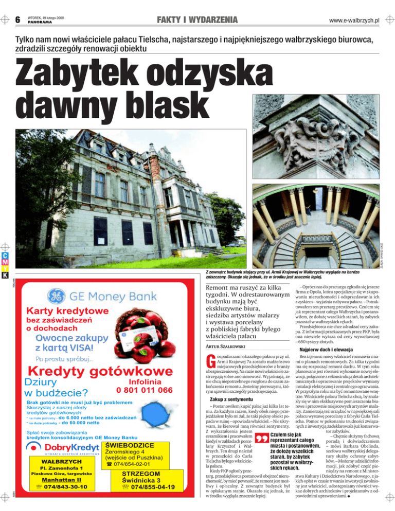 6 WTOREK, 19 lutego 2008 PANORAMA FAKTY I WYDARZENIA www.e-walbrzych.pl Tylko nam nowi właściciele pałacu Tielscha, najstarszego i najpiękniejszego wałbrzyskiego biurowca, zdradzili szczegóły renowacji obiektu REKLAMA ZDJĘCIA: DARIUSZ GDESZ Zabytek odzyska dawny blask Z zewnątrz budynek stojący przy ul. Armii Krajowej w Wałbrzychu wygląda na bardzo zniszczony. Okazuje się jednak, że w środku jest znacznie lepiej. Remont ma ruszyç za kilka tygodni. W odrestaurowanym budynku majà byç ekskluzywne biura, siedziba artystów malarzy i wystawa porcelany z pobliskiej fabryki by∏ego w∏aÊciciela pa∏acu Artur Szałkowski Najpierw dach i elewacja G Bez tajemnic nowy właściciel rozmawia z nami o planach remontowych. Za kilka tygodni ma się rozpocząć remont dachu. W tym roku planowane jest również wykonanie nowej elewacji, połączone z rekonstrukcją detali architektonicznych i opracowanie projektów wymiany instalacji elektrycznej i centralnego ogrzewania. W przyszłym roku ma być remontowane wnętrze. Właściciele pałacu Tielscha chcą, by znalaZakup z sentymentu zły się w nim ekskluzywne pomieszczenia biu– Postanowiłem kupić pałac już kilka lat te- rowe i pracownie miejscowych artystów malamu. Za każdym razem, kiedy obok niego prze- rzy. Zamierzają też urządzić w największej sali jeżdżałem było mi żal, że taki piękny obiekt po- pałacu wystawę porcelany z fabryki Carla Tielpada w ruinę – opowiada właściciel. – Nie ukry- scha. Pomoc w pokonaniu trudności związawam, że kierował mną również sentymenty. nych z inwestycją zadeklarowała już konserwator zabytków. Z wykształcenia jestem Czułem się jak – Chętnie służymy fachową ceramikiem i pracowałem reprezentant całego poradą i doświadczeniem kiedyś w zakładach porcemiasta i postanowiłem, – mówi Barbara Obelinda, lany Krzysztof i Wałszefowa wałbrzyskiej delegabrzych. Ten drugi należał że dołożę wszelkich tury służby ochrony zabytw przeszłości do Carla starań, by zabytek ków. – Możemy udzielić inforTielscha byłego właściciepozostał w wałbrzymacji, jak zdobyć część piela pałacu. skich rękach. niędzy na remont z MinisterKiedy PKP ogłosiły przetarg, przedsiębiorca postanowił obejrzeć nieru- stwa Kultury i Dziedzictwa Narodowego, z jachomość, by mieć pewność, że remont jest moż- kich opłat w czasie trwania inwestycji zwolnioliwy i opłacalny. Z zewnątrz budynek był ny jest właściciel, udostępniamy również wyw opłakanym stanie. Okazało się jednak, że kaz dobrych architektów i projektantów z odpowiednimi uprawnieniami. • w środku wygląda znacznie lepiej. ospodarzami okazałego pałacu przy ul. Armii Krajowej 7a zostało małżeństwo miejscowych przedsiębiorców z branży ubezpieczeniowej. Na razie nowi właściciele zastrzegają sobie anonimowość. Wyjaśniają, że nie chcą niepotrzebnego rozgłosu do czasu zakończenia remontu. Jesteśmy pierwszymi, którym ujawnili szczegóły przedsięwzięcia. ( 45560 – Oprócz nas do przetargu zgłosiła się jeszcze firma z Opola, która specjalizuje się w skupowaniu nieruchomości i odsprzedawaniu ich z zyskiem – wyjaśnia nabywca pałacu. – Potraktowałem ten przetarg prestiżowo. Czułem się jak reprezentant całego Wałbrzycha i postanowiłem, że dołożę wszelkich starań, by zabytek pozostał w wałbrzyskich rękach. Przedsiębiorca nie chce zdradzać ceny zakupu. Z informacji przekazanych przez PKP, była ona niewiele wyższa od ceny wywoławczej – 650 tysięcy złotych.