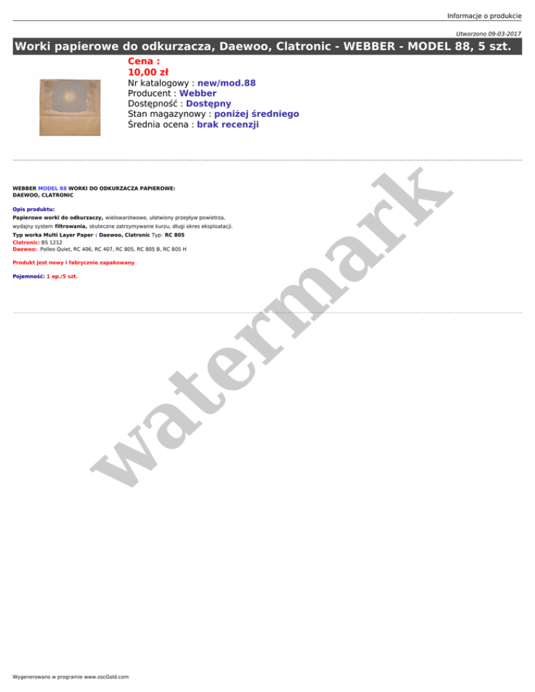 Informacje o produkcie Utworzono 09-03-2017 Worki papierowe do odkurzacza, Daewoo, Clatronic - WEBBER - MODEL 88, 5 szt. Cena : 10,00 zł Nr katalogowy : new/mod.88 Producent : Webber Dostępność : Dostępny Stan magazynowy : poniżej średniego Średnia ocena : brak recenzji Opis produktu: er m ar k WEBBER MODEL 88 WORKI DO ODKURZACZA PAPIEROWE: DAEWOO, CLATRONIC Papierowe worki do odkurzaczy, wielowarstwowe, ułatwiony przepływ powietrza, wydajny system filtrowania, skuteczne zatrzymywanie kurzu, długi okres eksploatacji. Typ worka Multi Layer Paper : Daewoo, Clatronic Typ: RC 805 Clatronic: BS 1212 Daewoo: Polleo Quiet, RC 406, RC 407, RC 805, RC 805 B, RC 805 H Produkt jest nowy i fabrycznie zapakowany w at Pojemność: 1 op./5 szt. Wygenerowano w programie www.oscGold.com