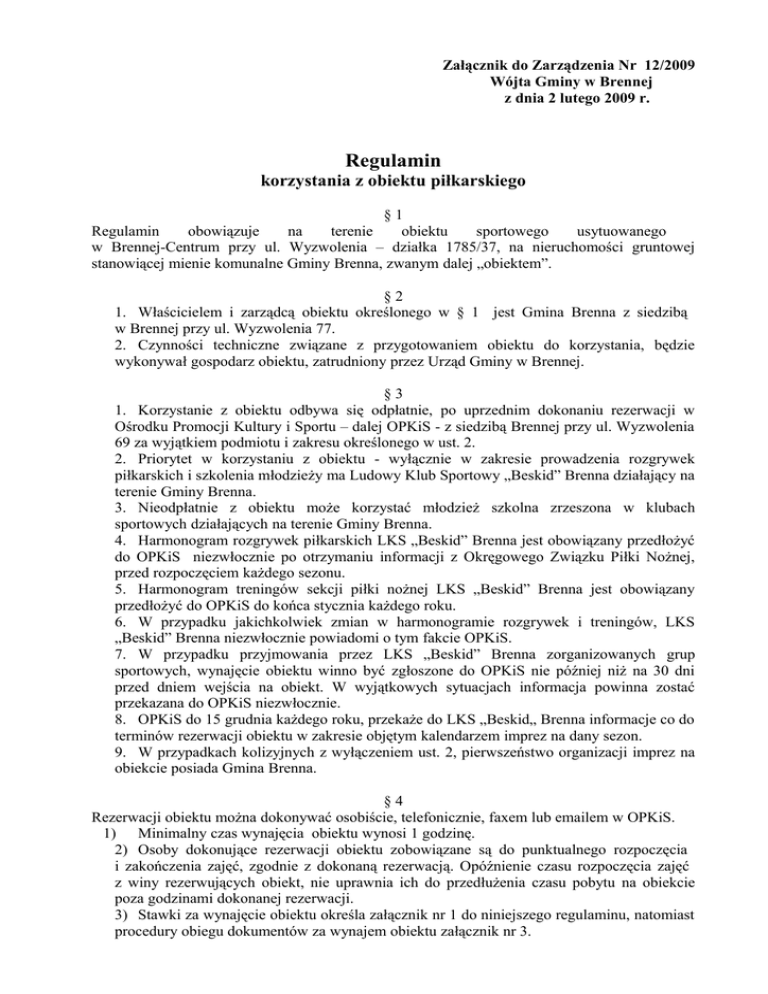 Załącznik do Zarządzenia Nr 12/2009 Wójta Gminy w Brennej z dnia 2 lutego 2009 r. Regulamin korzystania z obiektu piłkarskiego §1 Regulamin obowiązuje na terenie obiektu sportowego usytuowanego w Brennej-Centrum przy ul. Wyzwolenia – działka 1785/37, na nieruchomości gruntowej stanowiącej mienie komunalne Gminy Brenna, zwanym dalej „obiektem”. §2 1. Właścicielem i zarządcą obiektu określonego w § 1 jest Gmina Brenna z siedzibą w Brennej przy ul. Wyzwolenia 77. 2. Czynności techniczne związane z przygotowaniem obiektu do korzystania, będzie wykonywał gospodarz obiektu, zatrudniony przez Urząd Gminy w Brennej. §3 1. Korzystanie z obiektu odbywa się odpłatnie, po uprzednim dokonaniu rezerwacji w Ośrodku Promocji Kultury i Sportu – dalej OPKiS - z siedzibą Brennej przy ul. Wyzwolenia 69 za wyjątkiem podmiotu i zakresu określonego w ust. 2. 2. Priorytet w korzystaniu z obiektu - wyłącznie w zakresie prowadzenia rozgrywek piłkarskich i szkolenia młodzieży ma Ludowy Klub Sportowy „Beskid” Brenna działający na terenie Gminy Brenna. 3. Nieodpłatnie z obiektu może korzystać młodzież szkolna zrzeszona w klubach sportowych działających na terenie Gminy Brenna. 4. Harmonogram rozgrywek piłkarskich LKS „Beskid” Brenna jest obowiązany przedłożyć do OPKiS niezwłocznie po otrzymaniu informacji z Okręgowego Związku Piłki Nożnej, przed rozpoczęciem każdego sezonu. 5. Harmonogram treningów sekcji piłki nożnej LKS „Beskid” Brenna jest obowiązany przedłożyć do OPKiS do końca stycznia każdego roku. 6. W przypadku jakichkolwiek zmian w harmonogramie rozgrywek i treningów, LKS „Beskid” Brenna niezwłocznie powiadomi o tym fakcie OPKiS. 7. W przypadku przyjmowania przez LKS „Beskid” Brenna zorganizowanych grup sportowych, wynajęcie obiektu winno być zgłoszone do OPKiS nie później niż na 30 dni przed dniem wejścia na obiekt. W wyjątkowych sytuacjach informacja powinna zostać przekazana do OPKiS niezwłocznie. 8. OPKiS do 15 grudnia każdego roku, przekaże do LKS „Beskid„ Brenna informacje co do terminów rezerwacji obiektu w zakresie objętym kalendarzem imprez na dany sezon. 9. W przypadkach kolizyjnych z wyłączeniem ust. 2, pierwszeństwo organizacji imprez na obiekcie posiada Gmina Brenna. §4 Rezerwacji obiektu można dokonywać osobiście, telefonicznie, faxem lub emailem w OPKiS. 1) Minimalny czas wynajęcia obiektu wynosi 1 godzinę. 2) Osoby dokonujące rezerwacji obiektu zobowiązane są do punktualnego rozpoczęcia i zakończenia zajęć, zgodnie z dokonaną rezerwacją. Opóźnienie czasu rozpoczęcia zajęć z winy rezerwujących obiekt, nie uprawnia ich do przedłużenia czasu pobytu na obiekcie poza godzinami dokonanej rezerwacji. 3) Stawki za wynajęcie obiektu określa załącznik nr 1 do niniejszego regulaminu, natomiast procedury obiegu dokumentów za wynajem obiektu załącznik nr 3. §5 Osoby korzystające z obiektu obowiązane są do wpisywania się do „Rejestru użytkowników” prowadzonego przez gospodarza obiektu, którego wzór stanowi załącznik nr 2 do niniejszego regulaminu. §6 Korzystający z obiektu zobowiązani są do używania odpowiednich strojów sportowych oraz obuwia sportowego. §7 Osoby prowadzące zajęcia są odpowiedzialne za bezpieczeństwo oraz za właściwą organizację zajęć, porządek i dyscyplinę korzystających z obiektu. §8 Prowadzący zajęcia powinien sprawdzić stan techniczny obiektu i urządzeń, z których będzie korzystał. W przypadku zauważenia usterek zobowiązany jest zgłosić ten fakt gospodarzowi obiektu. §9 Na terenie obiektu zabrania się: • poruszania się na quadach, motorach, rowerach, rolkach, deskorolkach i innym podobnym sprzęcie, • wprowadzania i użytkowania sprzętu innego niż zgodnego z przeznaczeniem obiektu, • niszczenia urządzeń sportowych i płyty obiektu, • wchodzenia na ogrodzenie i urządzenia sportowe, • palenia tytoniu, wnoszenia jedzenia, • spożywania i przebywania pod wpływem alkoholu, • przyjmowania i przebywania pod wpływem narkotyków, • zaśmiecania, wnoszenia napojów w szklanych opakowaniach, • przeszkadzania w zajęciach lub grze, • zakłócania porządku i używania słów wulgarnych, • przebywania na terenie osobom poniżej 15 roku życia po zmroku z wyjątkiem zorganizowanych grup sportowych, • wprowadzania zwierząt z zastrzeżeniem z wyłączeniem pokazów organizowanych w ramach imprez rekreacyjnych, • zabrania się wnoszenia na teren obiektu materiałów i przedmiotów niebezpiecznych, a w szczególności butelek, puszek itp. § 10 Za szkody materialne powstałe na skutek nieprawidłowego korzystania z obiektu i znajdujących się na nim urządzeń odpowiadają korzystający, a w przypadku osób niepełnoletnich – ich opiekunowie lub rodzice. Przy pokryciu powstałych szkód uwzględnia się również koszty robocizny. § 11 Zabrania się korzystania z obiektu w godzinach nocnych. § 12 Wszystkich użytkowników obiektu obowiązuje ścisłe przestrzeganie przepisów bhp oraz zachowanie porządku, czystości i estetyki na terenie całego obiektu i w jego bezpośrednim otoczeniu. § 13 Zarządzający boiskiem zastrzega sobie prawo do odwołania zaplanowanych wcześniej zajęć na obiekcie w celu przeprowadzenia imprez sportowo – rekreacyjnych lub widowiskowych, po uprzednim uzgodnieniu z zainteresowanymi. § 14 Korzystający i przebywający na terenie obiektu zobowiązani są do przestrzegania zaleceń zawartych w niniejszym regulaminie ponosząc pełna odpowiedzialność za własne działania i zaniechania, w tym następstwa ewentualnych wypadków, szkód na osobie i mieniu. § 15 Wejście na obiekt jest równoznaczne z przyjęciem i przestrzeganiem regulaminu. § 16 Regulamin obowiązuje od 2 lutego 2009 r.
