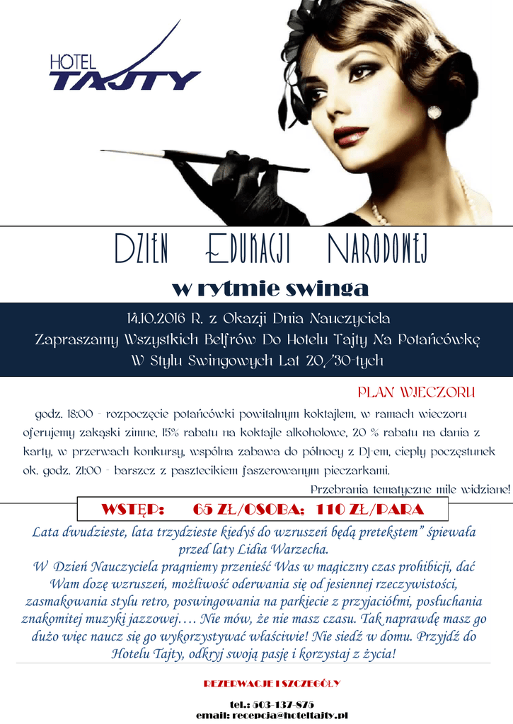 w rytmie swinga 14.10.2016 R. z Okazji Dnia Nauczyciela Zapraszamy Wszystkich Belfrów Do Hotelu Tajty Na Potańcówkę W Stylu Swingowych Lat 20/30-tych PLAN WIECZORU godz. 18:00 - rozpoczęcie potańcówki powitalnym koktajlem, w ramach wieczoru oferujemy zakąski zimne, 15% rabatu na koktajle alkoholowe, 20 % rabatu na dania z karty, w przerwach konkursy, wspólna zabawa do północy z DJ-em, ciepły poczęstunek ok. godz. 21:00 - barszcz z pasztecikiem faszerowanym pieczarkami. Przebrania tematyczne mile widziane! WSTĘP: 65 ZŁ/OSOBA; 110 ZŁ/PARA Lata dwudzieste, lata trzydzieste kiedyś do wzruszeń będą pretekstem” śpiewała przed laty Lidia Warzecha. W Dzień Nauczyciela pragniemy przenieść Was w magiczny czas prohibicji, dać Wam dozę wzruszeń, możliwość oderwania się od jesiennej rzeczywistości, zasmakowania stylu retro, poswingowania na parkiecie z przyjaciółmi, posłuchania znakomitej muzyki jazzowej…. Nie mów, że nie masz czasu. Tak naprawdę masz go dużo więc naucz się go wykorzystywać właściwie! Nie siedź w domu. Przyjdź do Hotelu Tajty, odkryj swoją pasję i korzystaj z życia! REZERWACJE I SZCZEGÓŁY tel.: 503-137-875 email: [email protected]