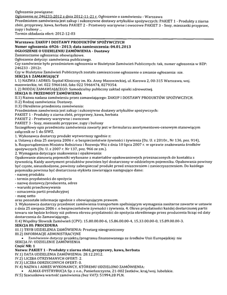 Ogloszenie powiqzane: Ogioszenie nr 246233-2012 z dnia 2012-11-21 r. Ogloszenie o zamowieniu - Warszawa Przedmiotem zamowienia jest zakup i sukcesywne dostawy artykulow spozywczych: PAKIET 1- Produkty z ziarna zboi, przyprawy, kawa, herbata PAKIET 2 - Przetwory warzywne i owocowe PAKIET 3 - Sosy, mieszanki przypraw, zupy i buliony ... Termin skladania ofert: 2012-12-03 - Warszawa: ZAKUP I DOSTAWY PRODUKTOW SPOZWCZYCH Numer ogloszenia: 6926 2013; data zamieszczenia: 04.01.2013 OGLOSZENIE 0 UDZIELENIU ZAMOWIENIA - Dostawy Zamieszczanie ogloszenia: obowiqzkowe. Ogloszenie dotyczy: zamowienia publicznego. Czy zambwienie bylo przedmiotem ogloszenia w Biuletynie Zamowien Publicznych: tak, numer ogloszenia w BZP: 246233 - 2012r. Czy w Biuletynie Zamowien Publicznych zostalo zamieszczone ogloszenie o zmianie ogloszenia: nie. SEKCJAI: ZAMAWIAJACY I. 1) NAZWA I ADRES: SzpitaI KIiniczny im. Ks. Anny Mazowieckiej, ul. Karowa 2,OO-315 Warszawa, woj. mazowieckie, tel. 022 5966160, faks 022 5966474,8279354. I. 2) RODZAJ ZAMAWIAJqCEGO:Samodzielny publiczny zaktad opieki zdrowotnej. SEKCJA11: PRZEDMIOT ZAMOWIENIA 11.1) Nazwa nadana zamowieniu przez zamawiajqcego: ZAKUP I DOSTAWY PRODUKTOWSPOZYWCZYCH. 11.2) Rodzaj zamowienia: Dostawy. 11.3) OkreSlenie przedmiotu zambwienia: Przedmiotem zamowienia jest zakup i sukcesywne dostawy artykulow spozywczych: PAKIET 1- Produkty z ziarna zboi, przyprawy, kawa, herbata PAKIET 2 - Przetwory warzywne i owocowe PAKIET 3 - Sosy, mieszanki przypraw, zupy i buliony Szczegolowy opis przedmiotu zamowienia zawarty jest w formularzu asortymentowo-cenowym stanowiqcym zalqcznik nr 1do SIWZ. 1.Wykonawca dostarczy produkt wytworzony zgodnie z: a. Ustawq z dnia 25 sierpnia 2006 r. o bezpieczeristwie zywnoSci i iywienia (Dz. U. z 2010r., Nr 136, poz. 914), b. Rozporzqdzeniem Ministra Rolnictwa i Rozwoju Wsi z dnia 1 0 lipca 2007 r. w sprawie znakowania Srodkdw spozywczych (Dz. U. z 2007 r. Nr 137, poz. 966 ze zm.). 2. Wymagania dotyczqce znakowania i opakowania: Opakowanie stanowiq pojemniki wykonane z materialow opakowaniowych przeznaczonych do kontaktu z zywnoiciq. Kazdy asortyment produktdw powinien by6 dostarczony w oddzielnym pojemniku. Opakowania powinny bye czyste, nieuszkodzone, powinny zabezpieczat produkt przed zniszczeniem i zanieczyszczeniem. Do kazdego pojemnika powinna by6 dostarczona etykieta zawierajqca nastqpujqce dane: - nazwq produktu - termin przydatnoSci do spoiycia - nazwq dostawcy/producenta, adres - warunki przechowywania - oznaczenia partii produkcyjnej - masq netto oraz pozostale informacje zgodnie z obowiqzujqcym prawem. 3. Wykonawca dostarczy przedmiot zamowienia transportem spelniajqcym wymagania sanitarne zawarte w ustawie z dnia 25 sierpnia 2006 r, o bezpieczenstwie zywnoSci i zywienia. 4. Okres przydatnoSci kaidej dostarczonej partii towaru nie bqdzie krotszy nii polowa okresu przydatnoici do spoiycia okreilonego przez producenta liczqc od daty dostarczenia do Zamawiajqcego.. 11.4)Wsp6lny Slownik Zam6wieh (CPV): 15.80.00.00-6,15.86.00.00-4,15.33.00.00-0,15.89.00.00-3. SEKCJA111:PROCEDURA 111.1)TRYB UDZIELENIA ZAMOWIENIA: Przetarg nieograniczony 111.2) INFORMACJEADMINISTRACYJNE Zam6wienie dotyczy projektu/programu finansowanego ze Srodkow Unii Europejskiej: nie SEKCJAIV: UDZIELENIE ZAMOWIENIA Czqii. NR: 1 Nazwa: PAKIET 1 - Produkty z ziarna zboz, przyprawy, kawa, herbata IV.l) DATA UDZIELENIA ZAMOWIENIA: 28.12.2012. IV.2) LICZBA OTRZYMANYCH OFERT: 2. IV.3) LICZBA ODRZUCONYCH OFERT: 0. IV.4) NAZWA I ADRES WYKONAWCY, KTOREMU UDZIELONO ZAMOWIENIA: ALMAX-DYSTRYBUCJASp. z o.o., Panieliszczyzna, 21-002 Jastkow, kraj/woj. lubelskie. IV.5) Szacunkowa wartoS6 zamowienia (bez VAT): 51994,28 PLN. - IV.6) INFORMACJA 0 CENIE WYBRANEJ OFERTY ORAZ 0 OFERTACH Z NAJNIzsz~I NAJWYZSZ~ CENq Cena wybranej oferty: 52627,62 Oferta z najnizszq cenq: 52627,62 / Oferta z najwyzszq cenq: 60473,80 Waluta: PLN. CzqsC NR: 2 Nazwa: PAKIET 2 - Przetwory warzywne i owocowe IV.1) DATA UDZIELENIA ZAMOWIENIA: 28.12.2012. IV.2) LICZBA OTRZYMANYCH OFERT: 2. IV.3) LICZBA ODRZUCONYCH OFERT: 0. 1v.4) NAZWA I ADRES WYKONAWCY, KTOREMU UDZIELONO ZAMOWIENIA: Przedsiqbiorstwo-Produkcyjno-HandlowePOLARIS Maigorzata Gruszczynska, ul. ~ o i n i e r s k a20a, 62-800 Kalisz, kraj/woj, wielkopolskie. 1V.5) Szacunkowa wartoft zam6wienia (bez VAT): 11750,71 PLN. IV.6) INFORMACJA 0 CENIE WYBRANEJ OFERTY ORAZ 0 OFERTACH Z N A J N I Z S ZI ~NAJWYZSZ~ CENq Cena wybranej oferty: 14170,61 Oferta z najnizszq cenq: 14170,61 / Oferta z najwyzszq cenq: 15573,39 Waluta: PLN. CzqsC NR: 3 Nazwa: PAKIET 3 - Sosy, mieszanki przypraw, zupy i buliony IV.l) DATA UDZIELENIA ZAMOWIENIA: 28.12.2012. IV.2) LICZBA OTRZYMANYCH OFERT: 2. IV.3) LICZBA ODRZUCONYCH OFERT: 0. 1v.4) NAZWA I ADRES WYKONAWCY, KTOREMU UDZIELONO ZAMOWIENIA: ALMAX-DYSTRYBUCJASp. z o.o., Panienszczyzna, 21-002 Jastkbw, kraj/woj. lubelskie. IV.5) Szacunkowa wartoit zam6wienia (bez VAT): 9898,05 PLN. IV.6) INFORMACJA 0 CENIE WYBRANEJ OFERTY ORAZ 0 OFERTACH Z N A J N I Z S Z ~I N A J W Z S Z ~ CENq Cena wybranej oferty: 11113,29 Oferta z najnizszq cenq: 11113,29 / Oferta z najwyzszq cenq: 12748,69 Waluta: PLN.