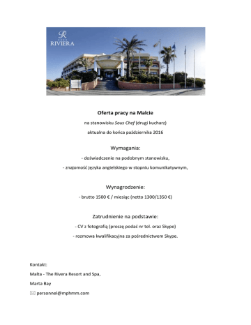 Oferta pracy na Malcie na stanowisku Sous Chef (drugi kucharz) aktualna do końca października 2016 Wymagania: - doświadczenie na podobnym stanowisku, - znajomość języka angielskiego w stopniu komunikatywnym, Wynagrodzenie: - brutto 1500 € / miesiąc (netto 1300/1350 €) Zatrudnienie na podstawie: - CV z fotografią (proszę podać nr tel. oraz Skype) - rozmowa kwalifikacyjna za pośrednictwem Skype. Kontakt: Malta - The Rivera Resort and Spa, Marta Bay  [email protected]