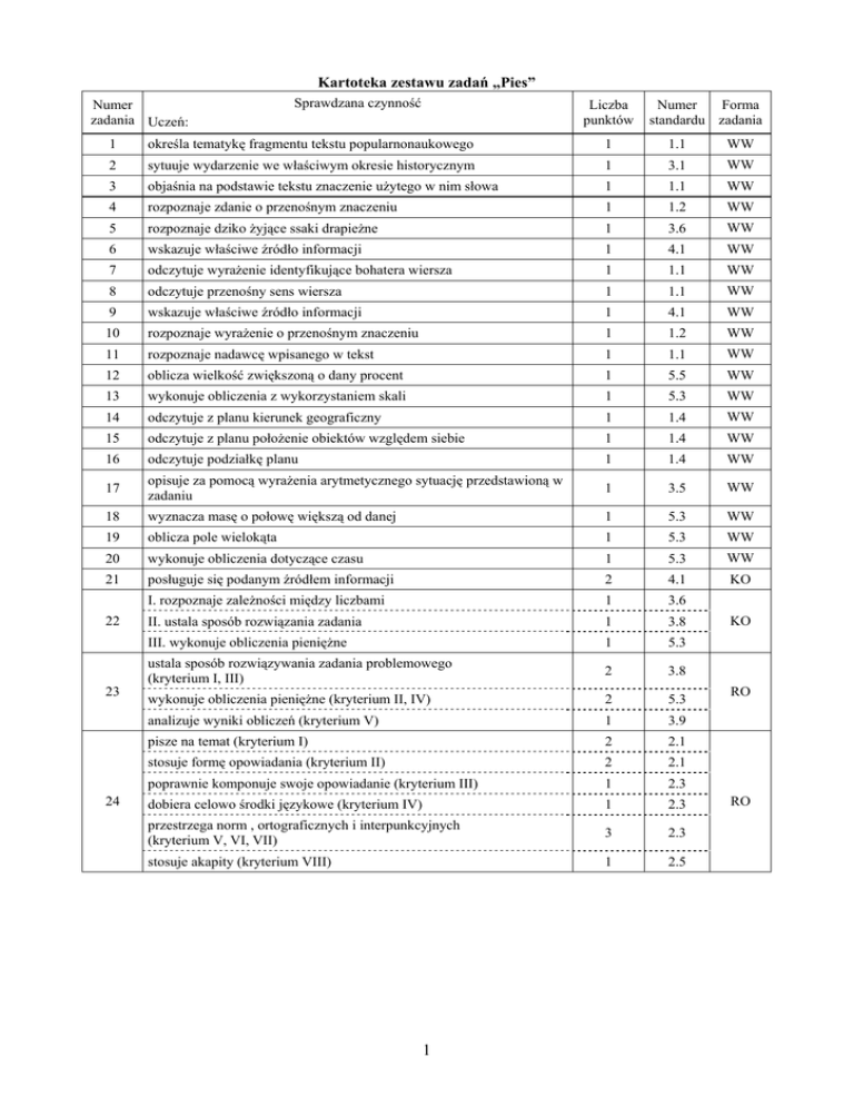 Kartoteka zestawu zadań „Pies” Numer zadania Uczeń: Sprawdzana czynność Liczba punktów Numer Forma standardu zadania 1 określa tematykę fragmentu tekstu popularnonaukowego 1 1.1 WW 2 sytuuje wydarzenie we właściwym okresie historycznym 1 3.1 WW 3 objaśnia na podstawie tekstu znaczenie użytego w nim słowa 1 1.1 WW 4 rozpoznaje zdanie o przenośnym znaczeniu 1 1.2 WW 5 rozpoznaje dziko żyjące ssaki drapieżne 1 3.6 WW 6 wskazuje właściwe źródło informacji 1 4.1 WW 7 odczytuje wyrażenie identyfikujące bohatera wiersza 1 1.1 WW 8 odczytuje przenośny sens wiersza 1 1.1 WW 9 wskazuje właściwe źródło informacji 1 4.1 WW 10 rozpoznaje wyrażenie o przenośnym znaczeniu 1 1.2 WW 11 rozpoznaje nadawcę wpisanego w tekst 1 1.1 WW 12 oblicza wielkość zwiększoną o dany procent 1 5.5 WW 13 wykonuje obliczenia z wykorzystaniem skali 1 5.3 WW 14 odczytuje z planu kierunek geograficzny 1 1.4 WW 15 odczytuje z planu położenie obiektów względem siebie 1 1.4 WW 16 odczytuje podziałkę planu 1 1.4 WW 17 opisuje za pomocą wyrażenia arytmetycznego sytuację przedstawioną w zadaniu 1 3.5 WW 18 wyznacza masę o połowę większą od danej 1 5.3 WW 19 oblicza pole wielokąta 1 5.3 WW 20 wykonuje obliczenia dotyczące czasu 1 5.3 WW 21 posługuje się podanym źródłem informacji 2 4.1 KO I. rozpoznaje zależności między liczbami 1 3.6 II. ustala sposób rozwiązania zadania 1 3.8 III. wykonuje obliczenia pieniężne 1 5.3 ustala sposób rozwiązywania zadania problemowego (kryterium I, III) 2 3.8 wykonuje obliczenia pieniężne (kryterium II, IV) 2 5.3 analizuje wyniki obliczeń (kryterium V) 1 3.9 pisze na temat (kryterium I) 2 2.1 stosuje formę opowiadania (kryterium II) 2 2.1 poprawnie komponuje swoje opowiadanie (kryterium III) 1 2.3 dobiera celowo środki językowe (kryterium IV) 1 2.3 przestrzega norm , ortograficznych i interpunkcyjnych (kryterium V, VI, VII) 3 2.3 stosuje akapity (kryterium VIII) 1 2.5 22 23 24 1 KO RO RO Klucz odpowiedzi do zadań zamkniętych zestawu zadań „Pies” Nr zadania Odpowiedź Liczba punktów 1 2 3 4 5 6 7 8 9 10 11 12 13 14 15 16 17 18 19 20 C A D D B C A D A D C B A B B C C D B A Za każdą poprawną odpowiedź uczeń otrzymuje 1 punkt 2 Schemat punktowania zadań otwartych zestawu „Pies” ZADANIE 21. Kryteria i zasady przydzielania punktów Za udzielenie czterech poprawnych odpowiedzi – 2 punkty. Za udzielenie tylko trzech lub dwóch poprawnych odpowiedzi – 1 punkt. Liczba punktów 0-2 Poprawne odpowiedzi: jamnik (pyt. 1.) najwięcej – husky syberyjski (pyt. 2.) najmniej – pekińczyk (pyt. 2.) husky syberyjski i dog (pyt. 3.) Uwagi: • Pytanie 2. składa się z dwóch części i wymaga dwóch niezależnych odpowiedzi (liczonych oddzielnie). • Poprawna odpowiedź na pytanie 3. musi zawierać nazwy dwóch psów. • Uznajemy zapis nazw psów skrócony lub zniekształcony (ale rozpoznawalny), np. husky, haski, pekincz., dok. • Nie uznajemy odpowiedzi „wziętych z życia” (nawet, gdyby były prawdopodobne). Uczeń miał wykazać się umiejętnością wykorzystania informacji z podanego mu źródła. ZADANIE 22. Kryteria i zasady przydzielania punktów Liczba punktów I. Ustalenie kosztu 15 kg karmy w opakowaniach 1,5-kilogramowych Wystarczy, gdy uczeń poda sam wynik. II. Zapis różnicy kosztów 15 kg karmy w opakowaniach 1,5-kilogramowych i 15 kg karmy w jednym opakowaniu 0-1 III. Poprawne obliczenie różnicy 0-1 0-1 Uczeń z dysleksją: W kryteriach I i II łącznie dopuszczamy jedną pomyłkę powstałą przy przepisywaniu liczb: mylenie cyfr podobnych w zapisie, przestawienie sąsiednich cyfr lub opuszczenie cyfry. Przykłady poprawnych rozwiązań: 1) 2) 3) 4) 10 ·1,5 = 15 [kg] 15 : 1,5 = 10 10 ·11 = 110 110 – 74,40 = 35,60 10 ·11 = 110 [zł] 10 ·11 = 110 [zł] 110 – 74,40 = 35,60 110 – 74,40 = 35,60 [zł] 110 – 74,40 = 35,60 [zł] Uwagi ogólne: • Jeśli uczeń poprawnie rozwiązuje zadanie inną metodą niż wskazana w schemacie punktowania, otrzymuje maksymalną liczbę punktów. • Jeśli uczeń podaje tylko odpowiedź, nie otrzymuje punktów. 3 ZADANIE 23. Kryteria i zasady przydzielania punktów Liczba punktów I. Zapis działania prowadzącego do obliczenia kosztu dwóch opakowań po 27,90 zł 0-1 Jeśli uczeń pomija ten etap rozwiązywania zadania, ale dwukrotnie odejmuje 27,90 zł, również otrzymuje punkt. II. Poprawne obliczenie kosztu dwóch opakowań po 27,90 zł 0-1 Jeśli uczeń pomija ten etap rozwiązywania zadania, ale dwukrotnie poprawnie odejmuje 27,90 zł, również otrzymuje punkt. III. Zapis wyrażeń prowadzących do obliczenia kwoty, która zostanie uczniom po zakupie największej możliwej ilości karmy. 0-1 Punkt przyznajemy niezależnie od tego, czy koszt dwóch opakowań został obliczony poprawnie. IV. Poprawne obliczenie kwoty, która zostanie uczniom po zakupie największej możliwej ilości karmy. 0-1 Jeśli błędny wynik jest wyłącznie konsekwencją błędu rachunkowego przy obliczaniu kosztu dwóch opakowań po 27,90 zł, to uczeń również otrzymuje punkt. V. Podanie największej ilości karmy, jaką można kupić za 68,50 zł. 0-1 Jeśli błędna odpowiedź jest wyłącznie konsekwencją błędu rachunkowego, to uczeń również otrzymuje punkt. Uczeń z dysleksją: W kryteriach I i III łącznie dopuszczamy 2 pomyłki powstałe przy przepisywaniu liczb: mylenie cyfr podobnych w zapisie, przestawienie sąsiednich cyfr lub opuszczenie cyfry. Przykłady poprawnych rozwiązań: 1) 2) 3) 4) 2 · 27,90 = 55,80 [zł] 27,90 + 27,90 = 55,80 68,50 – 27,90 = 40,60 2 · 27,90 = 55,80 68,50 – 55,80 = 12,70 [zł] 55,80 + 11 = 66,80 40,60 – 27,90 = 12,70 68,50 – 55,80 = 12,70 12,70 – 11 = 1,70 Odp. 9,5 kg ; 1,70 zł. 12,70 – 11 = 1,70 [zł] 68,50 – 66,80 = 1,70 2 ·4 + 1,5 = 9,5 [kg] Odp. 9,5 kg; 1,70 zł. Odp. 9,5 kg; 1,70 zł Odp. 9,5 kg; 1,70 zł. Uwagi ogólne: • Jeśli uczeń poprawnie rozwiązuje zadanie inną metodą niż wskazana w sch