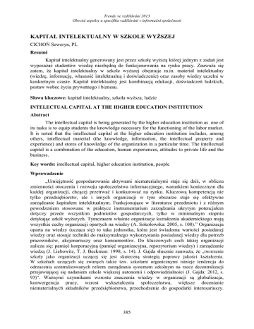 Trendy ve vzdělávání 2013 Obecné aspekty a specifika vzdělávání v informační společnosti KAPITAŁ INTELEKTUALNY W SZKOLE WYŻSZEJ CICHOŃ Seweryn, PL Resumé Kapitał intelektualny generowany jest przez szkołę wyższą której jednym z zadań jest wyposażać studentów wiedzę niezbędną do funkcjonowania na rynku pracy. Zauważa się zatem, że kapitał intelektualny w szkole wyższej obejmuje m.in. materiał intelektualny (wiedzę, informację, własność intelektualną i doświadczenie) oraz zasoby wiedzy uczelni w konkretnym czasie. Kapitał intelektualny jest kombinacją edukacji, doświadczeń ludzkich, postaw wobec życia prywatnego i biznesu. Słowa kluczowe: kapitał intelektualny, szkoła wyższa, ludzie INTELECTUAL CAPITAL AT THE HIGHER EDUCATION INSTITUTION Abstract The intellectual capital is being generated by the higher education institution as one of its tasks is to equip students the knowledge necessary for the functioning of the labor market. It is noted that the intellectual capital at the higher education institution includes, among others, intellectual material (the knowledge, information, the intellectual property and experience) and stores of knowledge of the organization in a particular time. The intellectual capital is a combination of the education, human experiences, attitudes to private life and the business. Key words: intellectual capital, higher education institution, people Wprowadzenie „Umiejętność gospodarowania aktywami niematerialnymi staje się dziś, w obliczu zmienności otoczenia i rozwoju społeczeństwa informacyjnego, warunkiem koniecznym dla każdej organizacji, chcącej przetrwać i konkurować na rynku. Kluczową kompetencją nie tylko przedsiębiorstw, ale i innych organizacji w tym obszarze staje się efektywne zarządzanie kapitałem intelektualnym. Funkcjonujące w literaturze przedmiotu i z różnym powodzeniem stosowane w praktyce instrumentarium zarządzania ukrytym potencjałem dotyczy przede wszystkim podmiotów gospodarczych, tylko w minimalnym stopniu dotykając szkół wyższych. Tymczasem właśnie organizacje kształcenia akademickiego mają wszystkie cechy organizacji opartych na wiedzy (A. Sokołowska: 2005, s. 108).” Organizacja oparta na wiedzy (ucząca się) to taka jednostka, która jest świadoma wartości posiadanej wiedzy oraz stosuje techniki do maksymalnego wykorzystania posiadanej wiedzy dla potrzeb pracowników, akcjonariuszy oraz konsumentów. Do kluczowych cech takiej organizacji zalicza się: pamięć korporacyjną (pamięć organizacyjna, repozytorium wiedzy) i zarządzanie wiedzą (J. Liebowitz, T. J. Beckman: 1998, s. 14). J. Gajda słusznie zauważa, że „tworzenie szkoły jako organizacji uczącej się jest skuteczną strategią poprawy jakości kształcenia. W szkołach uczących się zwanych także tzw. szkołami organicznymi istnieje tendencja do odrzucenia scentralizowanych reform zarządzania systemem szkolnym na rzecz decentralizacji przejawiającej się nadaniem szkole większej autonomii i odpowiedzialności (J. Gajda: 2012, s. 93)”. Ważnymi czynnikami wzrostu znaczenia wiedzy w organizacji są globalizacja, konwergencja pracy, wzrost wykształcenia społeczeństwa, większe docenianie niematerialnych składników przedsiębiorstwa, przechodzenie do gospodarki interesariuszy. 385 Trendy ve vzdělávání 2013 Obecné aspekty a specifika vzdělávání v informační společnosti Sprawne posługiwanie się wiedzą w organizacji przyczynia się do osiągnięcia sukcesu na rynku (L. Kozioł: 2008, s. 520). Kapitał intelektualny w organizacji T. A. Stewart (T. A. Stewart: 2001, s. 13) definiuje kapitał intelektualny jako sumę wszystkiego, co każdy w przedsiębiorstwie wie, a co decyduje o przewadze konkurencyjnej. Jest to wiedza, która umożliwia nadanie elementom składowym jakimi dysponuje organizacja określonej wartości, czyli pozwalająca na przekształcenie jej zasobów w określoną wartość finansową. Kapitał intelektualny można rozumieć również jako zdolności do przekształcania nowych pomysłów w produkty bądź usługi, w związku z czym obejmuje on (R. Booth: 1998, s. 27-28): - ludzi (kompetencje i postawy); - rynek (reputacje, związki z konsumentami); - wiedzę (jawna i ukrytą); - infrastrukturę (procesy, bazy danych); - własność intelektualną (patenty, znaki handlowe). Kapitał intelektualny ma swoje źródło w dwóch nurtach badawczych (J. Ross, G. Ross, N. C. Dragonett, L. Edvinsson: 1998, s. 15). - pierwszy powiązany jest ze strategią kreacji i wykorzystywania wiedzy oraz relacji jaka zachodzi pomiędzy wiedzą a tworzeniem wartości; - drugi odnosi się d sprawozdawczości i podkreśla konieczność rozwoju nowego systemu informacji, pomiaru danych niefinansowych oraz wskazania relacji między wskaźnikami finansowymi i niefinansowymi organizacji. Kapitał intelektualny można sklasyfikować jako kapitał społeczny (strukturalny, wymiar stosunków międzyludzkich, poznawczy), ludzki (obejmuje kompetentność, zdolność intelektualną, motywację) i organizacyjny (struktura wewnętrzna, zewnętrzna, kapitał rozwojowy) (M. Rybak: 2003, s. 36). Kapitał intelektualny organizacji zorientowanej na usługi edukacyjne M. Kluska - Nowicka słusznie zauważa, iż „należy podjąć konkretne działania, by stworzyć najlepsze warunki akademickie dla rozwoju przedsiębiorczości, wzrostu zasobów ludzkich i kapitału organizacyjnego, po to by zapewnić przyjazne środowisko do rozwoju i przedsiębiorczości. W przeciwnym razie Polska narażona zostanie na znaczny ubytek cennego kapitału ludzkiego w wyniku migracji najlepszych studentów, pracowników, naukowców i przedsiębiorców do krajów, w których panować będą lepsze warunki działania i wzrostu. Zapewnienie wysokiej jakości kapitału intelektualnego może zostać zrealizowane poprzez podniesienie jakości nauczania, ukierunkowanie i dostosowanie szkolnictwa wyższego do potrze