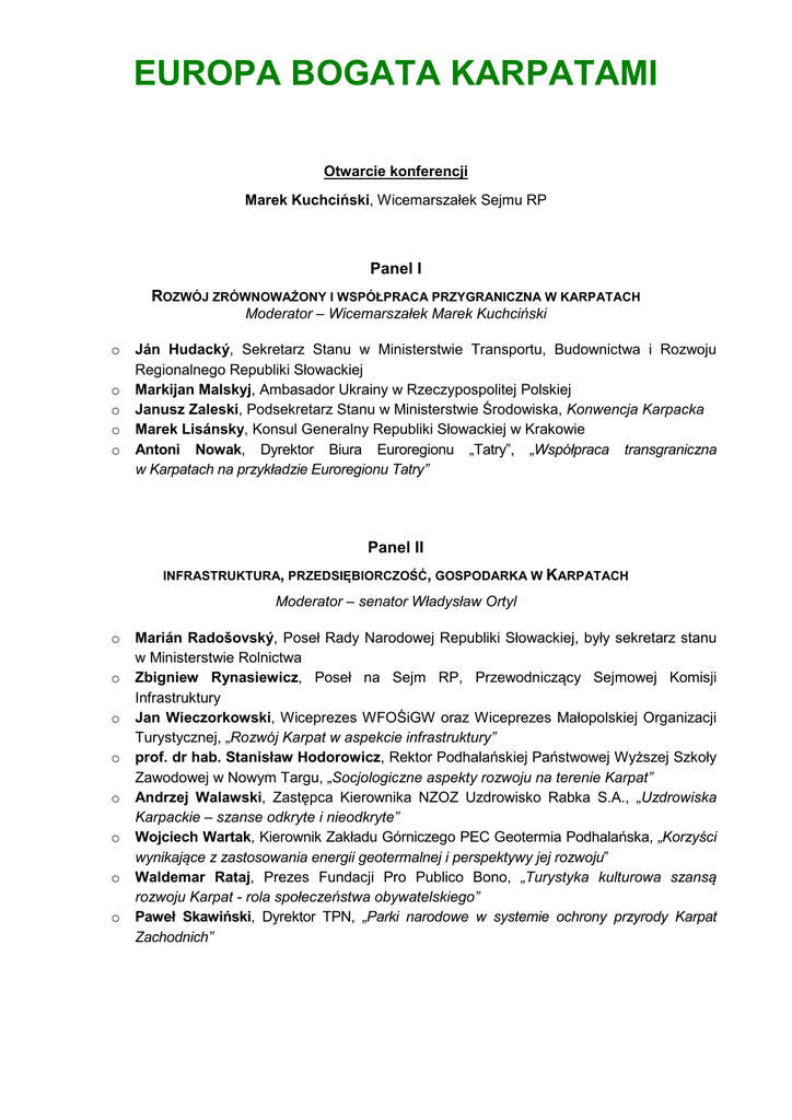 EUROPA BOGATA KARPATAMI Otwarcie konferencji Marek Kuchciński, Wicemarszałek Sejmu RP Panel I ROZWÓJ ZRÓWNOWAŻONY I WSPÓŁPRACA PRZYGRANICZNA W KARPATACH Moderator – Wicemarszałek Marek Kuchciński o o o o o Ján Hudacký, Sekretarz Stanu w Ministerstwie Transportu, Budownictwa i Rozwoju Regionalnego Republiki Słowackiej Markijan Malskyj, Ambasador Ukrainy w Rzeczypospolitej Polskiej Janusz Zaleski, Podsekretarz Stanu w Ministerstwie Środowiska, Konwencja Karpacka Marek Lisánsky, Konsul Generalny Republiki Słowackiej w Krakowie Antoni Nowak, Dyrektor Biura Euroregionu „Tatry”, „Współpraca transgraniczna w Karpatach na przykładzie Euroregionu Tatry” Panel II INFRASTRUKTURA, PRZEDSIĘBIORCZOŚĆ, GOSPODARKA W KARPATACH Moderator – senator Władysław Ortyl o o o o o o o o Marián Radošovský, Poseł Rady Narodowej Republiki Słowackiej, były sekretarz stanu w Ministerstwie Rolnictwa Zbigniew Rynasiewicz, Poseł na Sejm RP, Przewodniczący Sejmowej Komisji Infrastruktury Jan Wieczorkowski, Wiceprezes WFOŚiGW oraz Wiceprezes Małopolskiej Organizacji Turystycznej, „Rozwój Karpat w aspekcie infrastruktury” prof. dr hab. Stanisław Hodorowicz, Rektor Podhalańskiej Państwowej Wyższej Szkoły Zawodowej w Nowym Targu, „Socjologiczne aspekty rozwoju na terenie Karpat” Andrzej Walawski, Zastępca Kierownika NZOZ Uzdrowisko Rabka S.A., „Uzdrowiska Karpackie – szanse odkryte i nieodkryte” Wojciech Wartak, Kierownik Zakładu Górniczego PEC Geotermia Podhalańska, „Korzyści wynikające z zastosowania energii geotermalnej i perspektywy jej rozwoju” Waldemar Rataj, Prezes Fundacji Pro Publico Bono, „Turystyka kulturowa szansą rozwoju Karpat - rola społeczeństwa obywatelskiego” Paweł Skawiński, Dyrektor TPN, „Parki narodowe w systemie ochrony przyrody Karpat Zachodnich” Panel III MARKA KARPACKA Moderator – poseł Edward Siarka o o o o o o Pavol Mačala, Dyrektor Słowackiego Instytutu Historycznego Macierzy Słowackiej Jan Janczy, Dyrektor Regionalnego Związku Hodowli Owiec i Kóz w Nowym Targu, „Historia pasterstwa w Karpatach. Stan i perspektywy rozwoju owczarstwa na terenach górskich z uwzględnieniem ochrony krajobrazu” Jadwiga Pilch, etnograf, kustosz Muzeum - Orawski Park Etnograficzny w Zubrzycy Górnej, „Architektura drewniana, styl życia, obyczaje produkty regionalne Karpat” Antoni Szlagor, Burmistrz Miasta Żywiec, Prezes Koalicji Marek Ziem Górskich, „Marki Górskie szansą rozwoju regionów górskich” Stanisława Trebunia–Staszel, Dyrektor Artystyczny Międzynarodowego Festiwalu Ziem Górskich w Zakopanem, „Międzynarodowy Festiwal Ziem Górskich w Zakopanem. Jego rola w propagowaniu kultury regionu” Maciej Motor Grelok, Prezes Związku Podhalan, „Rola stowarzyszeń w promowaniu regionu Karpat na przykładzie Związku Podhalan”