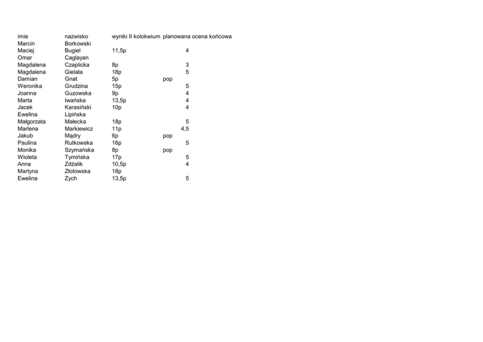 imie Marcin Maciej Omar Magdalena Magdalena Damian Weronika Joanna Marta Jacek Ewelina Małgorzata Marlena Jakub Paulina Monika Wioleta Anna Martyna Ewelina nazwisko Borkowski Bugiel Caglayan Czaplicka Gielata Gnat Grudzina Guzowska Iwańska Karasiński Lipińska Małecka Markiewicz Mądry Rutkowska Szymańska Tymińska Zdżalik Złotowska Zych wyniki II kolokwium planowana ocena końcowa 11,5p 4 8p 18p 5p 15p 9p 13,5p 10p 3 5 18p 11p 6p 16p 8p 17p 10,5p 18p 13,5p pop 5 4 4 4 5 4,5 pop 5 pop 5 4 5