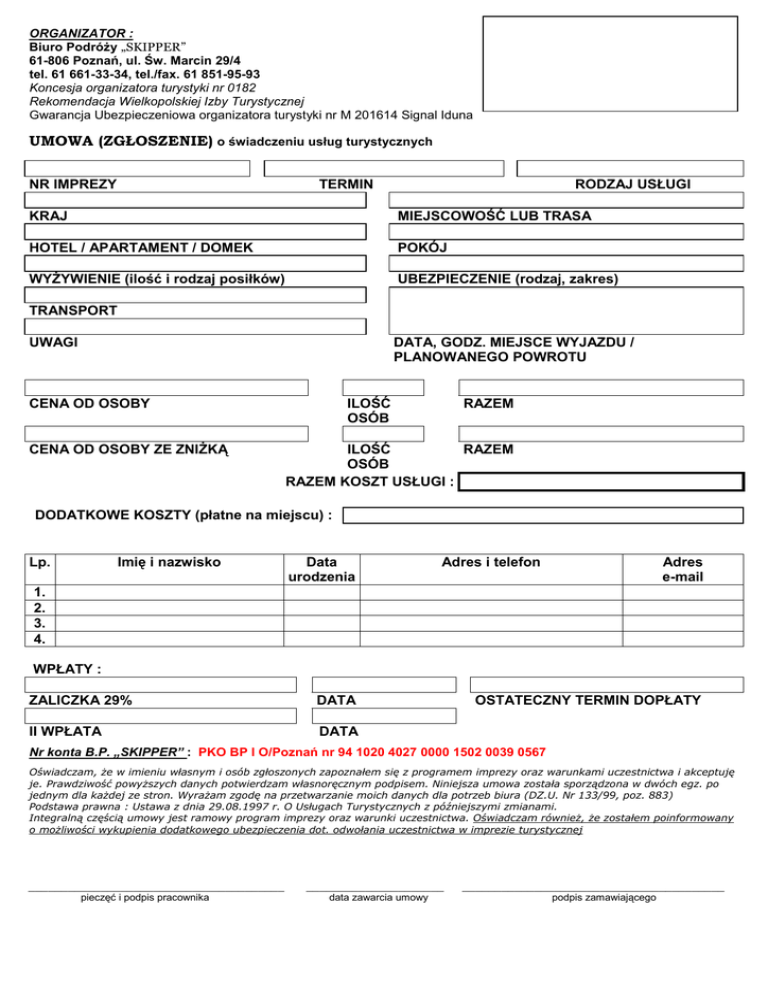 ORGANIZATOR : Biuro Podróży „SKIPPER” 61-806 Poznań, ul. Św. Marcin 29/4 tel. 61 661-33-34, tel./fax. 61 851-95-93 Koncesja organizatora turystyki nr 0182 Rekomendacja Wielkopolskiej Izby Turystycznej Gwarancja Ubezpieczeniowa organizatora turystyki nr M 201614 Signal Iduna UMOWA (ZGŁOSZENIE) o świadczeniu usług turystycznych NR IMPREZY TERMIN RODZAJ USŁUGI KRAJ MIEJSCOWOŚĆ LUB TRASA HOTEL / APARTAMENT / DOMEK POKÓJ WYŻYWIENIE (ilość i rodzaj posiłków) UBEZPIECZENIE (rodzaj, zakres) TRANSPORT UWAGI DATA, GODZ. MIEJSCE WYJAZDU / PLANOWANEGO POWROTU CENA OD OSOBY CENA OD OSOBY ZE ZNIŻKĄ ILOŚĆ OSÓB RAZEM ILOŚĆ RAZEM OSÓB RAZEM KOSZT USŁUGI : DODATKOWE KOSZTY (płatne na miejscu) : Lp. Imię i nazwisko Data urodzenia Adres i telefon Adres e-mail 1. 2. 3. 4. WPŁATY : ZALICZKA 29% DATA II WPŁATA DATA OSTATECZNY TERMIN DOPŁATY Nr konta B.P. „SKIPPER” : PKO BP I O/Poznań nr 94 1020 4027 0000 1502 0039 0567 Oświadczam, że w imieniu własnym i osób zgłoszonych zapoznałem się z programem imprezy oraz warunkami uczestnictwa i akceptuję je. Prawdziwość powyższych danych potwierdzam własnoręcznym podpisem. Niniejsza umowa została sporządzona w dwóch egz. po jednym dla każdej ze stron. Wyrażam zgodę na przetwarzanie moich danych dla potrzeb biura (DZ.U. Nr 133/99, poz. 883) Podstawa prawna : Ustawa z dnia 29.08.1997 r. O Usługach Turystycznych z późniejszymi zmianami. Integralną częścią umowy jest ramowy program imprezy oraz warunki uczestnictwa. Oświadczam również, że zostałem poinformowany o możliwości wykupienia dodatkowego ubezpieczenia dot. odwołania uczestnictwa w imprezie turystycznej _______________________________________ pieczęć i podpis pracownika _____________________ data zawarcia umowy ________________________________________ podpis zamawiającego
