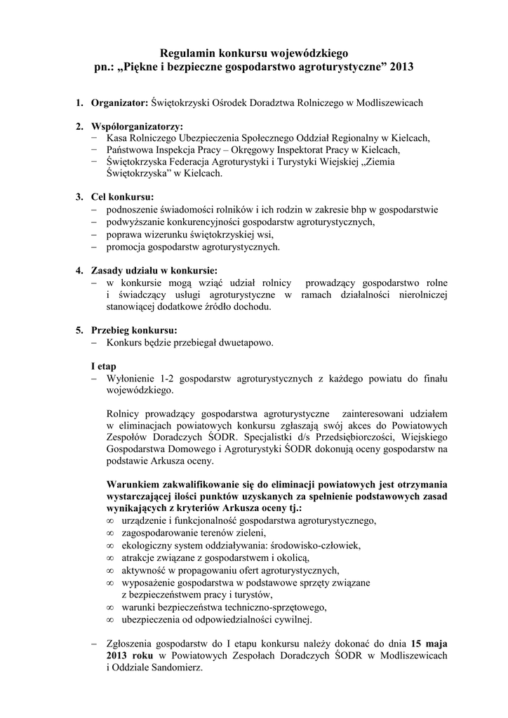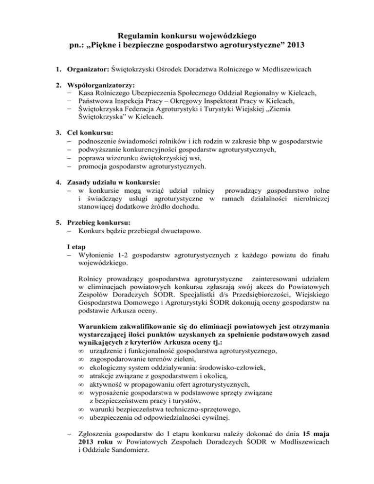 Regulamin konkursu wojewódzkiego pn.: „Piękne i bezpieczne gospodarstwo agroturystyczne” 2013 1. Organizator: Świętokrzyski Ośrodek Doradztwa Rolniczego w Modliszewicach 2. Współorganizatorzy: − Kasa Rolniczego Ubezpieczenia Społecznego Oddział Regionalny w Kielcach, − Państwowa Inspekcja Pracy – Okręgowy Inspektorat Pracy w Kielcach, − Świętokrzyska Federacja Agroturystyki i Turystyki Wiejskiej „Ziemia Świętokrzyska” w Kielcach. 3. Cel konkursu: − podnoszenie świadomości rolników i ich rodzin w zakresie bhp w gospodarstwie − podwyŜszanie konkurencyjności gospodarstw agroturystycznych, − poprawa wizerunku świętokrzyskiej wsi, − promocja gospodarstw agroturystycznych. 4. Zasady udziału w konkursie: − w konkursie mogą wziąć udział rolnicy prowadzący gospodarstwo rolne i świadczący usługi agroturystyczne w ramach działalności nierolniczej stanowiącej dodatkowe źródło dochodu. 5. Przebieg konkursu: − Konkurs będzie przebiegał dwuetapowo. I etap − Wyłonienie 1-2 gospodarstw agroturystycznych z kaŜdego powiatu do finału wojewódzkiego. Rolnicy prowadzący gospodarstwa agroturystyczne zainteresowani udziałem w eliminacjach powiatowych konkursu zgłaszają swój akces do Powiatowych Zespołów Doradczych ŚODR. Specjalistki d/s Przedsiębiorczości, Wiejskiego Gospodarstwa Domowego i Agroturystyki ŚODR dokonują oceny gospodarstw na podstawie Arkusza oceny. Warunkiem zakwalifikowanie się do eliminacji powiatowych jest otrzymania wystarczającej ilości punktów uzyskanych za spełnienie podstawowych zasad wynikających z kryteriów Arkusza oceny tj.: • urządzenie i funkcjonalność gospodarstwa agroturystycznego, • zagospodarowanie terenów zieleni, • ekologiczny system oddziaływania: środowisko-człowiek, • atrakcje związane z gospodarstwem i okolicą, • aktywność w propagowaniu ofert agroturystycznych, • wyposaŜenie gospodarstwa w podstawowe sprzęty związane z bezpieczeństwem pracy i turystów, • warunki bezpieczeństwa techniczno-sprzętowego, • ubezpieczenia od odpowiedzialności cywilnej. − Zgłoszenia gospodarstw do I etapu konkursu naleŜy dokonać do dnia 15 maja 2013 roku w Powiatowych Zespołach Doradczych ŚODR w Modliszewicach i Oddziale Sandomierz. II etap: − Powołanie przez ŚODR Modliszewice Komisji konkursowej – do 22 maja 2013 roku. − Wybór przez Komisję konkursową 1 gospodarstwa agroturystycznego z kaŜdego powiatu (Kielce 2 gospodarstwa) na podstawie weryfikacji Arkuszy oceny, przesłanych do ŚODR Modliszewice. W przypadku niedostatecznej liczby zgłoszeń, zostanie zwiększony limit gospodarstw w poszczególnych powiatach do finału wojewódzkiego. − Lustracja i ocena przez przedstawicieli Komisji konkursowej gospodarstw zakwalifikowanych do finału wojewódzkiego od 27 do 31 maja 2013 roku. − Wyłonienie 5 laureatów: I, II i III miejsca oraz dwóch wyróŜnień. − Uroczyste ogłoszenie wyników i wręczenie nagród – 30 czerwca 2013 roku podczas Dni Otwartych Drzwi w ŚODR Modliszewice. − Fundatorzy nagród w konkursie: organizator konkursu i współorganizatorzy Warunkiem odbioru nagród przez laureatów jest uiszczenie podatku dochodowego od osób fizycznych zgodnie z obowiązującymi przepisami podatkowymi (Dz. U. z 2000 r., Nr 14, poz. 176, ze zmianami). 6. Inne: − Właściciele gospodarstw agroturystycznych zakwalifikowanych do finału wojewódzkiego zostaną poinformowani o terminie wizyty Komisji konkursowej w gospodarstwie. − Laureaci konkursu zostaną powiadomieni o miejscu i terminie wręczenia nagród do 24 czerwca 2013 roku. − Organizatorowi przysługuje prawo przetwarzania i wykorzystywania danych gospodarstw agroturystycznych - laureatów konkursu w celu promocji na stronach internetowych ŚODR, w publikacjach, mediach. − Wszystkie koszty związane z udziałem w I jak i II etapie konkursu pokrywa uczestnik konkursu. − W konkursie nie mogą brać udziału laureaci ostatnich trzech edycji konkursu „Piękne i bezpieczne gospodarstwo agroturystyczne”. − Organizator zastrzega sobie prawo do dokonania zmian w Regulaminie konkursu.