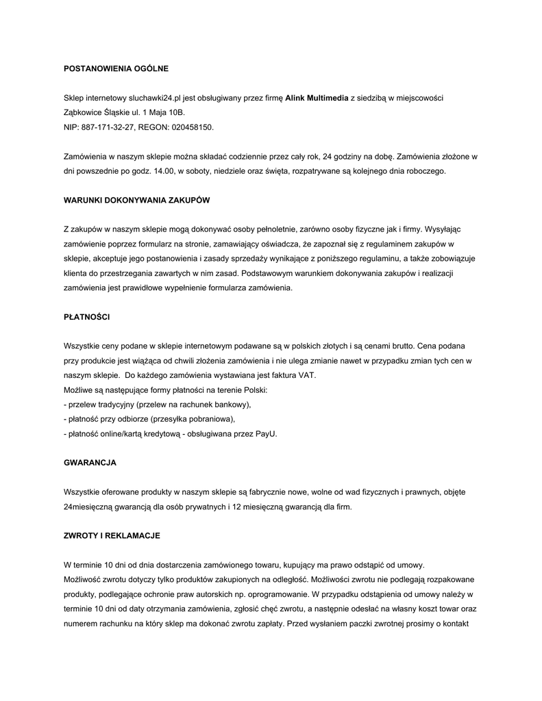 POSTANOWIENIA OGÓLNE Sklep internetowy