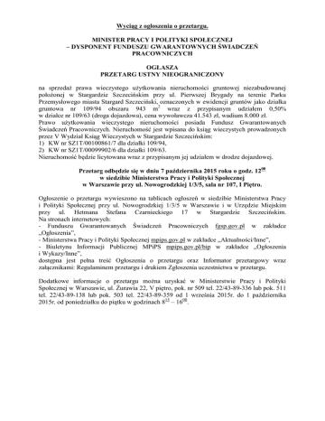 Wyciąg z ogłoszenia o przetargu. MINISTER PRACY I POLITYKI SPOŁECZNEJ – DYSPONENT FUNDUSZU GWARANTOWNYCH ŚWIADCZEŃ PRACOWNICZYCH OGŁASZA PRZETARG USTNY NIEOGRANICZONY na sprzedaż prawa wieczystego użytkowania nieruchomości gruntowej niezabudowanej położonej w Stargardzie Szczecińskim przy ul. Pierwszej Brygady na terenie Parku Przemysłowego miasta Stargard Szczeciński, oznaczonych w ewidencji gruntów jako działka gruntowa nr 109/94 obszaru 943 m2 wraz z przypisanym udziałem 0,50% w działce nr 109/63 (droga dojazdowa), cena wywoławcza 41.543 zł, wadium 8.000 zł. Prawo użytkowania wieczystego nieruchomości posiada Fundusz Gwarantowanych Świadczeń Pracowniczych. Nieruchomość jest wpisana do ksiąg wieczystych prowadzonych przez V Wydział Ksiąg Wieczystych w Stargardzie Szczecińskim: 1) KW nr SZ1T/00100861/7 dla działki 109/94, 2) KW nr SZ1T/00099902/6 dla działki 109/63. Nieruchomość będzie licytowana wraz z przypisanym jej udziałem w drodze dojazdowej. Przetarg odbędzie się w dniu 7 października 2015 roku o godz. 1200 w siedzibie Ministerstwa Pracy i Polityki Społecznej w Warszawie przy ul. Nowogrodzkiej 1/3/5, sala nr 107, I Piętro. Ogłoszenie o przetargu wywieszono na tablicach ogłoszeń w siedzibie Ministerstwa Pracy i Polityki Społecznej przy ul. Nowogrodzkiej 1/3/5 w Warszawie i w Urzędzie Miejskim przy ul. Hetmana Stefana Czarnieckiego 17 w Stargardzie Szczecińskim. Na stronach internetowych: - Funduszu Gwarantowanych Świadczeń Pracowniczych fgsp.gov.pl w zakładce „Ogłoszenia”, - Ministerstwa Pracy i Polityki Społecznej mpips.gov.pl w zakładce „Aktualności/Inne”, - Biuletynu Informacji Publicznej MPiPS mpips.gov.pl/bip w zakładce „Ogłoszenia i Wykazy/Inne”, dostępna jest pełna treść Ogłoszenia o przetargu oraz Informator przetargowy wraz załącznikami: Regulaminem przetargu i drukiem Zgłoszenia uczestnictwa w przetargu. Dodatkowe informacje o przetargu można uzyskać w Ministerstwie Pracy i Polityki Społecznej w Warszawie, ul. Żurawia 22, V piętro, pok. nr 509 tel. 22/43-89-336 lub pok. 511 tel. 22/43-89-138 lub pok. 503 tel. 22/43-89-359 od 1 września 2015r. do 1 października 2015r. od poniedziałku do piątku w godzinach 815 – 1600.