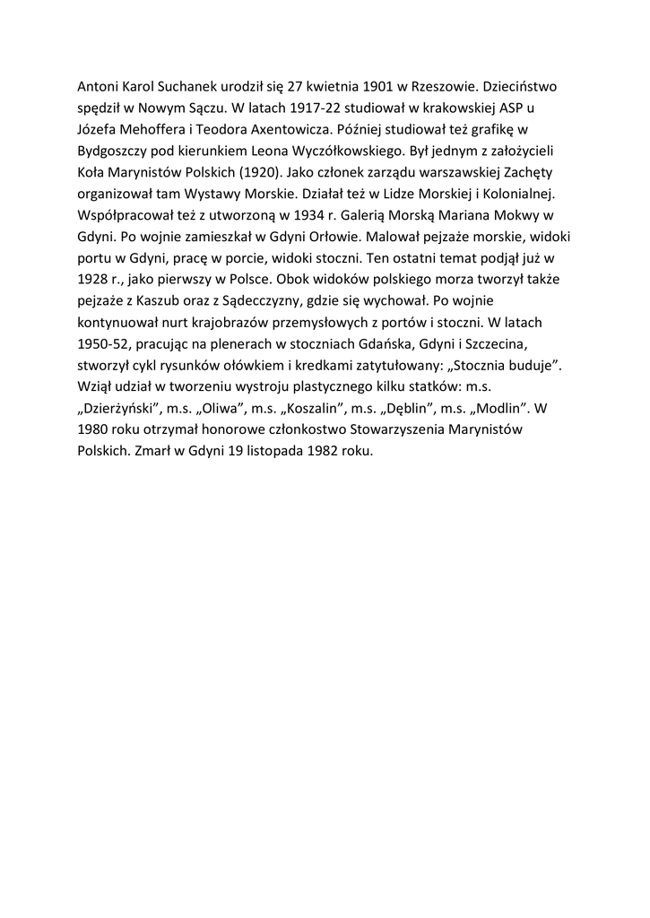 Antoni Karol Suchanek urodził się 27 kwietnia 1901 w Rzeszowie. Dzieciństwo spędził w Nowym Sączu. W latach 1917-22 studiował w krakowskiej ASP u Józefa Mehoffera i Teodora Axentowicza. Później studiował też grafikę w Bydgoszczy pod kierunkiem Leona Wyczółkowskiego. Był jednym z założycieli Koła Marynistów Polskich (1920). Jako członek zarządu warszawskiej Zachęty organizował tam Wystawy Morskie. Działał też w Lidze Morskiej i Kolonialnej. Współpracował też z utworzoną w 1934 r. Galerią Morską Mariana Mokwy w Gdyni. Po wojnie zamieszkał w Gdyni Orłowie. Malował pejzaże morskie, widoki portu w Gdyni, pracę w porcie, widoki stoczni. Ten ostatni temat podjął już w 1928 r., jako pierwszy w Polsce. Obok widoków polskiego morza tworzył także pejzaże z Kaszub oraz z Sądecczyzny, gdzie się wychował. Po wojnie kontynuował nurt krajobrazów przemysłowych z portów i stoczni. W latach 1950-52, pracując na plenerach w stoczniach Gdańska, Gdyni i Szczecina, stworzył cykl rysunków ołówkiem i kredkami zatytułowany: „Stocznia buduje”. Wziął udział w tworzeniu wystroju plastycznego kilku statków: m.s. „Dzierżyński”, m.s. „Oliwa”, m.s. „Koszalin”, m.s. „Dęblin”, m.s. „Modlin”. W 1980 roku otrzymał honorowe członkostwo Stowarzyszenia Marynistów Polskich. Zmarł w Gdyni 19 listopada 1982 roku.