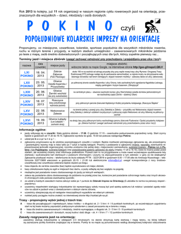 Rok 2013 to kolejny, już 11 rok organizacji w naszym regionie cyklu rowerowych jazd na orientację, przeznaczonych dla wszystkich – dzieci, młodzieży i osób dorosłych: P O K I N O czyli POPOŁUDNIOWE KOLARSKIE IMPREZY NA ORIENTACJÊ Proponujemy, co miesięczne, czwartkowe, kolarskie, sportowe popołudnia dla wszystkich miłośników rowerów, ruchu w różnym terenie i przygody, w każdym stadium umiejętności - zaawansowanych miłośników jeżdżenia po lesie z mapą, osób średnio doświadczonych i początkujących oraz dla tych, którzy zupełnie pierwszy raz... Terminy jazd i miejsca zbiórek (uwaga! zachować ostrożność przy przechodzeniu i przejeżdżaniu przez ulice i tory!): nazwa data (czwartek) LXI 18. 04. POKINO 2013 miejsce jazdy Zabrze Zaborze (Park Pileckiego) Gliwice 23. 05. LXII Osiedle Kopernika / POKINO 2013 Przyszówka Gliwice Żerniki wschód miejsce zbiórki; widoczne także na mapie Google, na internetowe stronie http://goo.gl/maps/LQ8LV około 150 m na wschód od odnogi przyszłej ulicy przy węźle nowej trasy ulicy Rymera i Drogowej Trasy Średnicowej DTŚ (odnoga nadaje się do parkowania samochodów), w rejonie mostu na skrzyżowania wału dawnego torowiska nad torem istniejącym; dojazd rowerem możliwy i zalecany także od ulicy Jałowcowej po północnej stronie osiedla Kopernika i ulicy Oriona, koło zachodniej furki ogrodzenia Kąpieliska Leśnego, między parkingiem i krytym basenem „Olimpijczyk” 20. 06. LXIII POKINO 2013 (las przy autostradzie) 18. 07. LXIV POKINO 2013 (lasy południowego wybrzeża jeziora) przy północnym peronie (kierunek Kędzierzyn Koźle) przystanku kolejowego „Rzeczyce Śląskie” 22. 08. LXV POKINO 2013 Nieborowice Zalesie na terenie jednej z posesji przy ulicy Zaleskiej w Zalesiu – przysiółku wsi Nieborowice; dojazd rowerem ulicą Zaleską z zielonym szlakiem turystycznym z północnej części Nieborowic od ulicy Głównej na północnyzachód 19. 09. LXVI POKINO 2013 Gliwice Łabędy na centralnym placu – skwerze (wschodni koniec ulicy Warmińskiej) osiedla domków jednorodzinnych we wschodniej części Żernik – dzielnicy Gliwic Rzeczyce (Las Łabędzki – zachodni skraj) na skraju lasu przy północnym końcu wschodniego peronu (kierunek Pyskowice i Opole) przystanku kolejowego „Gliwice Kuźnica” (uwaga! zachować ostrożność przy przechodzeniu przez ulice i tory!) Informacje ogólne: jazdy odbywają się w czwartki. Stała godzina zbiórek – 17.00. O godzinie 17.15 – ewentualne podsumowanie poprzedniej rundy. Start czynny będzie w godzinach od 17.20 do 18.15. Ogłoszenie wyników do godz. 19.30 lub podczas następnego Pokino; udział jest b e z p ł a t n y ! ; zgłoszenia przyjmowane są do wtorków poprzedzających czwartki z rundami. Będzie możliwość późniejszego zgłoszenia się, ale przewidujemy i gwarantujemy rezerwy map w ilości tylko po 7 sztuk w każdej kategorii. Prosimy o podawanie w zgłoszeniu imienia, nazwiska, ewentualnie reprezentowanej jednostki organizacyjnej, rocznika urodzenia (nie pełnej daty), miejscowości zamieszkania, wybranej imprezy - Pokino lub (i) Pobino i /lub Popekspres, wybranej kategorii oraz przewidywanej godziny gotowości do startu (między 17.20 a 18.15). Dane te można podać przed startem, ale wcześniej chcemy znać informacje podkreślone. Pozwoli nam to na przygotowanie a może nawet wcześniejsze opublikowanie listy startowej i wydrukowanie kart startowych z podanymi informacjami. Liczymy na zdyscyplinowanie w tym zakresie i z góry za nie dziękujemy! Zgłoszenia przekazać można – telefonicznie do biura oddziału PTTK - 322312616 w godzinach 9.00 ÷ 17.00 albo do Andrzeja Wysockiego – telefonicznie 322713908 wieczorem w godzinach 20.15 ÷ 21.00 lub elektronicznie [email protected]; uwaga! korespondencja z nocy środowoczwartkowej oraz czwartkowa odebrana będzie dopiero po biegu; trasa dojazdu do centrów zawodów (baz) będzie wyznakowane od miejsc zbiórek; bazy zlokalizowane będą na ogół w miejscach bez dachu, a jazdy odbędą się bez względu na pogodę; niezbędne jest posiadanie roweru dostosowanego do jazdy po leśnych wertepach; zaleca się posiadanie ubioru dostosowanego do jeżdżenia na przełaj przez las, konieczne jest posiadanie ochronnego kasku oraz innych akcesorii chroniących ciało podczas ewentualnej wywrotki; za udział w każdych zawodach można zaliczyć sobie po 1 punkcie do Odznaki Imprez na Orientację (5 udziałów to norma na pierwszy stopień popularny); uczestnicy niepełnoletni startujący indywidualnie lub reprezentujący szkoły muszą być pod opieką opiekuna lub rodzica i posiadać zgodę rodziców na udział w jazdach wraz z oświadczeniem o dobrym stanie zdrowia; uczestnicy ubezpieczają się od następstw nieszczęśliwych wypadków we własnym zakresie; rozkład jazdy pociągów można znaleźć na internetowej stronie http://rozklad.plk-sa.pl/. Trasy - proponujemy wybór jednej z trzech tras: - trasa dla początkujących i najmłodszych, łatwa i krótka – o długości ok. 2 ÷ 3 km i 4 ÷ 6 punktach kontrolnych, po wcześniejszym uzgodnieniu start na tej trasie możemy poprzedzić praktycznym szkoleniem z zasad poruszania się w terenie z mapą B - trasa dla średnio zaawansowanych i młodzieży, średnio wymagająca, o długości ok. 3 ÷ 5 km i 5 ÷ 8 punktach kontrolnych C - trasa dla zaawansowanych i dorosłych, raczej trudna i dość długa – ok. 4 ÷ 9 km i 7 ÷ 12 punktów kontrolnych. A Zasady rozgrywania jazd na orientację: zawodnicy startują indywidualnie w odstępach 2-3 minutowych; na starcie otrzymują kartę startową i mapę terenu, na której kółkami są zaznaczone punkty kontrolne znajdujące się w terenie. Punkty te na mapie są ponumerowane według obowiązkowej kolejności odszukiwania i potwierdzania. Sędzia każdego z Pokino może przed startem ogłosić inną regułę kolejności odszukiwania punktów. W terenie punkt kontrolny oznakowany jest biał