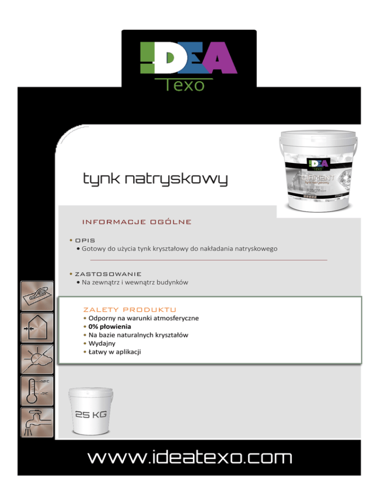 DIAMENT tynk natryskowy INFORMACJE OGÓLNE • OPIS • Gotowy do użycia tynk kryształowy do nakładania natryskowego • ZASTOSOWANIE • Na zewnątrz i wewnątrz budynków ZALETY PRODUKTU • Odporny na warunki atmosferyczne • 0% płowienia • Na bazie naturalnych kryształów • Wydajny • Łatwy w aplikacji www.ideatexo.com DIAMENT tynk natryskowy DANE TECHNICZNE • POSTAĆ Gotowy do użycia tynk dekoracyjny na bazie dyspersji, do nakładania natryskowego • KOMPONENTY Silikonowa emulsja i pochodne celulozowe Wyselekcjonowane wypełniacze organiczne • pH • GĘSTOŚĆ • KOLOR • KLASYFIKACJA 9±1 • BEZPIECZEŃSTWO • OPAKOWANIA Karta bezpieczeństwa dostępna na życzenie na: www.ideatexo.com • SKŁADOWANIE 9 miesięcy od daty produkcji, w nieotwartych oryginalnych opakowaniach, chroniąc przed mrozem, wysoką temperatrą (max. +25°C) i wilgocią OGNIOWA 1,58 ± 0,1 Uzależniony od rodzaju kryształu Euroklasa F Certyfikat dostępny na życzenie Wiadro 25 kg SPOSÓB UŻYCIA • PRZYGOTOWANIE • ROZCIEŃCZENIE • APLIKACJA Wymieszać przed użyciem Do 1%, jeśli konieczne • Narzędzia Agregaty natryskowy z pistoletem PS1 lub PS2 firmy Idea Texo, wygładzanie pacą wenecką • Warunki Nie nakładać w temperaturze poniżej +5°C lub powyżej +25°C, lub we względnej wilgotności powyżej 80% HR • Czyszczenie narzędzi Wodą, przed zupełnym wyschnięciem Niniejsza karta techniczna unieważnia i zastępuje wszelkie uprzednie karty odnoszące się do tego produktu Data wydania: Maj 2015 • ŚREDNIE ZUŻYCIE 2,3 - 2,7 kg/m2 • PODŁOŻA Różnego rodzaju betony, bloczki betonowe, tynki, płyty gipsowe i g/k, stare podłoża malowane, docieplone budynki Podłoże musi być mocne, zwarte, odpylone, czyste i suche Przyczepność do podłoży betonowych x>v0,3 MPa Celem tej karty technicznej jest informowanie naszych klientów o właściwościach naszych produktów. Informacje podane są w dobrej mierze oraz zgodnie ze stanem naszej wiedzy na dzień wydania karty. Jednakże podane informacje nie mogą zastąpić właściwej charakte- rystyki odnoszącej się do stanu i specyfiki podłoża. W związku z ciągłym postępem technolo- gicznym w obowiązku klienta jest sprawdzenie, czy nie została wydana zaktualizowana edycja karty technicznej. Wszelkie informacje oraz aktualne karty techniczne mozna znaleźć na naszej stronie: www.ideatexo.com Idea Texo Sp. z o.o. • Ligotka 1, 46-100 Namyslow • NIP: PL7521452665 • KRS: 0000544678 OBSŁUGA KLIENTA: 730 948 930 • [email protected]