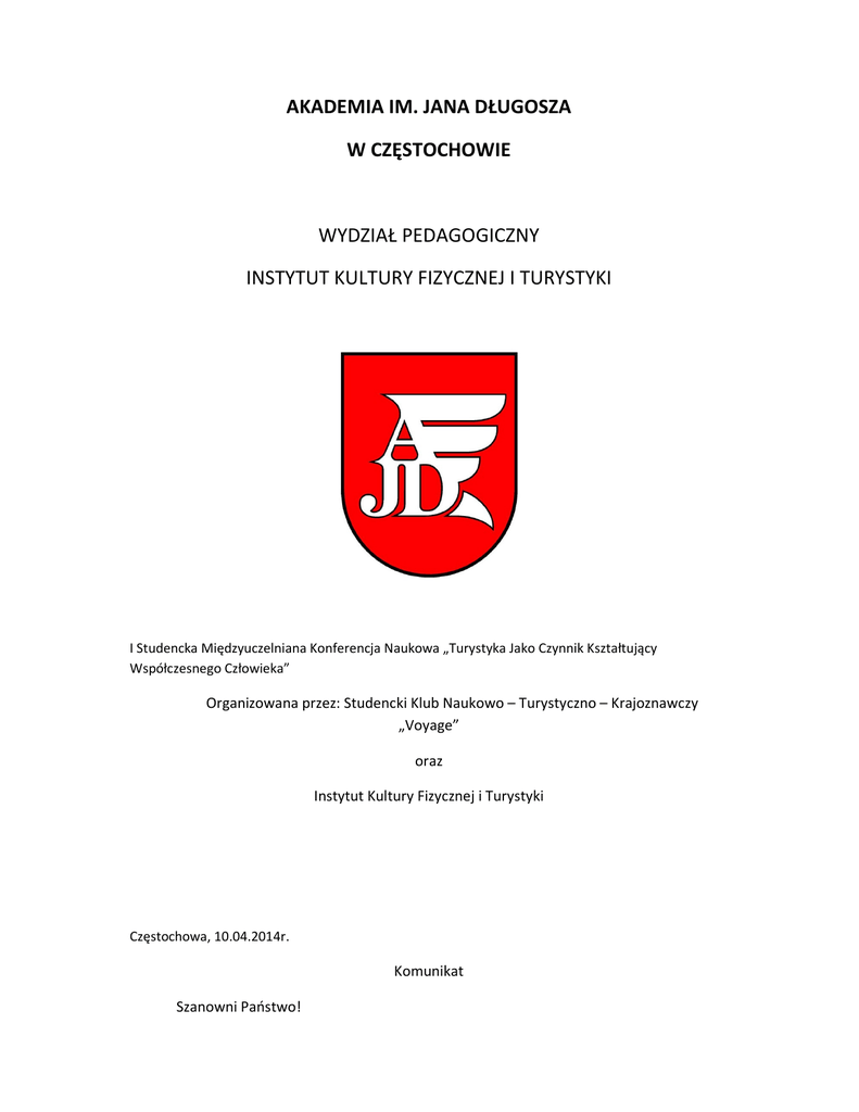 AKADEMIA IM. JANA DŁUGOSZA W CZĘSTOCHOWIE WYDZIAŁ PEDAGOGICZNY INSTYTUT KULTURY FIZYCZNEJ I TURYSTYKI I Studencka Międzyuczelniana Konferencja Naukowa „Turystyka Jako Czynnik Kształtujący Współczesnego Człowieka” Organizowana przez: Studencki Klub Naukowo – Turystyczno – Krajoznawczy „Voyage” oraz Instytut Kultury Fizycznej i Turystyki Częstochowa, 10.04.2014r. Komunikat Szanowni Państwo! W imieniu Komitetu Naukowego oraz Organizacyjnego mam zaszczyt zaprosić Państwa na I-szą Studencką Międzyuczelnianą Konferencje Naukową pod tytułem „Turystyka jako czynnik kształtujący współczesnego człowieka”. Celem konferencji jest poruszenie zagadnień związanych z szerokim pojęciem „turystyki”, omówienie rozwoju tej dziedziny na przestrzeni lat oraz przedstawienie perspektyw na przyszłość. Ciągle rozwijający się ruch turystyczny to nie tylko bardzo istotna gałąź światowej gospodarki, dająca możliwość podjęcia międzynarodowych rozmów dotyczących polityki i kultury, ale to również bardzo istotny czynnik wpływający na każdego z nas . Podróże i związany z nimi ruch turystyczny daje możliwość rozwoju świadomości współczesnego człowieka w wielu dziedzinach życia i nauki. Obecnie turystyka nie posiada tak wielu ograniczeń dla przeciętnego człowieka jak miało to miejsce kilkadziesiąt lat temu. Co więcej podróże stały się dla wielu nieodzownym elementem naszego życia. Obfitość problematyki zawartej w tytule naszej konferencji mobilizuje nas – studentów I i II stopnia oraz doktorantów do podjęcia dyskusji na tematy istotne dla turystyki. Zakres tematyczny konferencji obejmuje aspekty: społeczno-ekonomiczne, psychologiczne, przyrodnicze, kulturowe oraz fizjologiczne. Szczególną uwagę chcielibyśmy zwrócić na: • Tradycje i historię turystyki w wybranym regionie w Polsce i na świecie, • Walory i atrakcje turystyczne wybranych regionów w Polsce i na świecie, • Niekonwencjonalne formy przekazu informacji turystycznej przez media, organizacje, stowarzyszenia i indywidualnych podróżników oraz wpływ tego przekazu na promowanie turystyki, • Alternatywne formy podróżowania w środowisku studenckim, uwarunkowania odnośnie wyboru destynacji, akomodacji i formy transportu, KOMITET NAUKOWY KONFERENCJI: • • • • • dr Joanna Rodziewicz – Gruhn dr Cezary Michalski dr Joanna Górna dr hab. Stanisław Czaja dr hab. Mariusz Rzętała KOMITET ORGANIZACYJNY KONFERENCJI: • • • • Marta Trzcińska Monika Pluta Adrian Stępień Wojciech Lula I MIĘDZYUCZELNIANA KONFERENCJA NAUKOWA „TURYSTYKA JAKO CZYNNIK KSZTAŁTUJĄCY WSPÓŁCZESNEGO CZŁOWIEKA” Formularz zgłoszeniowy Imię: Nazwisko: Tytuł naukowy: Instytucja: Adres instytucji: NIP instytucji: Numer telefonu: Adres e-mail: Tytuł referatu: Streszczenie referatu: Miejscowość i data: Podpis: Informacje organizacyjne: Termin zgłoszenia: do 15.02.2014r. Termin nadsyłania prac: 17.03.2014r. Sekretariat konferencyjny: [email protected] Organizatorzy: Trzcińska Marta tel. 791 155 344, Pluta Monika tel. 794 626 436 Opłata konferencyjna: • Dla studentów I i II stopnia – 100zł • Dla doktorantów – 150zł Konto: Raiffeisen Bank Polska SA 23 1750 0000 0000 1301 1378 Tytuł przelewu: Imię, nazwisko, Konferencja – turystyka Termin przelewu: do 14.03.2014 r. Istnieje możliwość publikacji nadesłanych na konferencje prac w: • czasopiśmie Akademii im. Jana Długosza w Częstochowie „Kultura Fizyczna” (w wykazie czasopism punktowanych MNiSW z 17 września 2012 roku ,,Kultura Fizyczna'' uzyskała 1 punkt ). Wymogi edytorskie na stronie: http://www.wp.ajd.czest.pl/kultura-fizyczna/ • wydaniu internetowym międzynarodowego czasopisma naukowego „Physical Activity Review.” Wymogi edytorskie na stronie: http://www.physactiv.ajd.czest.pl/ Osoby zainteresowane publikacją w „Physical Activity Review” proszone są o nadesłanie swoich prac również w języku angielskim. INSTRUKCJA WYDAWNICZA Materiały prosimy nadsyłać w wersji elektronicznej (e-mailem) 17.03.2014r. na adres: [email protected] Prosimy o przestrzeganie poniższej instrukcji wydawniczej, ponieważ prace przygotowane niezgodnie z nią będą odsyłane autorom do poprawy: • Obowiązuje edytor MS Word (wersja 97, 2000 lub nowsze). • Objętość artykułu musi obejmować minimum połowę arkusza wydawniczego (20 000 znaków ze spacjami), tj. 8 stron maszynopisu wg poniższych ustawień (łącznie z bibliografią i przypisami); jednocześnie prosimy by nie była obszerniejsza niż 13 stron. • Numeracja stron: dół strony, wyrównanie zewnętrzne. • Czcionka (Times New Roman). • Przed tekstem właściwym prosimy umieścić kolejno: • • Nazwisko i imię autora – na środku strony, czcionka 10 pkt., pogrubione Afiliację autora – na środku strony, czcionka 10 pkt., bez pogrubienia Tytuł pracy w języku polskim – na środku strony, czcionka 12 pkt., pogrubiony, kursywą Słowa kluczowe (3-5) w języku polskim – z lewej strony, czcionka 10 pkt., pogrubiony Streszczenie w języku polskim zawierające około 150 wyrazów Tekst właściwy musi zawierać podział na wprowadzenie, podrozdziały i zakończenie. Czcionka dla tekstu właściwego i bibliografii – 10 pkt.; czcionka dla przypisów – 9 pkt. • Ustawienia akapitu: • Wcięcie tekstu: 0,63 cm Odstępy przed i po: 0 pkt.; Interlinia: Co najmniej; Co: 12,5 pkt. Marginesy: lewy – 4,3 cm., prawy – 4,2 cm, dolny – 6,9 cm, górny – 3 cm • Tekst należy sformatować przy użyciu justowania; nie należy stosować włączonej opcji dzielenia wyrazów, podziału stron, stopki i nagłówka. • Literaturę wykorzystaną w pracy prosimy zapisywać w harwardzkim systemie bibliograficznym w następujący sposób: [Kowalski 2001, ss. 23-25], [Kowalski 2003a, s. 7], [Raport…2009] itd. • Przypisy objaśniające lub uzupełniające tekst powinny znajdować się na dole każdej strony. N
