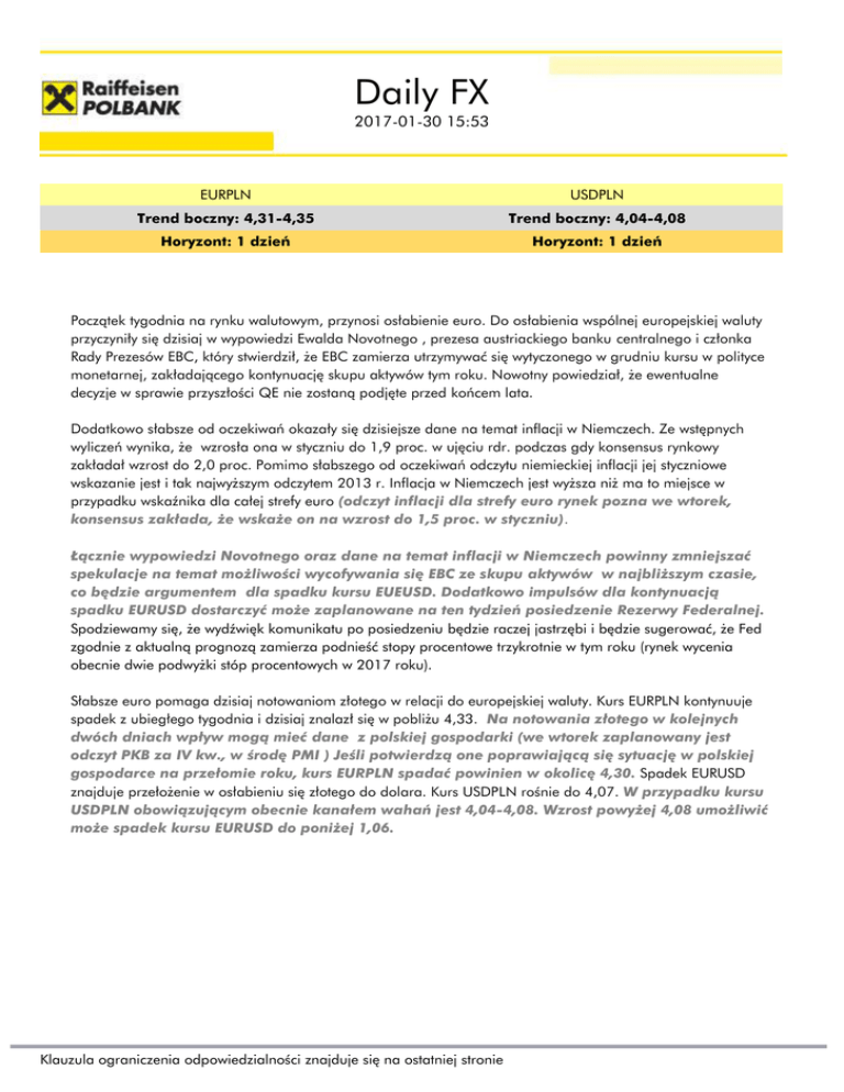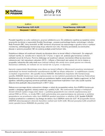 Daily FX 2017-01-30 15:53 EURPLN USDPLN Trend boczny: 4,31-4,35 Trend boczny: 4,04-4,08 Horyzont: 1 dzień Horyzont: 1 dzień Początek tygodnia na rynku walutowym, przynosi osłabienie euro. Do osłabienia wspólnej europejskiej waluty przyczyniły się dzisiaj w wypowiedzi Ewalda Novotnego , prezesa austriackiego banku centralnego i członka Rady Prezesów EBC, który stwierdził, że EBC zamierza utrzymywać się wytyczonego w grudniu kursu w polityce monetarnej, zakładającego kontynuację skupu aktywów tym roku. Nowotny powiedział, że ewentualne decyzje w sprawie przyszłości QE nie zostaną podjęte przed końcem lata. Dodatkowo słabsze od oczekiwań okazały się dzisiejsze dane na temat inflacji w Niemczech. Ze wstępnych wyliczeń wynika, że wzrosła ona w styczniu do 1,9 proc. w ujęciu rdr. podczas gdy konsensus rynkowy zakładał wzrost do 2,0 proc. Pomimo słabszego od oczekiwań odczytu niemieckiej inflacji jej styczniowe wskazanie jest i tak najwyższym odczytem 2013 r. Inflacja w Niemczech jest wyższa niż ma to miejsce w przypadku wskaźnika dla całej strefy euro (odczyt inflacji dla strefy euro rynek pozna we wtorek, konsensus zakłada, że wskaże on na wzrost do 1,5 proc. w styczniu). Łącznie wypowiedzi Novotnego oraz dane na temat inflacji w Niemczech powinny zmniejszać spekulacje na temat możliwości wycofywania się EBC ze skupu aktywów w najbliższym czasie, co będzie argumentem dla spadku kursu EUEUSD. Dodatkowo impulsów dla kontynuacją spadku EURUSD dostarczyć może zaplanowane na ten tydzień posiedzenie Rezerwy Federalnej. Spodziewamy się, że wydźwięk komunikatu po posiedzeniu będzie raczej jastrzębi i będzie sugerować, że Fed zgodnie z aktualną prognozą zamierza podnieść stopy procentowe trzykrotnie w tym roku (rynek wycenia obecnie dwie podwyżki stóp procentowych w 2017 roku). Słabsze euro pomaga dzisiaj notowaniom złotego w relacji do europejskiej waluty. Kurs EURPLN kontynuuje spadek z ubiegłego tygodnia i dzisiaj znalazł się w pobliżu 4,33. Na notowania złotego w kolejnych dwóch dniach wpływ mogą mieć dane z polskiej gospodarki (we wtorek zaplanowany jest odczyt PKB za IV kw., w środę PMI ) Jeśli potwierdzą one poprawiającą się sytuację w polskiej gospodarce na przełomie roku, kurs EURPLN spadać powinien w okolicę 4,30. Spadek EURUSD znajduje przełożenie w osłabieniu się złotego do dolara. Kurs USDPLN rośnie do 4,07. W przypadku kursu USDPLN obowiązującym obecnie kanałem wahań jest 4,04-4,08. Wzrost powyżej 4,08 umożliwić może spadek kursu EURUSD do poniżej 1,06. Klauzula ograniczenia odpowiedzialności znajduje się na ostatniej stronie Kalendarium Godz. Kraj Wskaźnik Ostateczna dana Prognoza Średnia Raiffeisen oczekiwań Poprzedni 14:30 USA Dynamika PKB (IV kw., ujęcie zanualizowane kdk) 1,9 2,2 2,1 3,5 14:30 USA Zamówienia na dobra trwałe (grudzień, pkt) -0,4 1,5 2,9 -4,5 14:00 14:30 14:30 D USA USA Inflacja CPI (%, r/r) wstępne dane Wydatki Amerykanów (grudzień, %, m/m) Deflator PCE (październik, %, r/r) PONIEDZIAŁEK 31 STYCZNIA 1,9 0,5 1,6 2,10 0,5 1,7 2,0 0,5 1,8 1,7 0,5 1,4 10:00 10:00 11:00 15:45 16:00 EZ PL EZ USA USA PKB (%, k/k) 1. wyliczenie PKB (%, r/r) 1. wyliczenie Inflacja CPI (styczeń, %, r/r) wstępne dane Chicago PMI (styczeń, pkt.) Wskaźnik zaufania Conference Board ŚRODA 1 LUTY 0,4 2,5 1,3 112,0 0,4 2,7 1,5 55,0 112,8 0,3 3,9 1,1 53,9 113,7 09:00 PL PMI dla przemysłu (luty, pkt.) 54,8 54,3 54,3 14:30 USA Wzrost zatrudnienia ADP (listopad, tys, m/m) 175 160 153 16:00 USA Indeks ISM dla przemysłu (listopad, pkt.) 54,8 55,0 54,5 Stopa proc. Fed (%) 0,75 0,75 0,75 PIĄTEK27 STYCZNIA PONIEDZIAŁEK 30 STYCZNIA CZWARTEK 2 LUTY Brak ważniejszych danych PIĄTEK 3 LUTY 14:30 USA Wzrost zatrudnienia w sektorach pozarolniczych 175 180 161 14:30 USA Wynagrodzenia godzinowe (listopad, %, m/m) 4,80 4,90 4,90 14:30 USA Stopa bezrobocia (listopad, %) 2,70 2,80 2,80 16:00 USA Indeks ISM dla sektora usług (listopad, pkt.) 51,9 52,1 51,9 Źródło: Reuters; Bloomberg; prognozy Raiffeisen Bank Polska i Raiffeisen Research 53,2 EURPLN USDPLN Trend boczny: 4,31-4,35 Trend boczny: 4,04-4,08 Horyzont: 1 dzień Horyzont: 1 dzień Źródło: Reuters, stan na 2017-01-30 15:40 Opór Kurs Wsparcie 4,3800 4,3660 4,3500 4,3310 4,3300 4,3100 4,3000 Wsparciem jest obecnie poziom 4,33, który są górnym ograniczeniem konsolidacji, w której kurs znajdował się w październiku i w listopadzie. Kolejnym wsparciem będą 4,31 i 4,30, które również powstrzymały ruchy śród-sesyjne w trzecim i czwartym kwartale. Najbliższym oporem dla wzrostu jest 4,35, czyli górne ograniczenie konsolidacji, w której kurs znajdował się w styczniu. Kolejnym 4,366, gdzie przebiega 200-sesyjna średnia krocząca, oraz 4,38 i 4,39, czyli górne ograniczenie styczniowej konsolidacji. EURPLN USDPLN Trend boczny: 4,31-4,35 Trend boczny: 4,04-4,08 Horyzont: 1 dzień Horyzont: 1 dzień Źródło: Reuters, stan na 2017-01-30 15:40 Opór Kurs Wsparcie 4,1600 4,1400 4,1000 4,0660 4,0500 4,0000 3,9900 Wsparciem obecnie są poziomy 4,05 oraz 3,99, które stanowią górne ograniczenia konsolidacji, w której USDPLN znajdował się przez większą część 2016 r. Oporem jest poziom 4,08, który wcześniej w styczniu powstrzymywał wzrosty USDPLN. Kolejnymi barierami są poziomy 4,11 i 4,14, które również powstrzymywały ruchy śród-sesyjne w styczniu oraz poziom 4,2 czyli dolne ograniczenie konsolidacji, w której kurs znajdował się w grudniu. Klauzula ograniczenia odpowiedzialności znajduje się na ostatniej stronie Raport sporządził: Wojciech Stępień, CFA Analityk Rynków Finansowych Raiffeisen Polbank ul. Grzybowska 78, 00-844 Warszawa www.raiffeisenpolbank.com Departament Sprzedaży Rynków Finansowych Telefon: + 48 22 585 37 86 Faks: + 48 22 585 33 68 W razie pytań lub uwag dotyczących powyższej publikacji proszę o kontakt: [email protected] Dealing: Bydgoszcz tel.: (22) 585 37 73 Pozna