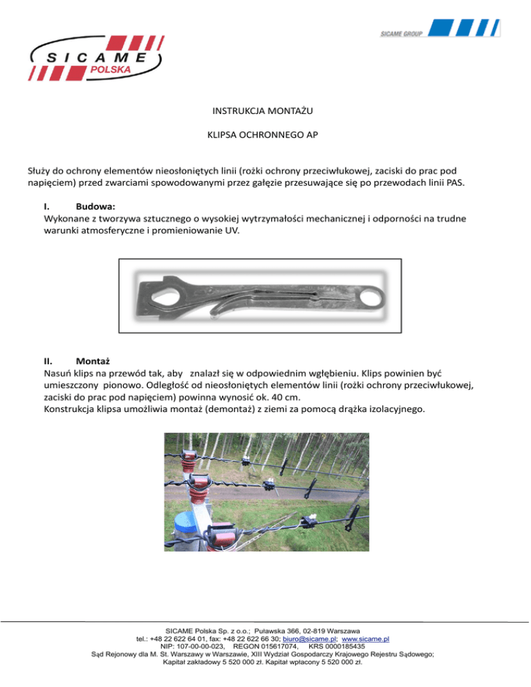 INSTRUKCJA MONTAŻU KLIPSA OCHRONNEGO AP Służy do ochrony elementów nieosłoniętych linii (rożki ochrony przeciwłukowej, zaciski do prac pod napięciem) przed zwarciami spowodowanymi przez gałęzie przesuwające się po przewodach linii PAS. I. Budowa: Wykonane z tworzywa sztucznego o wysokiej wytrzymałości mechanicznej i odporności na trudne warunki atmosferyczne i promieniowanie UV. II. Montaż Nasuń klips na przewód tak, aby znalazł się w odpowiednim wgłębieniu. Klips powinien być umieszczony pionowo. Odległość od nieosłoniętych elementów linii (rożki ochrony przeciwłukowej, zaciski do prac pod napięciem) powinna wynosić ok. 40 cm. Konstrukcja klipsa umożliwia montaż (demontaż) z ziemi za pomocą drążka izolacyjnego. SICAME Polska Sp. z o.o.; Puławska 366, 02-819 Warszawa tel.: +48 22 622 64 01, fax: +48 22 622 66 30; [email protected]; www.sicame.pl NIP: 107-00-00-023, REGON 015617074, KRS 0000185435 Sąd Rejonowy dla M. St. Warszawy w Warszawie, XIII Wydział Gospodarczy Krajowego Rejestru Sądowego; Kapitał zakładowy 5 520 000 zł. Kapitał wpłacony 5 520 000 zł.