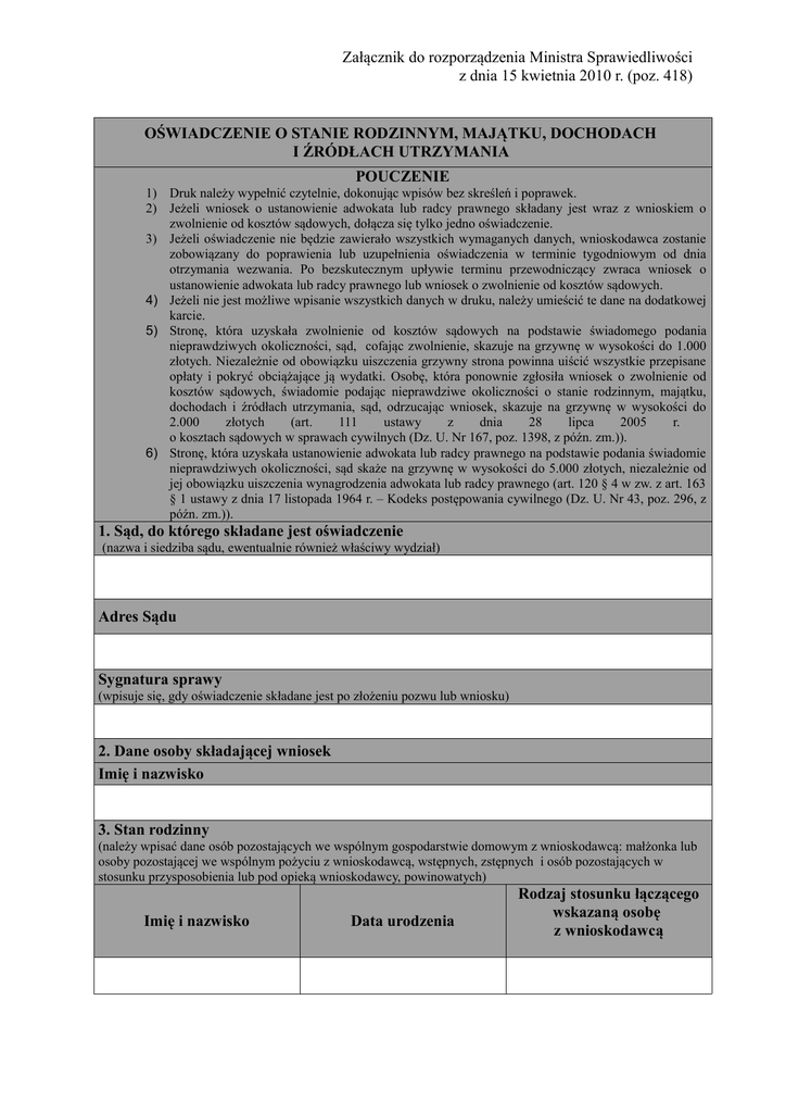 Załącznik do rozporządzenia Ministra Sprawiedliwości z dnia 15 kwietnia 2010 r. (poz. 418) OŚWIADCZENIE O STANIE RODZINNYM, MAJĄTKU, DOCHODACH I ŹRÓDŁACH UTRZYMANIA POUCZENIE 1) Druk należy wypełnić czytelnie, dokonując wpisów bez skreśleń i poprawek. 2) Jeżeli wniosek o ustanowienie adwokata lub radcy prawnego składany jest wraz z wnioskiem o zwolnienie od kosztów sądowych, dołącza się tylko jedno oświadczenie. 3) Jeżeli oświadczenie nie będzie zawierało wszystkich wymaganych danych, wnioskodawca zostanie zobowiązany do poprawienia lub uzupełnienia oświadczenia w terminie tygodniowym od dnia otrzymania wezwania. Po bezskutecznym upływie terminu przewodniczący zwraca wniosek o ustanowienie adwokata lub radcy prawnego lub wniosek o zwolnienie od kosztów sądowych. 4) Jeżeli nie jest możliwe wpisanie wszystkich danych w druku, należy umieścić te dane na dodatkowej karcie. 5) Stronę, która uzyskała zwolnienie od kosztów sądowych na podstawie świadomego podania nieprawdziwych okoliczności, sąd, cofając zwolnienie, skazuje na grzywnę w wysokości do 1.000 złotych. Niezależnie od obowiązku uiszczenia grzywny strona powinna uiścić wszystkie przepisane opłaty i pokryć obciążające ją wydatki. Osobę, która ponownie zgłosiła wniosek o zwolnienie od kosztów sądowych, świadomie podając nieprawdziwe okoliczności o stanie rodzinnym, majątku, dochodach i źródłach utrzymania, sąd, odrzucając wniosek, skazuje na grzywnę w wysokości do 2.000 złotych (art. 111 ustawy z dnia 28 lipca 2005 r. o kosztach sądowych w sprawach cywilnych (Dz. U. Nr 167, poz. 1398, z późn. zm.)). 6) Stronę, która uzyskała ustanowienie adwokata lub radcy prawnego na podstawie podania świadomie nieprawdziwych okoliczności, sąd skaże na grzywnę w wysokości do 5.000 złotych, niezależnie od jej obowiązku uiszczenia wynagrodzenia adwokata lub radcy prawnego (art. 120 § 4 w zw. z art. 163 § 1 ustawy z dnia 17 listopada 1964 r. – Kodeks postępowania cywilnego (Dz. U. Nr 43, poz. 296, z późn. zm.)). 1. Sąd, do którego składane jest oświadczenie (nazwa i siedziba sądu, ewentualnie również właściwy wydział) Adres Sądu Sygnatura sprawy (wpisuje się, gdy oświadczenie składane jest po złożeniu pozwu lub wniosku) 2. Dane osoby składającej wniosek Imię i nazwisko 3. Stan rodzinny (należy wpisać dane osób pozostających we wspólnym gospodarstwie domowym z wnioskodawcą: małżonka lub osoby pozostającej we wspólnym pożyciu z wnioskodawcą, wstępnych, zstępnych i osób pozostających w stosunku przysposobienia lub pod opieką wnioskodawcy, powinowatych) Imię i nazwisko Data urodzenia Rodzaj stosunku łączącego wskazaną osobę z wnioskodawcą 4. Majątek (należy wpisać stan majątkowy wnioskodawcy, wskazując jednocześnie tytuł prawny, np. własność, użytkowanie wieczyste) Nieruchomości nieruchomość przeznaczona do stałego zamieszkiwania przez wnioskodawcę (nieruchomość zabudowana domem mieszkalnym lub mieszkanie, powierzchnia działki, domu, mieszkania w m2) nieruchomość rolna (powierzchnia w hektarach) inne nieruchomości (powierzchnia w hektarach lub w m2) Pozostały majątek oszczędności (należy wpisać wartość nominalną i walutę) papiery wartościowe 2 inne przedmioty wartościowe (powyżej 10.000 zł) 5. Dochody i źródła utrzymania wnioskodawcy i osób pozostających we wspólnym gospodarstwie domowym (należy wpisać wszystkie dochody i źródła utrzymania) imię i nazwisko z jakiego tytułu dochód miesięczny netto 3 6. Inne dane, które wnioskodawca uważa za istotne (np. wysokość i rodzaj zobowiązań bądź wierzytelności, koszty ponoszone na utrzymanie mieszkania, koszty leczenia) 4 7. Miejscowość i data 8. Podpis wnioskodawcy 5