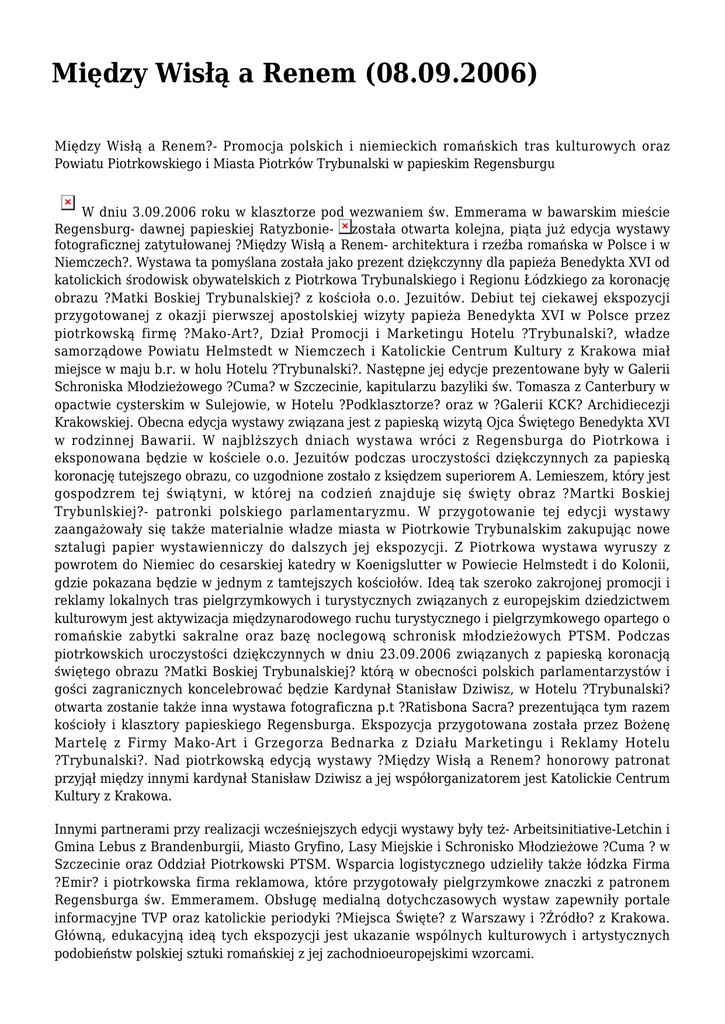 Między Wisłą a Renem (08.09.2006) Między Wisłą a Renem?- Promocja polskich i niemieckich romańskich tras kulturowych oraz Powiatu Piotrkowskiego i Miasta Piotrków Trybunalski w papieskim Regensburgu W dniu 3.09.2006 roku w klasztorze pod wezwaniem św. Emmerama w bawarskim mieście Regensburg- dawnej papieskiej Ratyzbonie- została otwarta kolejna, piąta już edycja wystawy fotograficznej zatytułowanej ?Między Wisłą a Renem- architektura i rzeźba romańska w Polsce i w Niemczech?. Wystawa ta pomyślana została jako prezent dziękczynny dla papieża Benedykta XVI od katolickich środowisk obywatelskich z Piotrkowa Trybunalskiego i Regionu Łódzkiego za koronację obrazu ?Matki Boskiej Trybunalskiej? z kościoła o.o. Jezuitów. Debiut tej ciekawej ekspozycji przygotowanej z okazji pierwszej apostolskiej wizyty papieża Benedykta XVI w Polsce przez piotrkowską firmę ?Mako-Art?, Dział Promocji i Marketingu Hotelu ?Trybunalski?, władze samorządowe Powiatu Helmstedt w Niemczech i Katolickie Centrum Kultury z Krakowa miał miejsce w maju b.r. w holu Hotelu ?Trybunalski?. Następne jej edycje prezentowane były w Galerii Schroniska Młodzieżowego ?Cuma? w Szczecinie, kapitularzu bazyliki św. Tomasza z Canterbury w opactwie cysterskim w Sulejowie, w Hotelu ?Podklasztorze? oraz w ?Galerii KCK? Archidiecezji Krakowskiej. Obecna edycja wystawy związana jest z papieską wizytą Ojca Świętego Benedykta XVI w rodzinnej Bawarii. W najblższych dniach wystawa wróci z Regensburga do Piotrkowa i eksponowana będzie w kościele o.o. Jezuitów podczas uroczystości dziękczynnych za papieską koronację tutejszego obrazu, co uzgodnione zostało z księdzem superiorem A. Lemieszem, który jest gospodzrem tej świątyni, w której na codzień znajduje się święty obraz ?Martki Boskiej Trybunlskiej?- patronki polskiego parlamentaryzmu. W przygotowanie tej edycji wystawy zaangażowały się także materialnie władze miasta w Piotrkowie Trybunalskim zakupując nowe sztalugi papier wystawienniczy do dalszych jej ekspozycji. Z Piotrkowa wystawa wyruszy z powrotem do Niemiec do cesarskiej katedry w Koenigslutter w Powiecie Helmstedt i do Kolonii, gdzie pokazana będzie w jednym z tamtejszych kościołów. Ideą tak szeroko zakrojonej promocji i reklamy lokalnych tras pielgrzymkowych i turystycznych związanych z europejskim dziedzictwem kulturowym jest aktywizacja międzynarodowego ruchu turystycznego i pielgrzymkowego opartego o romańskie zabytki sakralne oraz bazę noclegową schronisk młodzieżowych PTSM. Podczas piotrkowskich uroczystości dziękczynnych w dniu 23.09.2006 związanych z papieską koronacją świętego obrazu ?Matki Boskiej Trybunalskiej? którą w obecności polskich parlamentarzystów i gości zagranicznych koncelebrować będzie Kardynał Stanisław Dziwisz, w Hotelu ?Trybunalski? otwarta zostanie także inna wystawa fotograficzna p.t ?Ratisbona Sacra? prezentująca tym razem kościoły i klasztory papieskiego Regensburga. Ekspozycja przygotowana została przez Bożenę Martelę z Firmy Mako-Art i Grzegorza Bednarka z Działu Marketingu i Reklamy Hotelu ?Trybunalski?. Nad piotrkowską edycją wystawy ?Między Wisłą a Renem? honorowy patronat przyjął między innymi kardynał Stanisław Dziwisz a jej współorganizatorem jest Katolickie Centrum Kultury z Krakowa. Innymi partnerami przy realizacji wcześniejszych edycji wystawy były też- Arbeitsinitiative-Letchin i Gmina Lebus z Brandenburgii, Miasto Gryfino, Lasy Miejskie i Schronisko Młodzieżowe ?Cuma ? w Szczecinie oraz Oddział Piotrkowski PTSM. Wsparcia logistycznego udzieliły także łódzka Firma ?Emir? i piotrkowska firma reklamowa, które przygotowały pielgrzymkowe znaczki z patronem Regensburga św. Emmeramem. Obsługę medialną dotychczasowych wystaw zapewniły portale informacyjne TVP oraz katolickie periodyki ?Miejsca Święte? z Warszawy i ?Źródło? z Krakowa. Główną, edukacyjną ideą tych ekspozycji jest ukazanie wspólnych kulturowych i artystycznych podobieństw polskiej sztuki romańskiej z jej zachodnioeuropejskimi wzorcami. Komisarz wystawy: Sebastian Brzoskowski www.europaromanesque.eu Międzynarodowe Schronisko Młodzieżowe PTSM ?Trybunalski? ul. Grota Roweckiego 5 97-300 Piotrków Tryb. tel. 044 732-16-26 www.trybunalskie.pl Architektura i sztuka romańska powstała w Europie Zachodniej pomiędzy IX a XIII wiekiem stanowiła we wczesnym średniowieczu uniwersalną wartość dla wszystkich narodów europejskich a swą inspirację czerpała z wiary chrześcijańskiej i wielkiego cywilizacyjnego procesu odnowy Cesarstwa Zachodniorzymskiego w czasach panowania frankijskiej dynastii Karolingów. Na przełomie X i XI wieku, już w epoce ottońskiej, w ten proces włączone zostały Polska, Węgry i kraje skandynawskie, które przeszły z pogaństwa na wiarę chrześcijańską i jako niezależne królestwa utworzyły na swych terenach narodowe organizacje archidiecezjalne. W roku 1000 za zgodą papieża Sylwestra II i cesarza Ottona III, w Gnieźnie przy grobie św. Wojciecha utworzono polską, niezależną Archidiecezję Gnieźnieńską i podległe jej biskupstwa w Krakowie, Poznaniu, Wrocławiu i Kołobrzegu. Na ten też moment datuje się rozwój polskiej sztuki i architektury romańskiej, której wzorce docierały do wczesnopiastowskiej Polski głównie z Niemiec, Czech Francji i Włoch. Figuralna rzeźba romańska swój rozkwit przeżyła na przestrzeni XI i XII wieku w wyniku reform życia klasztornego i przemieszczania się budowniczych i artystów pomiędzy krajami średniowiecznej Europy. Głównymi jej centrami były natomiast Włochy, Niemcy, Francja i Hiszpania skąd rozchodziły się artystyczne wzorce. W Polsce architektura i rzeźba kamienna przeżyła swój największy rozkwit na przełomie XII i XIII wieku stając się mieszanką wszystkich ówczesnych romańskich szkół kamieniarskich. Do najsłynniejszych polskich zabytków kamieniarstwa i odlewnictwa romańskie