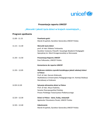 Prezentacja raportu UNICEF „Warunki i jakość życia dzieci w krajach rozwiniętych „ Program spotkania 11.00 - 11.15 Powitanie gości Marek Krupiński, Dyrektor Generalny UNICEF Polska 11.15 – 11.30 Warunki życia dzieci prof. dr hab. Elżbieta Tarkowska Dyrektor Instytutu Filozofii i Socjologii Akademii Pedagogiki Specjalnej im. Marii Grzegorzewskiej w Warszawie 11.30 – 11.50 Prezentacja Raportu UNICEF Ewa Falkowska, UNICEF Polska Komentarze do raportu UNICEF 11.50 – 12.05 Wybrane niektóre czynniki kształtujące jakość edukacji dzieci w Polsce Prof. dr hab. Danuta Waloszek, Wykładowca Uniwersytetu Pedagogicznego im. Komisji Edukacji Narodowej w Krakowie 12.05-12.20 Sytuacja zdrowotna dzieci w Polsce Prof. dr hab. Alicja Chybicka, Senator Rzeczpospolitej Polskiej, Prezes Polskiego Towarzystwa Pediatrycznego 12.20 – 12.30 Dzieci w Polsce - dane, liczby, statystyki Agnieszka Telusiewicz-Pacak, UNICEF Polska 12.30 – 12.40 Zakończenie Marek Krupiński, Dyrektor Generalny UNICEF Polska
