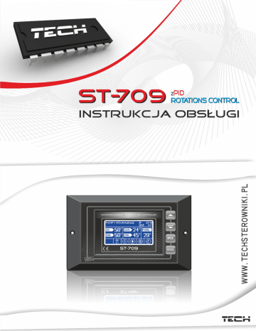 ST-709 Rotations Control Deklaracja zgodności nr 43/2011 Firma TECH, z siedzibą w Wieprzu 1047A, 34-122 Wieprz, deklaruje z pełną odpowiedzialnością, że produkowany przez nas termoregulator ST-709 230V, 50Hz spełnia wymagania Rozporządzenia Ministra Gospodarki Pracy i Polityki Społecznej. (Dz.U. Nr 155, poz. 1089) z dnia 21 sierpnia 2007 r., wdrażającego postanowienia Dyrektywy Niskonapięciowej (LVD) 2006/95/WE z dnia 16.01.2007 r. Sterownik ST-709 przeszedł kompatybilności EMC pozytywnie badania przy podłączeniu optymalnych obciążeń. Do ocen zgodności zharmonizowane PN-EN 60730-2-9:2006. -2- zastosowano normy ST-709 Rotations Control UWAGA! URZĄDZENIE ELEKTRYCZNE POD NAPIĘCIEM! Przed dokonaniem jakichkolwiek czynności związanych z zasilaniem (podłączanie przewodów, instalacja urządzenia, itp.) należy upewnić się, że regulator nie jest podłączony do sieci! Montażu powinna dokonać osoba posiadająca odpowiednie uprawnienia elektryczne. Przed uruchomieniem sterownika należy dokonać pomiaru skuteczności zerowania silników elektrycznych, kotła ,oraz pomiaru izolacji przewodów elektrycznych. -3- ST-709 Rotations Control I. Opis Regulator temperatury ST–709 przeznaczony jest do kotłów CO wyposażonych w podajnik ślimakowy. Steruje pompą obiegu wody, pompą ciepłej wody użytkowej (C.W.U.), pompą ogrzewania podłogowego, pompą cyrkulacyjną, nadmuchem (wentylatorem) oraz podajnikiem paliwa. Urządzenie to może również współpracować z dwoma zaworami trójdrożnymi lub czterodrożnymi, regulatorem pokojowym ST-208, modułem GSM oraz modułem Ethernet. Zaletą tego sterownika jest jego prostota w obsłudze dzięki dużemu i przejrzystemu wyświetlaczowi graficznemu, na którym użytkownik dokładnie widzi aktualny stan pracy kotła. PRZYCISK PLUS PRZYCISK MINUS PRZYCISK WEJŚCIA DO MENU, ZATWIERDZANIA USTAWIEŃ PRZYCISK WYJŚCIA Z MENU, ANULOWANIA USTAWIEŃ Kolejną zaletą jest duży i przejrzysty wyświetlacz graficzny na którym użytkownik dokładnie widzi aktualny stan pracy kotła. Przykładowy widok ekranu głównego: Poziom paliwa Tryb pracy pomp Temp. spalin Faza pracy kotła Temp. CWU (aktualna i zadana) Aktualna temp. CO Temp. podłogowa Zadana temp. CO Praca podajnika Godzina, data Praca pompy cyrkulacyjnej Praca nadmuchu Praca pompy CO Praca pompy CWU -5- Praca pompy podłogowej ST-709 Rotations Control Sterownik ST-709 Rotations Control jest regulatorem z sygnałem wyjściowym ciągłym wykorzystujący algorytm regulacji PID. W tego typu sterowniku moc nadmuchu obliczana jest na podstawie pomiaru temperatury kotła i temperatury spalin mierzonej na wylocie kotła. Praca wentylatora odbywa się w sposób ciągły w czasie, a moc nadmuchu zależy bezpośrednio od mierzonej temperatury kotła, temperatury spalin i różnicy tych parametrów od ich wartości zadanych. Stabilne utrzymywanie temperatury zadanej bez zbędnych przeregulowań i oscylacji to zalety regulatora zPID. Stosując ten typ sterownika z czujnikiem wylotu spalin oszczędności w spalaniu paliwa mogą sięgać od kilku do kilkunastu procent; temperatura wody wyjściowej jest bardzo stabilna, co wpływa na dłuższą żywotność wymiennika (kotła). Kontrola temperatury spalin na wylocie z kotła powoduje niską emisję pyłów i gazów szkodliwych dla środowiska. Energia cieplna ze spalin jest wykorzystywana do ogrzewania. Poniżej przedstawiamy wyniki badań przeprowadzonych z zastosowaniem sterownika Tech ze sterowaniem PID: oraz tego samego sterownika bez sterowania PID: -6- ST-709 Rotations Control Wszelkie uwagi dotyczące programu należy zgłaszać do producenta kotła. Każdy sterownik należy ustawić indywidualnie dla własnych potrzeb, w zależności od rodzaju opału stosowanego do palenia, jak również typu kotła. Za błędne ustawienia sterownika firma TECH nie odpowiada. II. Funkcje regulatora Rozdział ten opisuje funkcje regulatora, sposób zmiany ustawień, oraz poruszania się po menu. Na głównym ekranie sterownika wyświetlane są parametry pracy kotła. Tryb pracy oraz szereg ustawień kotła użytkownik dobiera według własnych potrzeb. Sterowanie regulatorem odbywa się za pomocą przycisków: - plus i minus (strzałek góra i dół), służących do poruszania się po menu i zmiany wartości ustawień; - opcje, pozwalającego akceptować wybór poszczególnych funkcji oraz potwierdzać zmianę ustawień; przycisk ten służy również do wejścia w menu główne; - wyjście, którym przechodzi się do wyższego poziomu menu oraz opuszcza się ustawienie parametru bez jego zmiany. Po załączeniu sterownika na wyświetlaczu graficznym ukazuje się nazwa producenta kotła oraz wersja programu. Po kilku sekundach pojawia się komunikat z wyborem języka. W funkcji tej użytkownik może zmienić wersję językową. II.1. Pojęcia podstawowe Rozpalanie – cykl ten trwa do czasu, gdy temperatura spalin osiągnie wartość co najmniej 60oC (fabrycznie ustawiony próg rozpalania), pod warunkiem, że temperatura ta nie spadnie poniżej tej wartości przez 30 sekund (fabrycznie ustawiony czas rozpalania). Praca – po zakończeniu rozpalania regulator przechodzi w cykl pracy a na wyświetlaczu pojawia się komunikat: „PID:PRACA”. Jest to podstawowy stan funkcjonowania regulatora, w którym nadmuch oraz podawanie opału odbywa się automatycznie według algorytmu PID, oscylując wokół zadanej przez użytkownika temperatury. Jeżeli temperatura nieoczekiwanie wzrośnie o ponad 5 oC powyżej zadanej, uruchamia się tzw. tryb nadzoru. Tryb nadzoru – tryb ten uruchomi się automatycznie, jeżeli w cyklu pracy temperatura wzrośnie o ponad 5oC powyżej zadanej. W takim przypadku, aby obniżyć temperaturę wody obiegowej, sterownik zmienia regulację PID na ustawienia manualne (wg. parametrów w menu instalatora>>Tryb nadzoru) a na wyświetlaczu pojawia się komunikat: -7- ST-709 Rotations Control „PID:NADZÓR”. Wygaszenie – jeżeli 
