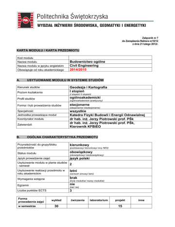 Załącznik nr 7 do Zarządzenia Rektora nr10/12 z dnia 21 lutego 2012r. KARTA MODUŁU / KARTA PRZEDMIOTU Kod modułu Nazwa modułu Nazwa modułu w języku angielskim Obowiązuje od roku akademickiego A. Budownictwo ogólne Civil Engineering 2014/2015 USYTUOWANIE MODUŁU W SYSTEMIE STUDIÓW Kierunek studiów Poziom kształcenia Geodezja i Kartografia I stopień Profil studiów ogólnoakademicki Forma i tryb prowadzenia studiów stacjonarne Specjalność Jednostka prowadząca moduł Koordynator modułu wszystkie Katedra Fizyki Budowli i Energii Odnawialnej dr hab. inż. Jerzy Piotrowski prof. PŚk dr hab. inż. Jerzy Piotrowski prof. PŚk, Kierownik KFBiEO (I stopień/ II stopień) (ogólnoakademicki /praktyczny) Zatwierdził: B. (stacjonarne/ niestacjonarne) OGÓLNA CHARAKTERYSTYKA PRZEDMIOTU Przynależność do grupy/bloku przedmiotów kierunkowy Status modułu obowiązkowy Język prowadzenia zajęć język polski (podstawowy/ kierunkowy/ inny HES) (obowiązkowy/ nieobowiązkowy) Usytuowanie modułu w planie studiów 2 - semestr Usytuowanie realizacji przedmiotu w roku akademickim letni Wymagania wstępne brak Egzamin nie Liczba punktów ECTS 3 Forma prowadzenia zajęć w semestrze (semestr zimowy/ letni) (kody modułów/ nazwy modułów) (tak/ nie) wykład 30 ćwiczenia laboratorium projekt 15 inne C. EFEKTY KSZTAŁCENIA I METODY SPRAWDZANIA EFEKTÓW KSZTAŁCENIA Cel modułu Celem przedmiotu jest zapoznanie studentów z rodzajami elementów budowlanych takich jak dachy, stropy, ściany, schody i fundamenty w zakresie pojęć podstawowych, rodzajów oraz zadań. Omówione zostaną układy konstrukcyjne (sztywność budynku), przegrody budowlane (warunki wytrzymałościowe, izolacyjne i przeciwpożarowe), przewody wentylacyjne i spalinowe, konstrukcje murowe, żelbetowe, stalowe i drewniane (charakterystyka, warunki stosowania) oraz warunki techniczne użytkowania budynków. (3-4 linijki) Symbol efektu Efekty kształcenia Forma prowadzenia zajęć (w/ć/l/p/inne) Zna podstawowe elementy konstrukcyjne budynków, w/p takie jak fundamenty, ściany, schody, stropy, dachy oraz zasady ich tyczenia i pomiarów kontrolnych. W_01 W_02 Posiada wiedzę na temat stosowanych zabezpieczeń izolacyjnych, materiałów wykończeniowych, stolarki okiennej i drzwiowej. Zna rodzaje instalacji, sposoby ich prowadzenia w budynku i przyłączenia do sieci. w/p w/p W_03 W_04 Posiada wiedzę w zakresie występujących w/p przemieszczeń i odkształceń w trakcie eksploatacji obiektów oraz prowadzenia prac inwentaryzacyjnych wykonanych robót budowlanych. Posiada wiedzę dotyczącą zasad projektowania w/p budynków mieszkalnych i użyteczności publicznej. odniesienie do odniesienie do efektów efektów kierunkowych obszarowych GiK_W01 GiK_W12 GiK_W21 GiK_W26 GiK_W01 GiK_W26 GiK_W01 GiK_W12 GiK_W26 GiK_W27 GiK_W01 GiK_W12 GiK_W21 GiK_W27 GiK_W16 GiK_W17 GiK_W26 p GiK_U06 GiK_U18 GiK_U23 GiK_U25 GiK_U26 Potrafi samodzielnie pracować nad zadaniem p projektowym, posiada umiejętność dokształcenia się i uzupełnienia wiedzy. GiK_K01 GiK_K02 Ma świadomość konieczności rzetelnego wykonania p zadania projektowego. Potrafi współdziałać w grupie, formułuje p odpowiednie wnioski do zadania projektowego. GiK_K03 T1A_W03 T1A_W04 T1A_W05 T1A_W06 T1A_W07 T1A_U02 T1A_U05 T1A_U07 T1A_U09 T1A_U15 T1A_U16 T1A_K01 T1A_K02 T1A_K05 T1A_K07 T1A_K02 GiK_K07 T1A_K03 W_05 Potrafi zaprojektować budynek mieszkalny wraz z zagospodarowaniem terenu oraz dobrać odpowiednie rozwiązania materiałowo – konstrukcyjne. U_01 K_01 K_02 K_03 T1A_W01 T1A_W03 T1A_W06 T1A_W07 T1A_W01 T1A_W06 T1A_W07 T1A_W01 T1A_W03 T1A_W06 T1A_W07 T1A_W01 T1A_W03 T1A_W07 Treści kształcenia: 1. Treści kształcenia w zakresie wykładu Nr wykładu 1 2 3 4 5 6 7 8 9 10 11 12 13 14 15 Treści kształcenia Wiadomości wstępne. Wprowadzenie do budownictwa, definicje wybranych określeń: budownictwo, budowla, budynek itp. Wymagania podstawowe stawiane budowlom. Układy konstrukcyjne budowli. Konstrukcje budowlane. Charakterystyka ogólna konstrukcji murowych, drewnianych, stalowych, żelbetowych i sprężonych. Roboty ziemne i wykopy, przyłącza. Tyczenie budynków, sposoby posadowienia, rodzaje fundamentów. Ściany piwnic, rozwiązania materiałowe i konstrukcyjne. Instalacje poziome i pionowe przyziemia budynków. Ściany nadziemne budynków. Materiały i technologie budowy ścian. Pilastry, ryzality, przypory, attyki, cokoły. Nadproża. Mostki termiczne. Technologie termoizolacji ścian zewnętrznych. Trzony kominowe. Przewody dymowe, spalinowe i wentylacyjne. Stopy wieńce i kotwienie stropów. Balkony, konstrukcja i zabezpieczenie termoizolacyjne. Podział i zasady projektowania schodów. Konstrukcje schodów. Balustrady. Stropodach pełny, odpowietrzany, wentylowany. Zasady projektowania stropodachów. Tarasy. Stropodach odwrócony. Zielony dach. Izolacje przeciwwodne balkonów i tarasów. Dachy drewniane. Dach jętkowy bez stolcowy i stolcowy, płatwiowokleszczowy, wieszarowy. Ścianki kolankowe, kotwienie dachów. Wiązary kratowe. Konstrukcje dachowe żelbetowe i stalowe. Ścianki działowe gipsowe, murowane i drewniane. Zasady wykonywania i połączenia ze ścianami konstrukcyjnymi, sytuowania ścianek działowych na stropie. Sufity podwieszane. Pokrycia dachowe. Odwodnienie dachów, rynny, rury spustowe. Obróbki blacharskie. Pokrycia stropodachów. Wykończenie tarasów i balkonów. Rodzaje okien i stolarki drzwiowej. Rodzaje podłóg i posadzek. Izolacje cieplne. Wymagania w zakresie ochrony cieplnej budynków. Izolacje przeciwwodne i przeciwwilgociowe. Izolacje akustyczne. Zabezpieczenia przeciwpożarowe. Elementy wykończeniowe. Tynki. Rodzaje tynków. Okładziny wewnętrzne i zewnętrzne. Malowanie. Rodzaje instalacji, sposoby prowadzenia w budynku. Wyprowadzenia instalacji nad dach. Przyłącza. Elementy małej architektury. Przemieszczenia i odkształcenia elementów konstrukcyjnych i wykończeniowych, rodzaje uszkodzeń w trakcie w