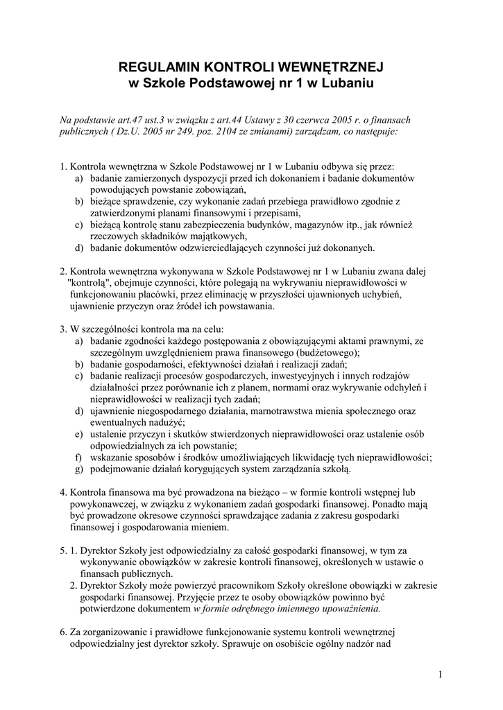 REGULAMIN KONTROLI WEWNĘTRZNEJ w Szkole Podstawowej nr 1 w Lubaniu Na podstawie art.47 ust.3 w związku z art.44 Ustawy z 30 czerwca 2005 r. o finansach publicznych ( Dz.U. 2005 nr 249. poz. 2104 ze zmianami) zarządzam, co następuje: 1. Kontrola wewnętrzna w Szkole Podstawowej nr 1 w Lubaniu odbywa się przez: a) badanie zamierzonych dyspozycji przed ich dokonaniem i badanie dokumentów powodujących powstanie zobowiązań, b) bieżące sprawdzenie, czy wykonanie zadań przebiega prawidłowo zgodnie z zatwierdzonymi planami finansowymi i przepisami, c) bieżącą kontrolę stanu zabezpieczenia budynków, magazynów itp., jak również rzeczowych składników majątkowych, d) badanie dokumentów odzwierciedlających czynności już dokonanych. 2. Kontrola wewnętrzna wykonywana w Szkole Podstawowej nr 1 w Lubaniu zwana dalej "kontrolą", obejmuje czynności, które polegają na wykrywaniu nieprawidłowości w funkcjonowaniu placówki, przez eliminację w przyszłości ujawnionych uchybień, ujawnienie przyczyn oraz źródeł ich powstawania. 3. W szczególności kontrola ma na celu: a) badanie zgodności każdego postępowania z obowiązującymi aktami prawnymi, ze szczególnym uwzględnieniem prawa finansowego (budżetowego); b) badanie gospodarności, efektywności działań i realizacji zadań; c) badanie realizacji procesów gospodarczych, inwestycyjnych i innych rodzajów działalności przez porównanie ich z planem, normami oraz wykrywanie odchyleń i nieprawidłowości w realizacji tych zadań; d) ujawnienie niegospodarnego działania, marnotrawstwa mienia społecznego oraz ewentualnych nadużyć; e) ustalenie przyczyn i skutków stwierdzonych nieprawidłowości oraz ustalenie osób odpowiedzialnych za ich powstanie; f) wskazanie sposobów i środków umożliwiających likwidację tych nieprawidłowości; g) podejmowanie działań korygujących system zarządzania szkołą. 4. Kontrola finansowa ma być prowadzona na bieżąco – w formie kontroli wstępnej lub powykonawczej, w związku z wykonaniem zadań gospodarki finansowej. Ponadto mają być prowadzone okresowe czynności sprawdzające zadania z zakresu gospodarki finansowej i gospodarowania mieniem. 5. 1. Dyrektor Szkoły jest odpowiedzialny za całość gospodarki finansowej, w tym za wykonywanie obowiązków w zakresie kontroli finansowej, określonych w ustawie o finansach publicznych. 2. Dyrektor Szkoły może powierzyć pracownikom Szkoły określone obowiązki w zakresie gospodarki finansowej. Przyjęcie przez te osoby obowiązków powinno być potwierdzone dokumentem w formie odrębnego imiennego upoważnienia. 6. Za zorganizowanie i prawidłowe funkcjonowanie systemu kontroli wewnętrznej odpowiedzialny jest dyrektor szkoły. Sprawuje on osobiście ogólny nadzór nad 1 skutecznością działania tego systemu, jak również prawidłowością wykorzystania sygnałów z wewnętrznej i zewnętrznej kontroli. Odpowiedzialny jest również za należyte wykorzystanie wyników kontroli. KRYTERIA, PODSTAWOWE ZASADY I FUNKCJE KONTROLI WEWNĘTRZNEJ 7. Przeprowadzane badania i analizy kontrolne powinny oceniać kontrolowaną działalność z punktu widzenia następujących kryteriów: a) sprawności organizacji pracy – sprawność, prawidłowość, efektywność przyjętych rozwiązań organizacyjnych i kierunków działania, a także doboru środków w celu wykonania założonych zadań; b) celowości – zapewnia eliminację niekorzystnych działań zbędnych z punktu widzenia interesów jednostki, realizuje się przez to sprawdzenie, czy środki finansowe zostały wydatkowane zgodnie z ustalonym przeznaczeniem, określonym w planie finansowym, c) gospodarności – ocena kontrolowanych procesów gospodarczych i finansowych z punktu widzenia racjonalności, efektywności i celowości podejmowanych decyzji, następnie ich realizacji; d) rzetelności – zgodność dokumentacji ze stanem faktycznym. e) legalności – zgodność z obowiązującymi przepisami ustawowymi i normami, zawartymi w obowiązujących w Szkole Podstawowej nr 1 w Lubaniu przepisach wewnętrznych. 8. Przy uwzględnianiu kryteriów, o których mowa w pkt. 1, kontrola winna umożliwić realizację poniższych funkcji; a) profilaktyczna – polega za zapobieganiu powstawania niekorzystnych zjawisk, b) instruktażowa – dostarczanie kontrolowanemu informacji o obowiązujących normach, ich interpretacji i zasad stosowania i pobudzanie do działań mających na celu unikanie w przyszłości błędów i nieprawidłowości, c) kreatywna – działania w kierunku unikania w przyszłości błędów i nieprawidłowości. 9. Dla zapewnienia obiektywizmu funkcjonowania kontroli wewnętrznej należy: a) powierzać obowiązki wykonywania kontroli (poza samokontrolą) pracownikom odpowiedzialnym za wykonanie kontrolowanych przez nich procesów i zadań; b) powierzać bezpośrednią odpowiedzialność za składniki majątkowe (magazynowanie, przyjmowanie, wydawanie) osobom uprawnionym do wydawania dyspozycji w zakresie gospodarowania nimi. 10. Dla zapewnienia skuteczności funkcjonowania kontroli wewnętrznej należy: a) w zakresach czynności pracowników, wykonujących czynności kontrolne jednoznacznie i dokładnie ustalić uprawnienia, obowiązki i odpowiedzialność w tym zakresie b) zapoznać pracowników, wykonujących czynności kontrolne z obowiązującymi przepisami, instrukcjami i regulaminami wewnętrznymi; c) stosować zasadę powierzania pieczy nad składnikami majątkowymi ściśle określonym pracownikom, za odebraniem oświadczenia o przyjęciu odpowiedzialności materialnej za powierzone składki majątkowe, przy równoczesnym zapewnieniu zabezpieczenia tych składników przed włamaniem czy kradzieżą oraz optymalnych warunków właściwego przechowywania i dozoru; 2 d) ściśle przestrzegać zasad dokumentowania wszystkich operacji i zdarzeń, ewidencji aktywów i dokumentów, obiegu i kontroli dokumentów. ORGANIZACJA I FORMY KONTROLI WEWNĘ