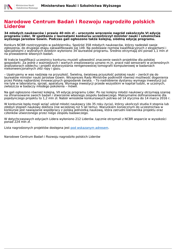 Ministerstwo Nauki i Szkolnictwa Wyższego Narodowe Centrum Badań i Rozwoju nagrodziło polskich Liderów 34 młodych naukowców i prawie 40 mln zł – uroczyste wręczenie nagród zakończyło VI edycję programu Lider. W spotkaniu z laureatami konkursu uczestniczył minister nauki i szkolnictwa wyższego Jarosław Gowin. Podczas gali ogłoszono także kolejną, siódmą edycję programu. Konkurs NCBR rozstrzygnięto w październiku. Spośród 358 młodych naukowców, którzy nadesłali swoje zgłoszenia, do drugiego etapu zakwalifikowało się 149. Na podstawie rozmów kwalifikacyjnych z ekspertami i specjalistami z wybranych dziedzin wyłoniono 34 laureatów programu. Średnio otrzymają oni ponad 1,1 mln zł na prowadzenie własnych badań. W trakcie kwalifikacji uczestnicy konkursu musieli udowodnić znaczenie swoich projektów dla polskiej gospodarki. Za jedne z ważniejszych i wartych zrealizowania uznano m.in. prace nad sensorami w przenośnych analizatorach oddechu i projekt wykorzystania rentgenowskiej tomografii komputerowej w badaniach niekonwencjonalnych złóż ropy i gazu. – Upatrujemy w was nadzieję na przyszłość. Świetną, światową przyszłość polskiej nauki – zwrócił się do laureatów minister nauki Jarosław Gowin. Wiceprezes Rady Ministrów podkreślił również możliwość dogonienia przez Polskę najbardziej innowacyjnych gospodarek świata. – To nadrobienie dystansu wymaga inwestycji już nie tyle w laboratoria, sprzęt, aparaturę. Wymaga inwestycji przede wszystkim w kapitał ludzki, w uczonych, zwłaszcza w badaczy młodego pokolenia – mówił. Na gali ogłoszono również kolejną, VII edycję programu Lider. Po raz kolejny młodzi naukowcy otrzymają szansę na sfinansowanie swoich badań i stworzenie własnego zespołu badawczego. Maksymalne dofinansowanie dla pojedynczego projektu to 1,2 mln zł. Nabór wniosków konkursowych potrwa od 14 stycznia do 14 marca 2016 r. W konkursie będą mogli wziąć udział młodzi naukowcy (do 35 roku życia), którzy ukończyli studia II stopnia lub zdobyli stopień naukowy doktora (nie wcześniej niż 5 lat temu). Warunkiem koniecznym do uczestnictwa w konkursie jest nawiązanie współpracy z polską jednostką naukową, która zatrudni kierownika projektu oraz członków utworzonego przez niego zespołu badawczego. W dotychczasowych edycjach Lidera wyłoniono 212 Liderów. Łącznie otrzymali z NCBR wsparcie w wysokości ponad 224 mln zł. Lista nagrodzonych projektów dostępna jest pod wskazanym adresem. Narodowe Centrum Badań i Rozwoju nagrodziło polskich Liderów Powered by TCPDF (www.tcpdf.org)