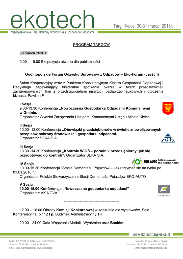 Targi Kielce, 30-31 marca 2016r. PROGRAM TARGÓW 30 marca 2016 r. 9.00 – 18.00 Ekspozycja otwarta dla publiczności Ogólnopolskie Forum Odzysku Surowców z Odpadów – Eko-Forum (część I) Salon Kooperacyjny wraz z Punktem Konsultacyjnym Klastra Gospodarki Odpadowej i Recyklingu zapewniający bilateralne spotkania twarzą w twarz przedstawicieli zainteresowanych firm z przedstawicielami instytucji badawczo-naukowych i otoczenia biznesu. Pawilon F I Sesja 9.30-13.30 Konferencja „Nowoczesna Gospodarka Odpadami Komunalnymi w Gminie. Organizator Wydział Zarządzania Usługami Komunalnymi Urzędu Miasta Kielce. II Sesja 10.00- 13.00 Konferencja „Obowiązki przedsiębiorców w świetle znowelizowanych przepisów ochrony środowiska i gospodarki odpadami. Organizator SEKA S.A. III Sesja 13.30 -14.30 Konferencja „Kontrole WIOŚ – poradnik przedsiębiorcy: jak się przygotować do kontroli”. Organizator SEKA S.A. IV Sesja 10.00-15.30 Konferencja “Stacje Demontażu Pojazdów – Jak utrzymać się na rynku po 01.01.2016 r.” Organizator Polskie Stowarzyszenie Stacji Demontażu Pojazdów EKO-AUTO V Sesja 10.00-15.00 Konferencja „Nowoczesna gospodarka odpadami” Organizator: AK NOVA --------------------------------------------12.00 – 16.00 Obrady Komisji Konkursowej w konkursie dla wystawców. Sala Konferencyjna p.112 I p. Budynek Administracyjny TK 20.00 - 24.00 Gala Wręczenia Medali i Wyróżnień oraz Bankiet TARGI KIELCE SA, ul. Zakładowa 1, 25-672 Kielce tel. +48 41 36 51 222; fax +48 41 34 56 261 e-mail: [email protected], www.targikielce.pl Menedżer Projektu - Marcin Musiał tel. +48 41 365 12 19; fax +48 41 365 13 38 e-mail: [email protected] Targi Kielce, 30-31 marca 2016r. 31 marca 2016 r. 9.00 - 17.00 Ekspozycja otwarta dla publiczności Ogólnopolskie Forum Odzysku Surowców z Odpadów – Eko-Forum (część II) Salon Kooperacyjny wraz z Punktem Konsultacyjnym Klastra Gospodarki Odpadowej i Recyklingu zapewniający bilateralne spotkania twarzą w twarz przedstawicieli zainteresowanych firm z przedstawicielami instytucji badawczo-naukowych i otoczenia biznesu. Pawilon F VI Sesja 10.00-15.15 Konferencja “Zużyty sprzęt elektryczny i elektroniczny wg najnowszych przepisów – zmiany wchodzące w życie 01.01.2016 r. Organizator: EKOLOG Sp. z o.o. Poznań VII Sesja 12.00-16.00 Konferencja „Gospodarka o obiegu zamkniętym” Organizator Centrum Kooperacji Recyklingu – not for profit system Sp. z o.o. Koordynator Klastra Gospodarki Odpadowej i Recyklingu. TARGI KIELCE SA, ul. Zakładowa 1, 25-672 Kielce tel. +48 41 36 51 222; fax +48 41 34 56 261 e-mail: [email protected], www.targikielce.pl Menedżer Projektu - Marcin Musiał tel. +48 41 365 12 19; fax +48 41 365 13 38 e-mail: [email protected]