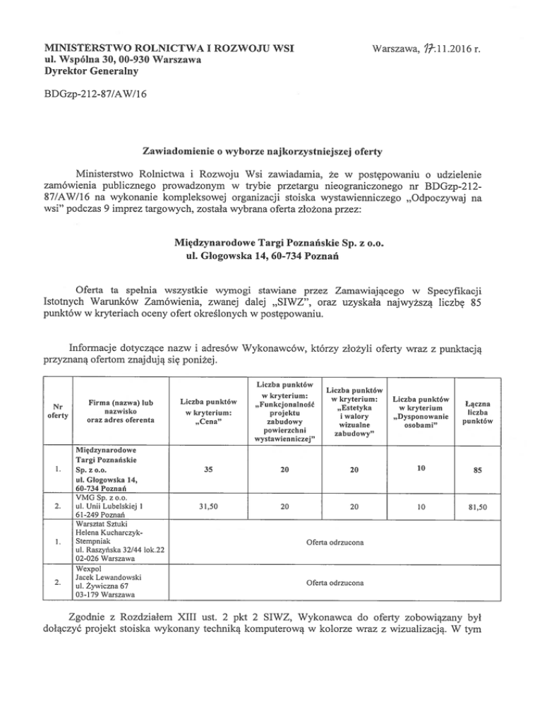 MINISTERSTWO ROLNICTWA I ROZWOJU WSI ul. Wspólna 30, OO-930 Warszawa Dyrektor Generalny 9i 1.2016 r. Warszawa, BDGzp-212-87/AW/1 6 Zawiadomienie o wyborze najkorzystniejszej oferty Ministerstwo Rolnictwa i Rozwoju Wsi zawiadamia, że w postępowaniu o udzielenie zamówienia publicznego prowadzonym w trybie przetargu nieograniczonego nr BDGzp-2 1287/AW/16 na wykonanie kompleksowej organizacji stoiska wystawienniczego „Odpoczywaj na wsi” podczas 9 imprez targowych, została wybrana oferta złożona przez: Międzynarodowe Targi Poznańskie Sp. z o.o. uJ. Głogowska 14, 60-734 Poznań Oferta ta spełnia wszystkie wymogi stawiane przez Zamawiającego w Specyfikacji Istotnych Warunków Zamówienia, zwanej dalej „SIWZ”, oraz uzyskała najwyższą liczbę 85 punktów w kryteriach oceny ofert określonych w postępowaniu. Informacje dotyczące nazw i adresów Wykonawców, którzy złożyli oferty wraz z punktacją przyznaną ofertom znajdują się poniżej. Liczba punktów Nr oferty Firma (nazwa) lub nazwisko oraz adres oferenta Międzynarodowe Targi Poznańskie Sp.zo.o. Liczba punktów w kryterium: „Estetyka i walory wizualne zabudowy” Liczba punktów w kryterium „Dysponowanie osobami” Ljczua liczba punktów w kryterium: „Cena” w kryterium: „Funkcjonalność projektu zabudowy powierzchni wystawienniczej” 35 20 20 10 85 3 1,50 20 20 10 81,50 Liczba punktów ul. Głogowska 14, 60-734 Poznań VMG Sp. z o.o. 2. 2. ul. Unii Lubelskiej 1 61-249 Poznań Warsztat Sztuki Helena KucharczykStempniak ul. Raszyńska 32/44 lok.22 02-026 Warszawa Wexpol Jacek Lewandowski ul. Żywiczna 67 03-179 Warszawa Oferta odrzucona Oferta odrzucona Zgodnie z Rozdziałem XIII ust. 2 pkt 2 SIWZ, Wykonawca do oferty zobowiązany był dołączyć projekt stoiska wykonany techniką komputerową w kolorze wraz z wizualizacją. W tym samym rozdziale Zamawiający określił, iż w przy padku, gdy Wykonawca nie zamieści na projekcie w danej przestrzeni/danym zapleczu jakiegoko lwiek z wymaganych w SIWZ elementów wyposażenia tej przestrzeni/tego zaplecza, to jego oferta zostanie odrzucona jako niezgodna z treścią SIWZ. W ofercie Wykonawcy Warsztat Sztuki Hele na Kucharczyk-Stempniak, w projekcie zabudowy stoiska, w przypadku przestrzeni do spotk ań, Wykonawca zamieścił 3 stołki, natomiast Zamawiający wymagał zamieszczenia na proje kcie min. 4 stołków w danej przestrzeni. W przestrzeni do ekspozycji Wykonawca nie zami eścił 2 płotków oraz zamieścił tylko 3 stojaki, natomiast Zamawiający wymagał zamieszczenia w danej przestrzeni min. 4 stojaków. W przypadku Wykonawcy Wexpol Jacek Lew andowski, Wykonawca załączył do oferty projekt zabudowy stoiska (rzut z góry) o wym iarach 13 cm x 16 cm, wobec czego wymiary załączonego projektu stoiska w znacznym stopn iu przekroczyły dopuszczalny próg tolerancji. Wykonawca miał przedstawić projekt stois ka o wymiarach 6 m x 5 m, przy czym rzut stois ka z góry powinien być wykonany w skali 1:25. Jedn ocześnie, Zamawiający dopuścił procentowy próg tolerancji (+/-) 5% od podanych wymiarów projektu stoiska. Zatem przy wymiarach stois ka 6 m x 5 m, załączony do oferty projekt stois ka powinien mieć wymiary 24 cm x 20 cm, a dopuszczalny próg odchylenia to (+/) 1,2 cm i (+/) 1 cm. Ponadto w załączonym do ofert y projekcie zabudowy stoiska w przypadku prze strzeni do spotkań Wykonawca nie zamieścił w projekcie 4 stoików, a w przypadku przestrze ni do ekspozycji zamieścił 1 płotek, natomias t Zamawiający wymagał zamieszczenia w dane j przestrzeni 2 płotków. Ponadto w przestrze ni do organizacji pokazów produkcji wyrobów rękodzielniczych Wykonawca nie zamieścił 1 ławy/ławki. W związku z powyższym oferty ww. Wyk onawców zostały odrzucone jako niezgodne z treścią SIWZ.