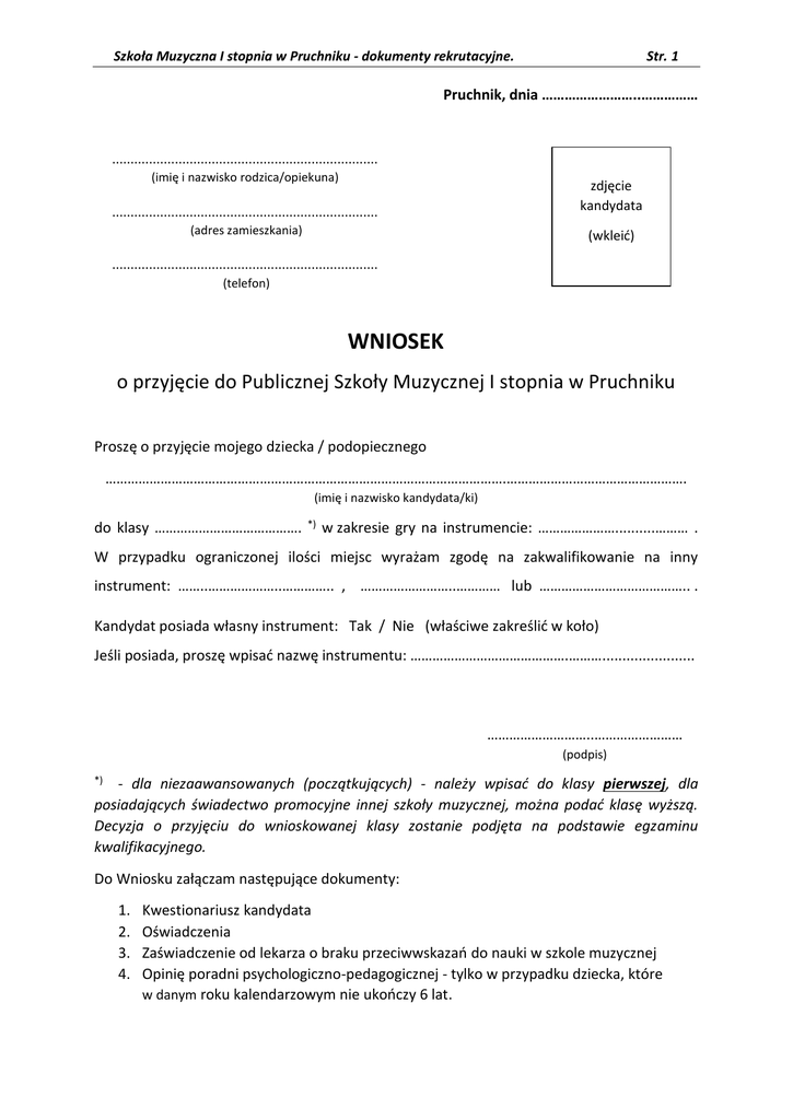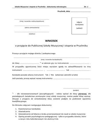 Szkoła Muzyczna I stopnia w Pruchniku - dokumenty rekrutacyjne. Str. 1 Pruchnik, dnia ……………………..…………… ........................................................................ (imię i nazwisko rodzica/opiekuna) ........................................................................ zdjęcie kandydata (adres zamieszkania) (wkleić) ........................................................................ (telefon) WNIOSEK o przyjęcie do Publicznej Szkoły Muzycznej I stopnia w Pruchniku Proszę o przyjęcie mojego dziecka / podopiecznego ……………………………………………………………………………………………….…………………………………………. (imię i nazwisko kandydata/ki) do klasy …………………………………. *) w zakresie gry na instrumencie: …………………..........……… . W przypadku ograniczonej ilości miejsc wyrażam zgodę na zakwalifikowanie na inny instrument: ……..………………..………….. , ……………………..………… lub ………………………………….. . Kandydat posiada własny instrument: Tak / Nie (właściwe zakreślić w koło) Jeśli posiada, proszę wpisać nazwę instrumentu: …………………………………….………....................... ………………………..…………………… (podpis) *) - dla niezaawansowanych (początkujących) - należy wpisać do klasy pierwszej, dla posiadających świadectwo promocyjne innej szkoły muzycznej, można podać klasę wyższą. Decyzja o przyjęciu do wnioskowanej klasy zostanie podjęta na podstawie egzaminu kwalifikacyjnego. Do Wniosku załączam następujące dokumenty: 1. 2. 3. 4. Kwestionariusz kandydata Oświadczenia Zaświadczenie od lekarza o braku przeciwwskazań do nauki w szkole muzycznej Opinię poradni psychologiczno-pedagogicznej - tylko w przypadku dziecka, które w danym roku kalendarzowym nie ukończy 6 lat. Szkoła Muzyczna I stopnia w Pruchniku - dokumenty rekrutacyjne. Str. 2 KWESTIONARIUSZ OSOBOWY KANDYDATA - załącznik nr 1 DANE OSOBOWE KANDYDATA Imiona …………………………………………………………. Nazwisko ………………………………………………………………….. Data urodzenia ……………………………………………………..……….. Nr PESEL ..…………………………………………….… Miejsce urodzenia ………………….…………....……………...…………. woj. ………………..……………………..……..….…… Adres zamieszkania …………………………………………………….…………..…………………………………………………………. ………………………………………………………………………………………………………………………………………..…….. DANE OSOBOWE RODZICÓW/PRAWNYCH OPIEKUNÓW OJCIEC/PRAWNY OPIEKUN Imię ………………………………………………….……………. Nazwisko ………………….….…………………………………………. Adres zamieszkania ………………………………………….…….…………………………………………………………………………. Telefon ………………………………………… Email ………..……………………………………………………………….……………. MATKA/PRAWNY OPIEKUN Imię ………………………………………………….……………. Nazwisko ………………….….…………………………………………. Adres zamieszkania ………………………………………….…….…………………………………………………………………………. Telefon ………………………………………… Email ………..……………………………………………………………….……………. INFORMACJE DLA KANDYDATÓW 1. O przydatności kandydata do nauki gry na danym instrumencie orzeka komisja kwalifikacyjna. W przypadku dziecka, które w roku kalendarzowym kończy co najmniej 5 lat niezbędna jest także opinia poradni psychologiczno-pedagogicznej o psychofizycznej dojrzałości dziecka do podjęcia nauki szkolnej. 2. Warunkiem zakwalifikowania kandydata do nauki gry na instrumencie dętym jest przedstawienie zaświadczenia lekarskiego o braku przeciwwskazań do gry na instrumencie dętym. 3. Do kwestionariusza dołączyć należy: a. Wniosek b. Zdjęcie (legitymacyjne - 1 sztuka) c. Zaświadczenie od lekarza o braku przeciwwskazań do nauki w szkole muzycznej (Art. 20n. ust. 2 ustawy z dnia 7 września 1991 r. o systemie oświaty - Dz. U. z 2004 r. Nr 256, poz. 2572 ze zm.) d. Opinię poradni psychologiczno-pedagogicznej - tylko w przypadku dziecka, które w danym roku kalendarzowym nie ukończy 6 lat. e. Na życzenie rodzica – inne dokumenty wymienione w art. 20t, ust.2 ustawy o systemie oświaty. Szkoła Muzyczna I stopnia w Pruchniku - dokumenty rekrutacyjne. Str. 3 OŚWIADCZENIA - załącznik nr 2 1. Oświadczam, że w przypadku przyjęcia mojego dziecka do Publicznej Szkoły Muzycznej I stopnia w Pruchniku będę aktywnie współpracować ze szkołą w procesie wychowawczym i dydaktycznym, uczestniczyć w wywiadówkach i spotkaniach. 2. Zadbam, aby moje dziecko ściśle przestrzegało obowiązujących w szkole uregulowań prawnych, zobowiązując się do finansowej odpowiedzialności za wszelkie straty materialne wyrządzone przez moje dziecko w trakcie nauki w szkole. 3. Wyrażam zgodę na przetwarzanie danych zawartych w Kwestionariuszu Osobowym dla celów administracyjnych oraz wyrażam zgodę / nie wyrażam zgody (właściwe zakreślić) na rozpowszechnianie wizerunku i osiągnięć mojego dziecka dla celów promocyjnych przez szkołę – na podstawie art. 23 ust. 1 pkt. 1 Ustawy z dnia 29 sierpnia 1997r. o ochronie danych osobowych (Dz. U. z 2