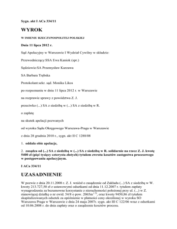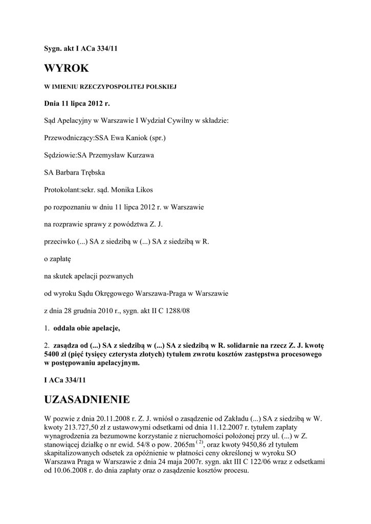 Sygn. akt I ACa 334/11 WYROK W IMIENIU RZECZYPOSPOLITEJ POLSKIEJ Dnia 11 lipca 2012 r. Sąd Apelacyjny w Warszawie I Wydział Cywilny w składzie: Przewodniczący:SSA Ewa Kaniok (spr.) Sędziowie:SA Przemysław Kurzawa SA Barbara Trębska Protokolant:sekr. sąd. Monika Likos po rozpoznaniu w dniu 11 lipca 2012 r. w Warszawie na rozprawie sprawy z powództwa Z. J. przeciwko (...) SA z siedzibą w (...) SA z siedzibą w R. o zapłatę na skutek apelacji pozwanych od wyroku Sądu Okręgowego Warszawa-Praga w Warszawie z dnia 28 grudnia 2010 r., sygn. akt II C 1288/08 1. oddala obie apelacje, 2. zasądza od (...) SA z siedzibą w (...) SA z siedzibą w R. solidarnie na rzecz Z. J. kwotę 5400 zł (pięć tysięcy czterysta złotych) tytułem zwrotu kosztów zastępstwa procesowego w postępowaniu apelacyjnym. I ACa 334/11 UZASADNIENIE W pozwie z dnia 20.11.2008 r. Z. J. wniósł o zasądzenie od Zakładu (...) SA z siedzibą w W. kwoty 213.727,50 zł z ustawowymi odsetkami od dnia 11.12.2007 r. tytułem zapłaty wynagrodzenia za bezumowne korzystanie z nieruchomości położonej przy ul. (...) w Z. stanowiącej działkę o nr ewid. 54/8 o pow. 2065m ( 2), oraz kwoty 9450,86 zł tytułem skapitalizowanych odsetek za opóźnienie w płatności ceny określonej w wyroku SO Warszawa Praga w Warszawie z dnia 24 maja 2007r. sygn. akt III C 122/06 wraz z odsetkami od 10.06.2008 r. do dnia zapłaty oraz o zasądzenie kosztów procesu. Pozwany wnosił o oddalenie powództwa. W toku procesu doszło do przekształceń podmiotowych po stronie pozwanej. Obecnie jest to (...) SA z siedzibą w R. (k. 374 i n.), który wszedł w prawa i obowiązki dotychczasowego pozwanego. Na wniosek stron Sąd wezwał do udziału w postępowaniu w trybie art. 194 § 3 k.p.c. w charakterze pozwanego (...) Spółka z o.o. w W., a po przekształceniach podmiotowych jego obowiązki przejął (...) SA z siedzibą w L. (k. 406). D. wnosił również o oddalenie powództwa. W toku procesu powód rozszerzył żądanie pozwu wnosząc o zasądzenie solidarnie od obydwu pozwanych kwoty 289.161,95 zł z ustawowymi odsetkami od dnia 11.12.2007 r. do dnia zapłaty tytułem wynagrodzenia za bezumowne korzystanie z nieruchomości (k. 198199). Wyrokiem z dnia 28.12.2010 r. Sąd Okręgowy Warszawa-Praga w Warszawie: - w punkcie 1. Zasądził od (...) SA z siedzibą w R. na rzecz Z. J. kwotę 9.450,86 zł wraz z ustawowymi odsetkami od dnia 20.11.2008 r. do dnia zapłaty; - w punkcie 2. Zasądził od (...) SA z siedzibą w R. oraz od (...) SA z siedzibą w L. solidarnie na rzecz Z. J. kwotę 208.582,09 zł z ustawowymi odsetkami od dnia 09.12.2008 r. do dnia zapłaty oraz od (...) SA z siedzibą w L. kwotę 13.390,60 zł z ustawowymi odsetkami od dnia 10.03.2009 r. do dnia zapłaty; - w punkcie 3. w pozostałej części powództwo oddalił; - w punkcie 4. Zasądził od (...) SA z siedzibą w R. oraz od (...) S.A. z siedzibą w L. solidarnie na rzecz Z. J. kwotę 16.816,00 zł tytułem zwrotu części kosztów procesu; - w punkcie 5. Nakazał pobrać od (...) SA z siedzibą w L. na rzecz Skarbu Państwa Sądu Okręgowego(...)w W. kwotę 2.139,40 zł tytułem zwrotu wydatków. W uzasadnieniu tego rozstrzygnięcia Sąd Okręgowy wskazał: Wyrokiem z dnia 24.05.2007 r. Sąd Okręgowy Warszawa Praga w W. w sprawie III C 122/06 zobowiązał Zakład (...) SA z siedzibą w W. do złożenia w terminie 14 dni od uprawomocnienia się orzeczenia oświadczenia woli o nabyciu od Z. J. nieruchomości stanowiącej działkę o nr ewid. 54/8 o powierzchni 2065m ( 2) położoną przy ul. (...) w Z., dla której Sąd Rejonowy dla Warszawy Mokotowa prowadzi księgę wieczystą nr KW (...) za cenę 180 700 zł (k.24). Wyrok ten uprawomocnił się w dniu 11.12.2007r, z dniem wydania przez Sąd Apelacyjny wyroku oddalającego apelację. Podstawą prawną zobowiązania do złożenia oświadczenia woli był art. 64 k.c. w zw. z art. 231 §2 k.c. z uwagi na usytuowanie na nieruchomości urządzeń energetycznych. Wyrok był zgodny z żądaniem pozwu, mimo to w dniu 10 czerwca 2008r. strony stawiły się do aktu notarialnego, w którym to akcie przedstawiciel Zakładu (...) oświadczył, iż nabywa przedmiotową nieruchomość od powoda a powód na to nabycie wyraża zgodę (k.36). Zapłata wskazanej w wyroku kwoty nastąpiła w dniu 10.06.2008r. Żądanie wynagrodzenia za bezumowne korzystanie z nieruchomości obejmuje okres od 01.08.1998 r. do 11.12.2007 r. W okresie od 01.08.1998 r. do 21.06.1999 r. powód był współwłaścicielem nieruchomości opisanej w pozwie (k. 141), z dniem 21 czerwca 1999r. zniesiono współwłasność i powód stał się właścicielem całej działki (k.39). Przedmiotowa nieruchomość stanowi działkę niezabudowaną położoną wg planu zagospodarowania przestrzennego z 2004r. na terenach zabudowy mieszkaniowej jednorodzinnej, na których dopuszcza się jedynie istnienie nieuciążliwych obiektów usługowych (k. 135 i n.). Również we wcześniejszych latach tereny te były przewidziane pod budownictwo mieszkaniowe jednorodzinne - strefa miasto - ogród (k.140, 144, k.209-211). W 1986 r. Urząd Miasta Stołecznego W. wydał decyzję o zatwierdzeniu planu realizacyjnego na budowę odcinka linii 110 KV EC Nr 4 K., Z., P. (k. 19-20). W uzasadnieniu decyzji zawarto sformułowanie: „ decyzja traci ważność, jeżeli inwestor nie uzyskał prawa do terenu lub jej utracił". Nie wykazano w niniejszej sprawie, aby pozwany uzyskał zezwolenie na zajęcie terenu pod linię od ówczesnych właścicieli przedmiotowej nieruchomości. Decyzją z 20.07.1987 r. Urząd Miasta (...) W. zezwolił na budowę w/w linii (k.21). W oparciu o tę decyzję wybudowano linię energetyczną 110 KV, stawiając na środku przedmiotowej nieruchomości słup energetyczny. Zgodnie z planem zagospodarowania przestrzennego w pasie 19 m od linii energetycznej 110 KV w każdą stronę obowiązuje zakaz lokalizowania zabudowy mieszkaniowej, dopuszcza się natomiast loka